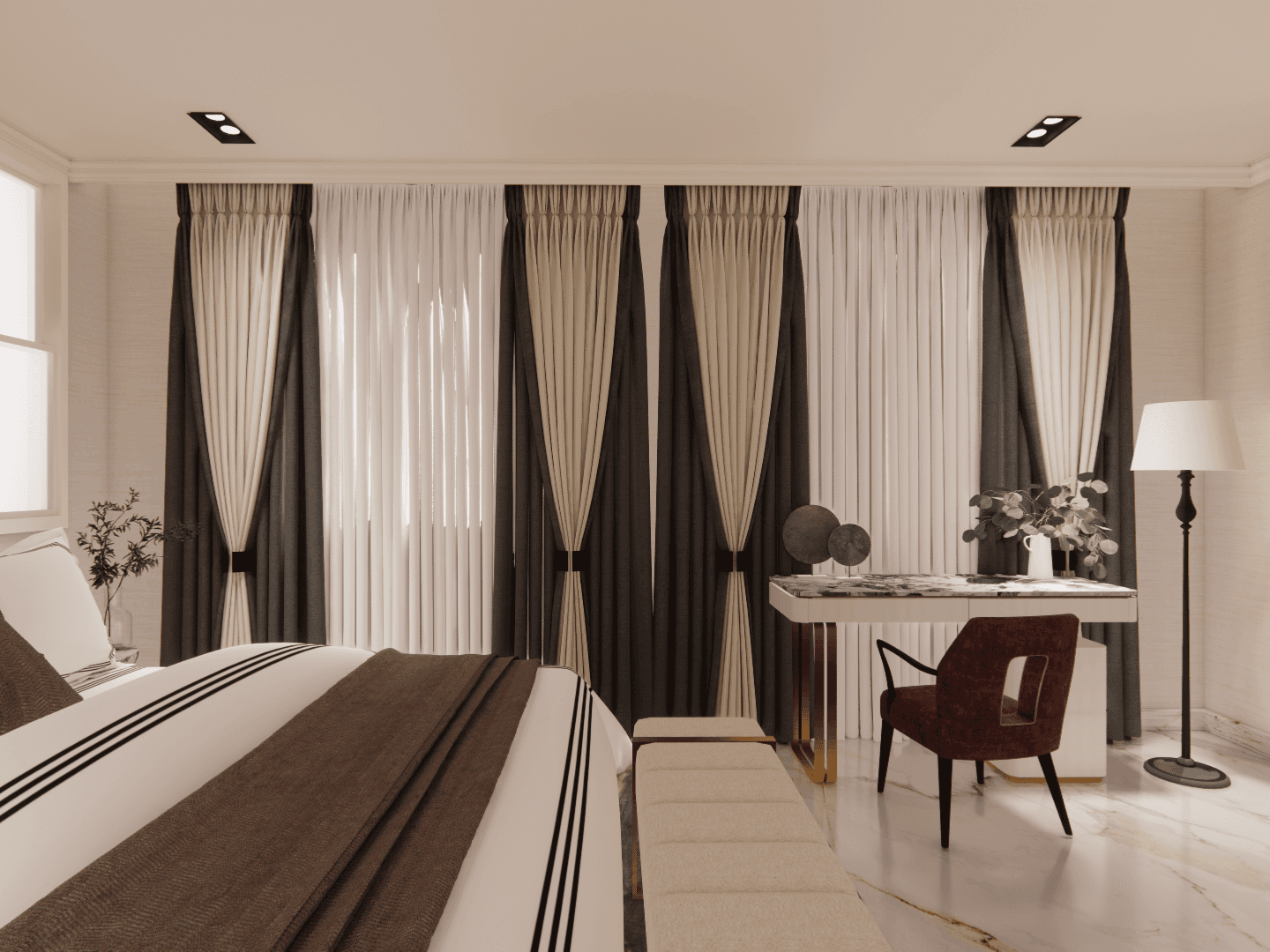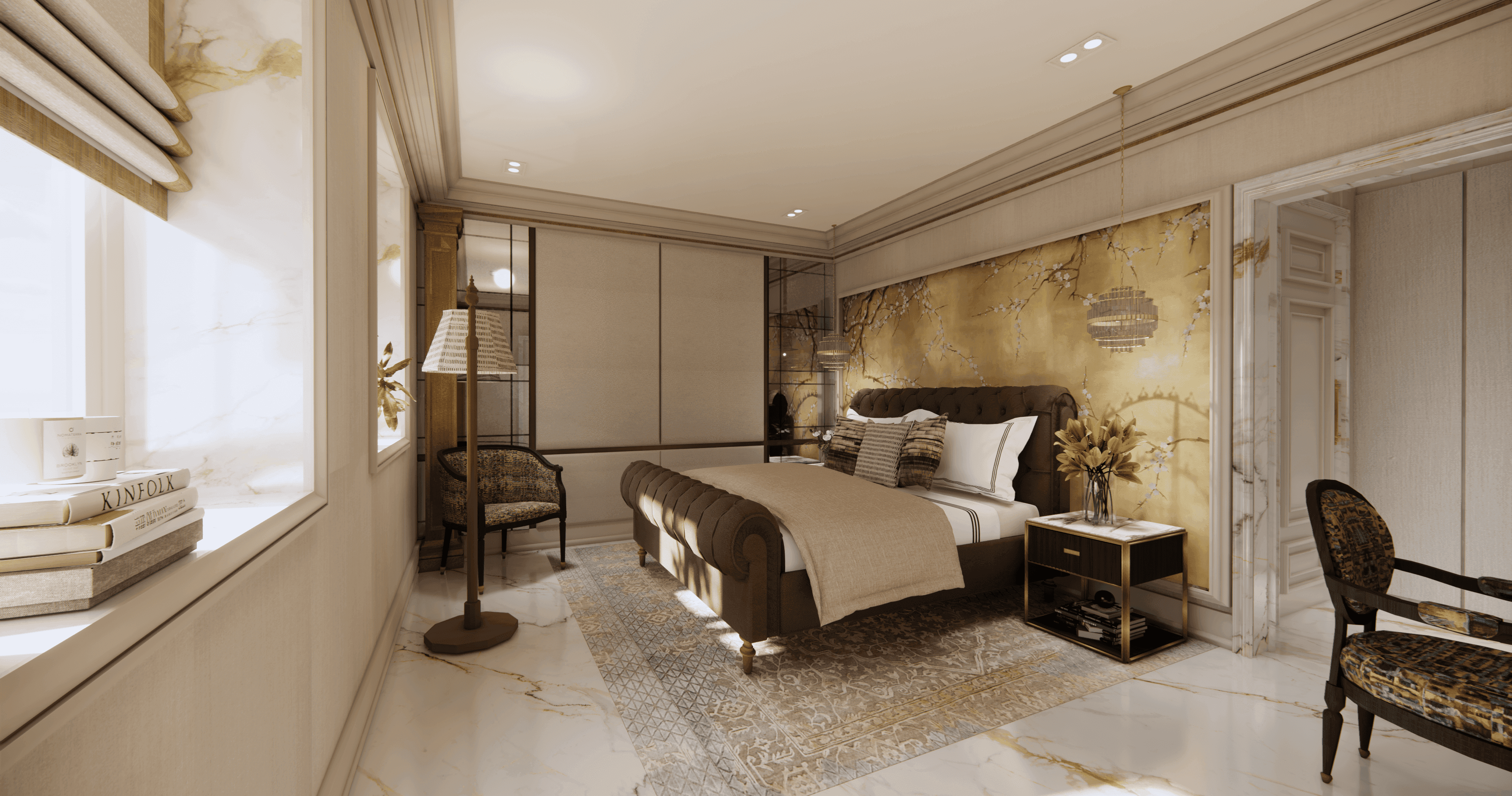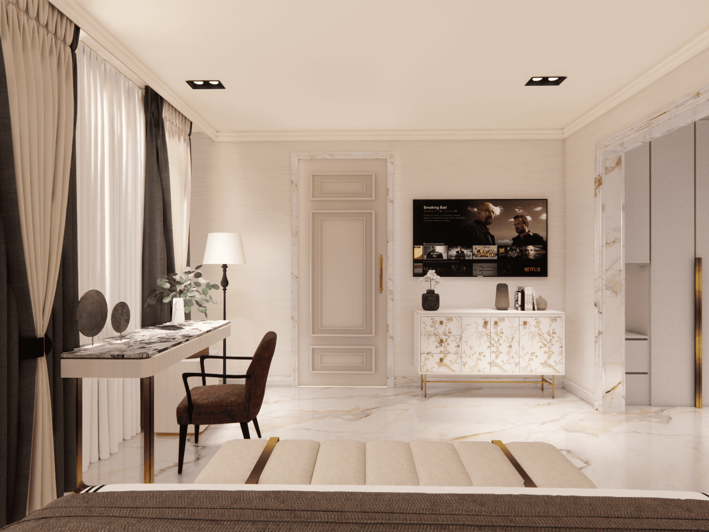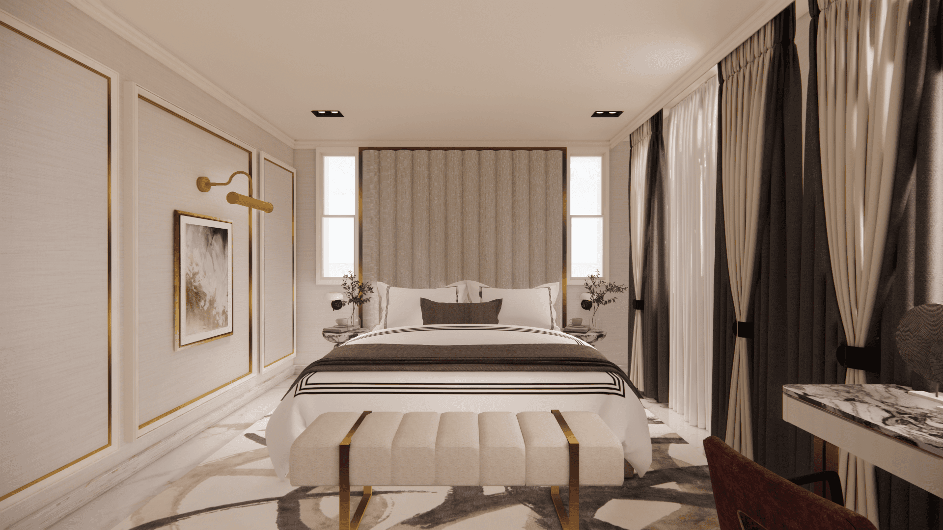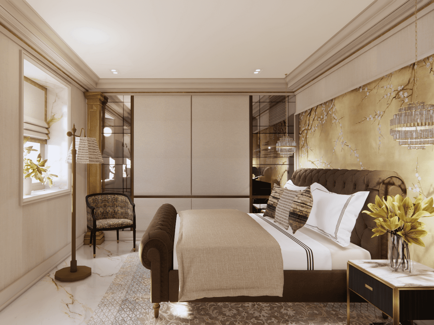 The guest bedroom is a perfect blend of modern luxury and classical charm. The floor is laid with elegant white marble, giving the room a sense of timeless beauty, while the classic wall paneling adds a traditional touch. The color palette, with warm hues of brown, brings a sense of coziness and calm to the space.