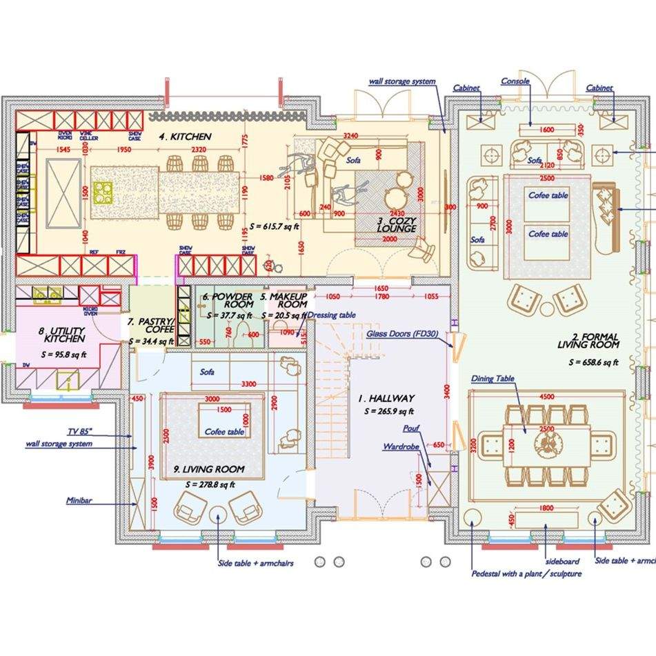 Key elements include custom-designed statement furniture, gold accents, and a harmonious balance of textures and patterns to create a sophisticated yet inviting ambiance. The project required meticulous attention to detail, from conceptual development to 3D visualizations and technical drawings, ensuring seamless execution of the design vision.
