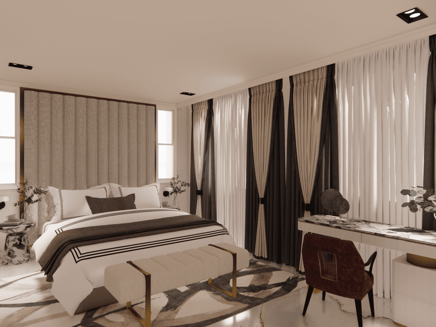 The real statement piece in the room is the fluted headboard, which stretches all the way up to the ceiling, creating a grand and dramatic focal point. Upholstered in a soft ivory fabric with a subtle sheen, it adds both texture and luxury, making the room feel inviting and sophisticated. It’s a space that balances comfort with a sense of elegance, perfect for guests to relax and unwind in style.