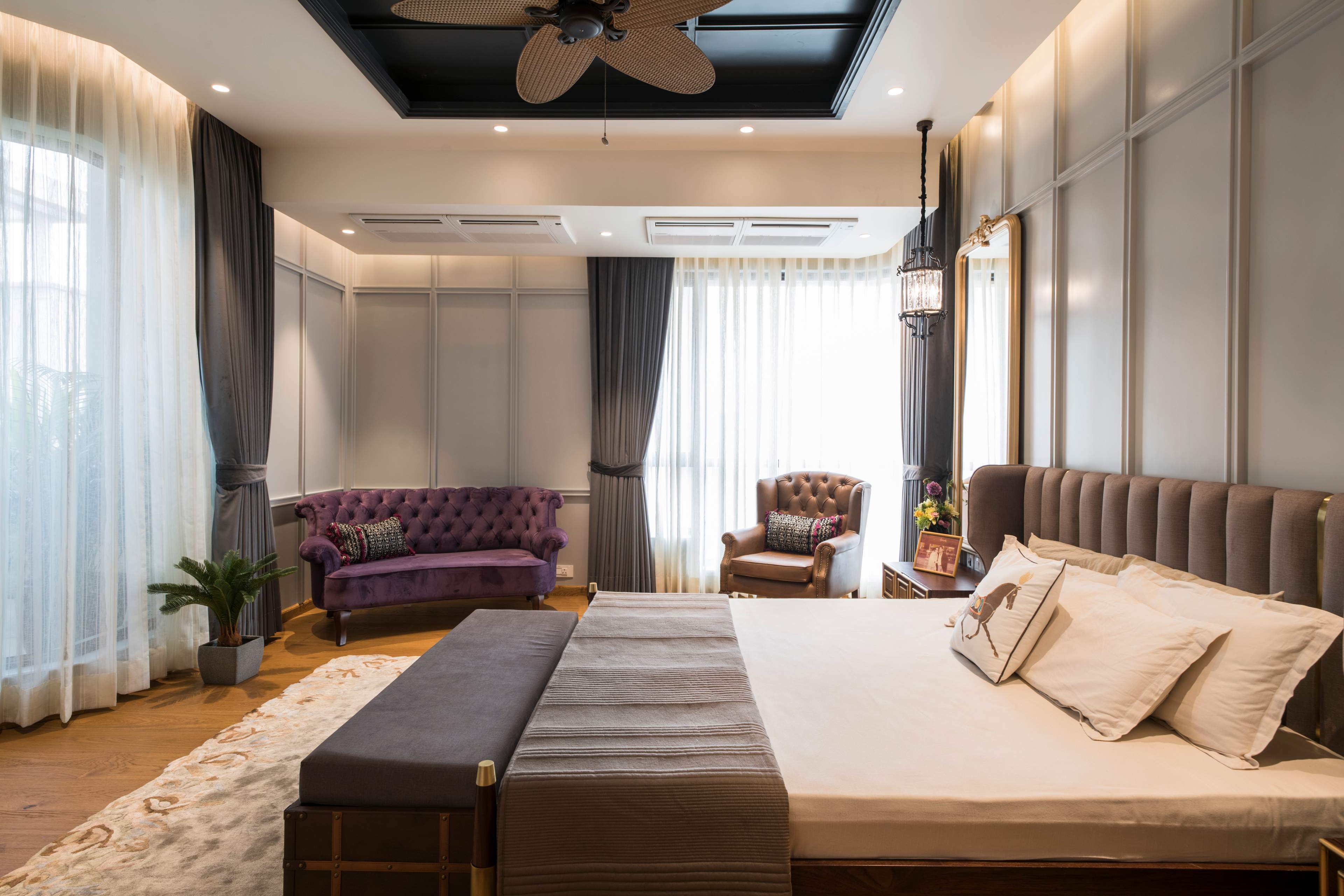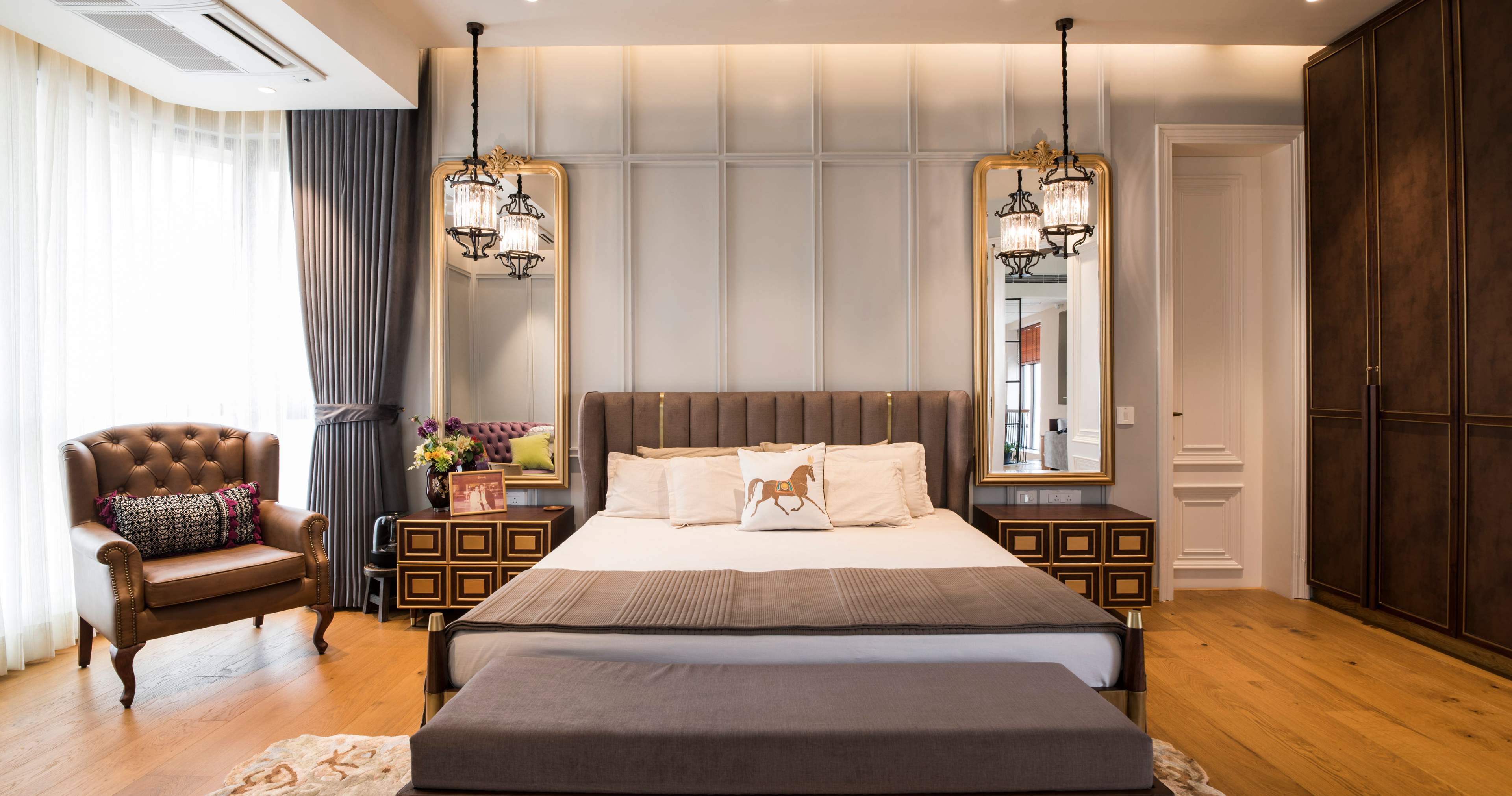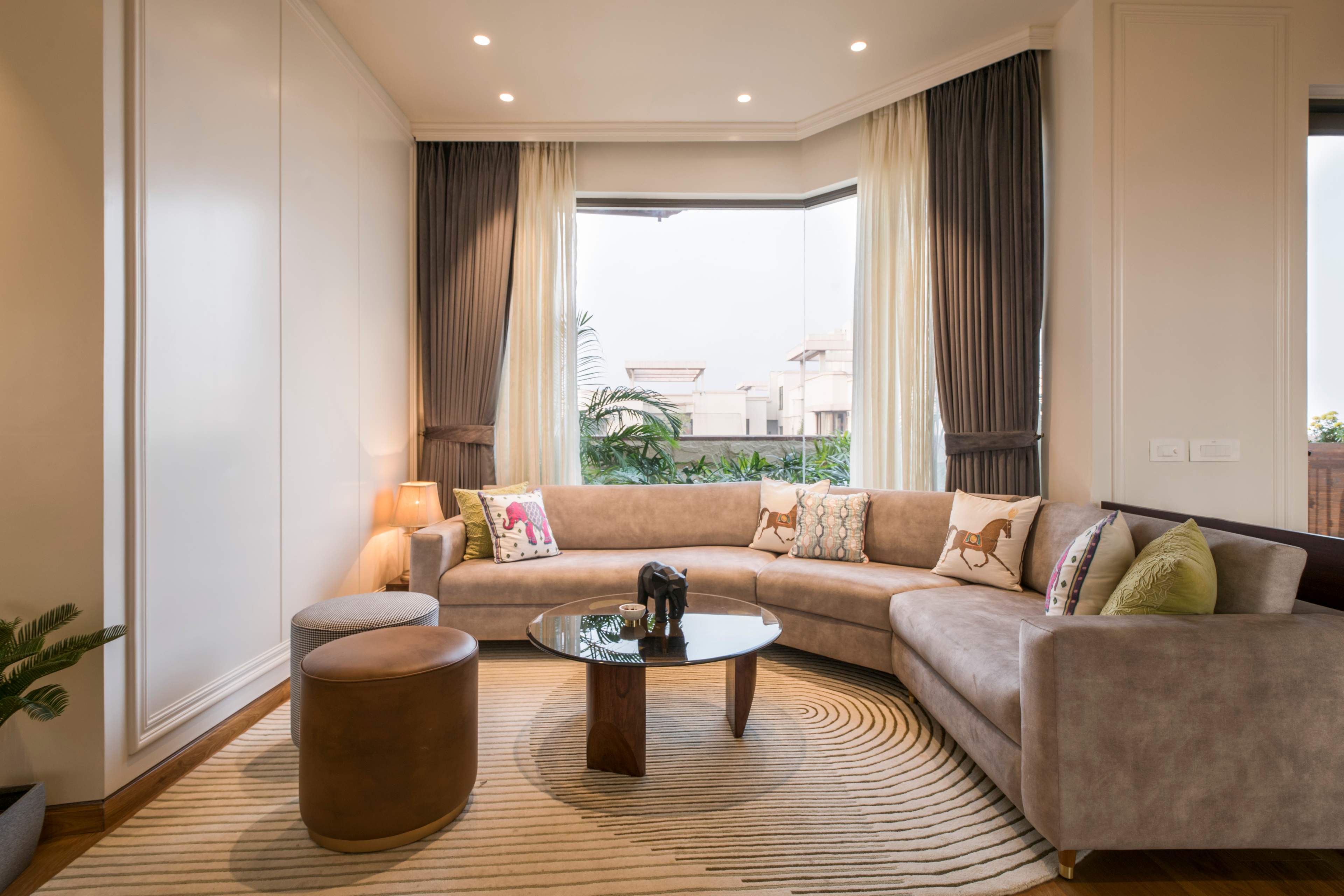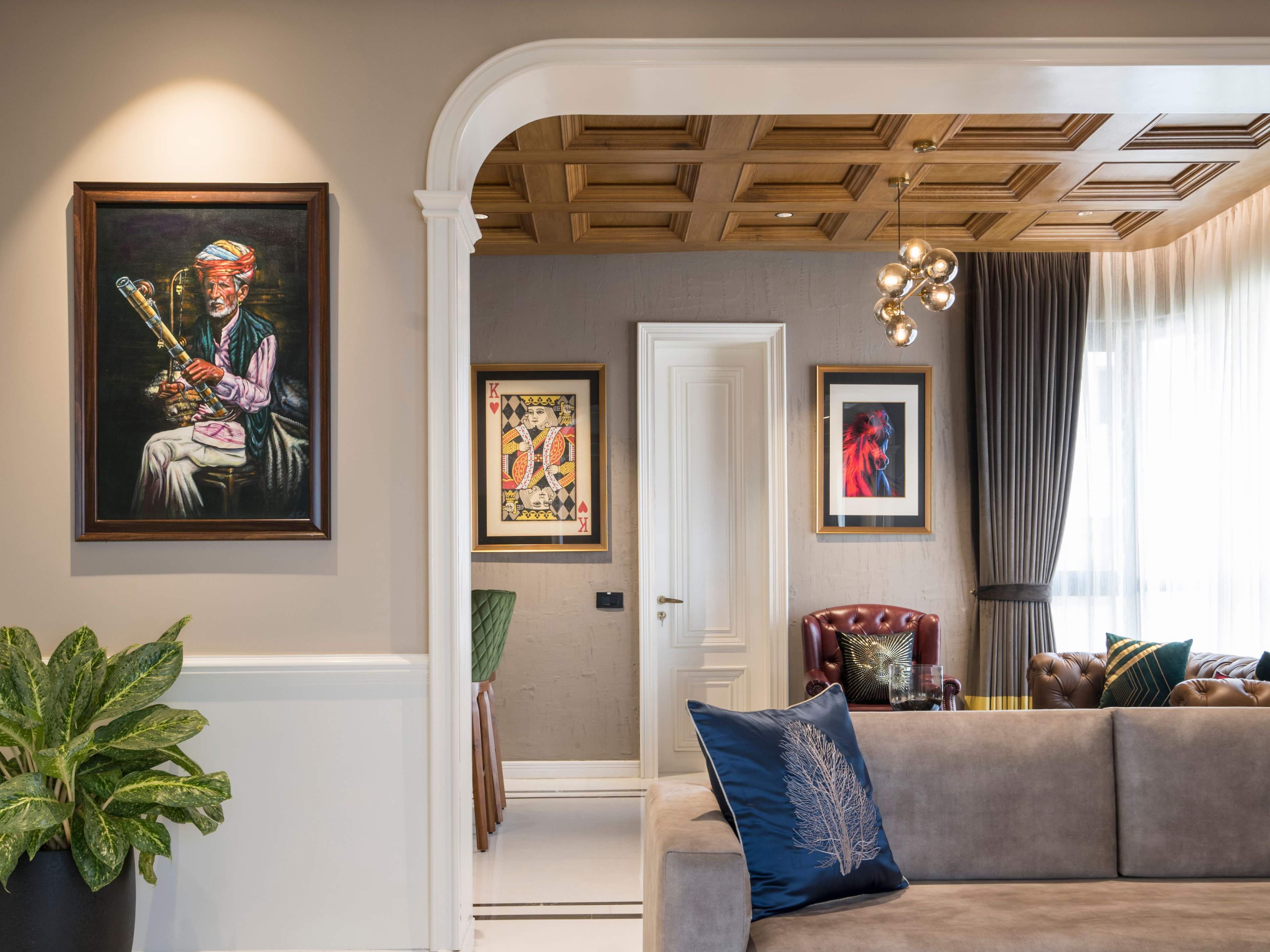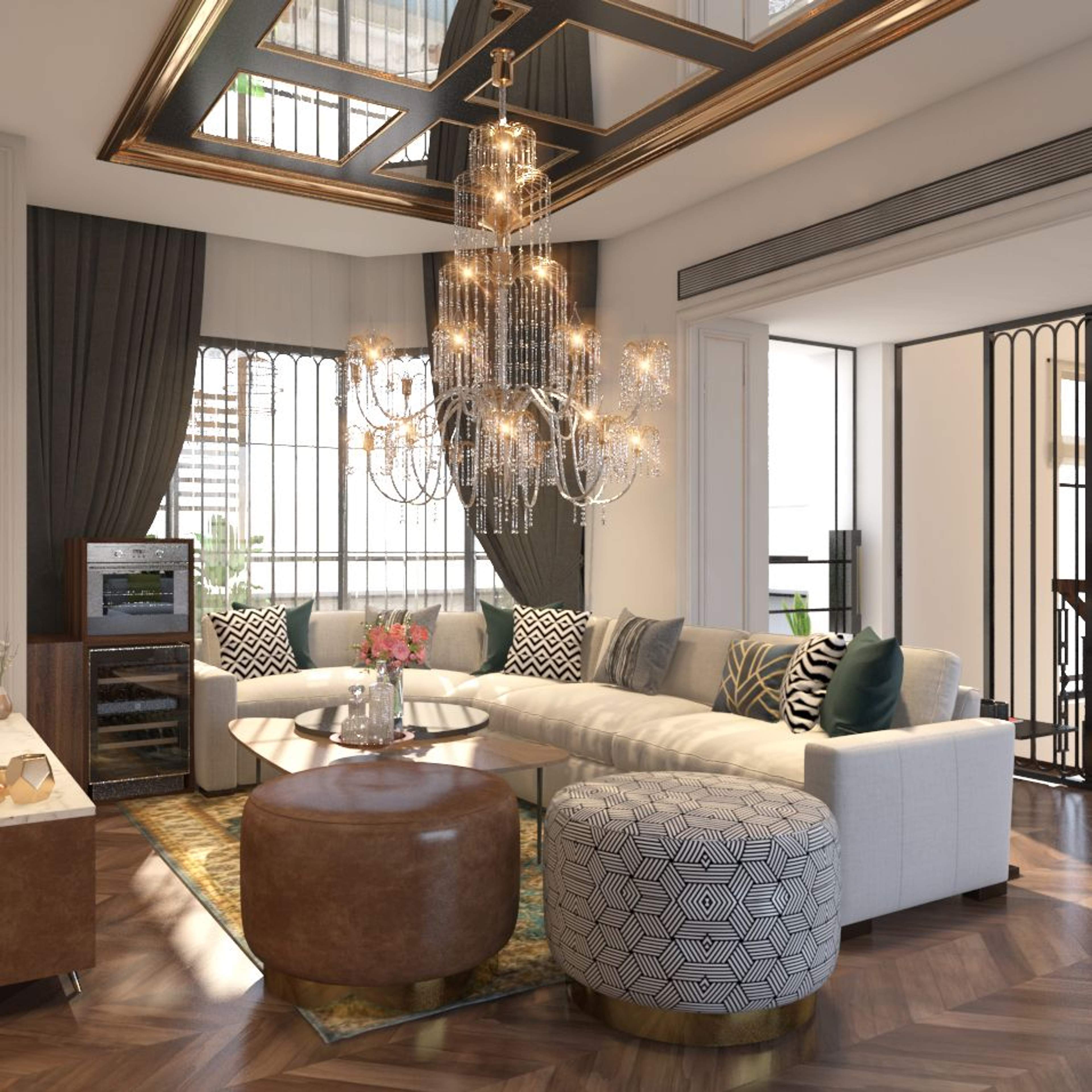 A congruence of neo-classical and traditional elements drapes this sumptuous penthouse residence in Gurgaon, New Delhi, India for a family of four. This 6500 Sqft penthouse residence aims to offer an evocative appeal layered in contemporary flair with subtle opulence. The space comprises of living room, bar area, study and open terrace in addition to bedrooms, all of which are spatially arranged across two levels of this residence. The brief was crisp; a modern dwelling with hints of traditional elements that aligns with the design sensibilities of the homeowners.