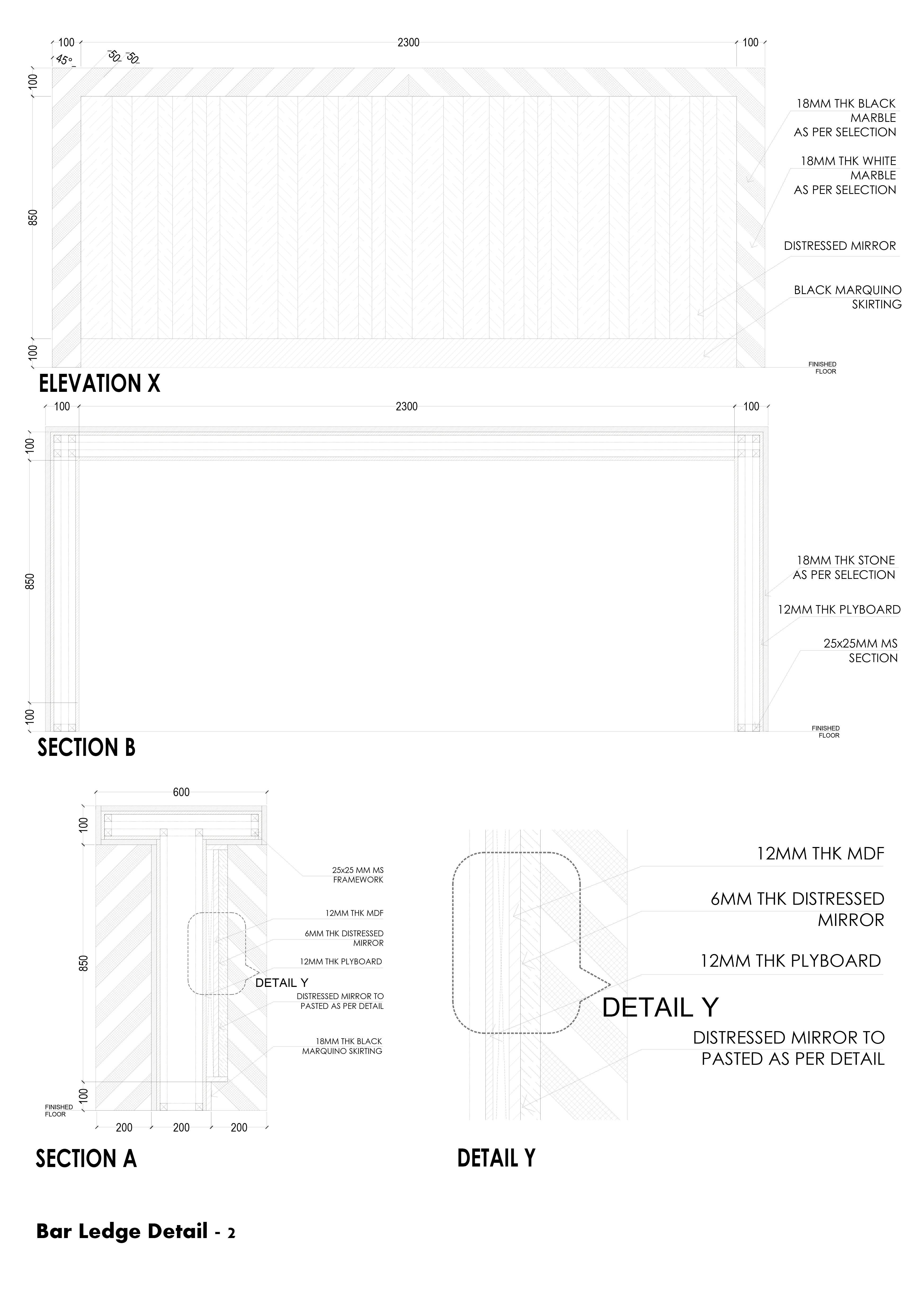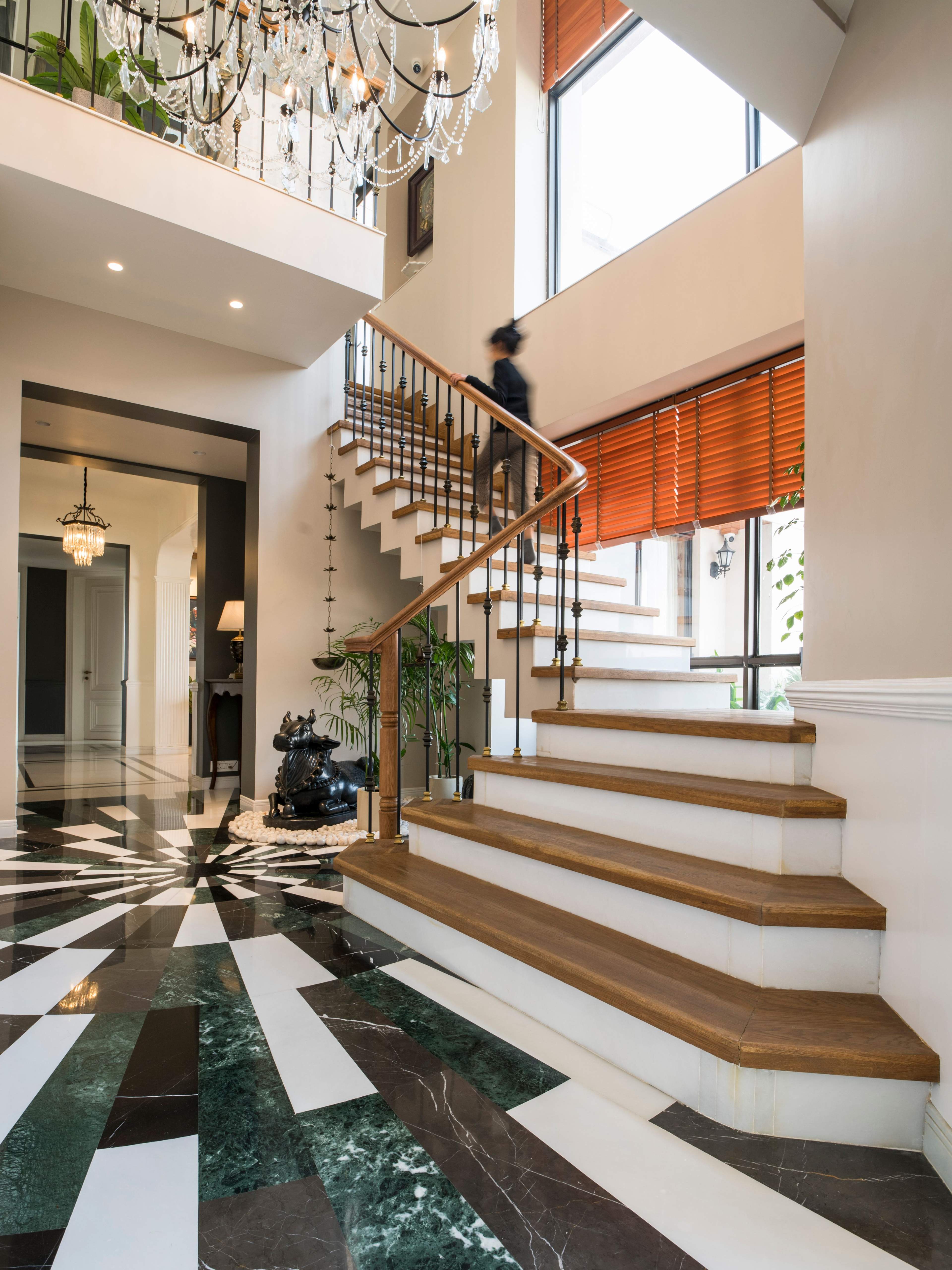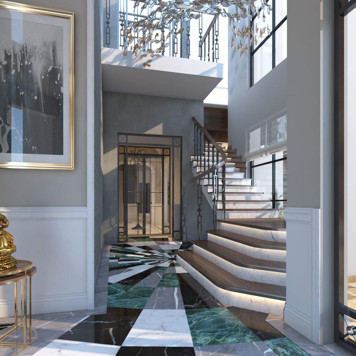 A combination of green, white and grey Bulgari stone with black Marquina marble fits the flooring of the foyer in a circular pattern. The double-height of the foyer accentuates the dramatic effect upon entry which is further glistened by a bespoke chandelier. Entering the lobby, the house divides into distinct nodes leading to separate spaces such as the living room, dining space and bar area with a guest bedroom on the side. The walls of the living area are coated in nudes with sleek mouldings—a modern interpretation of classical design.