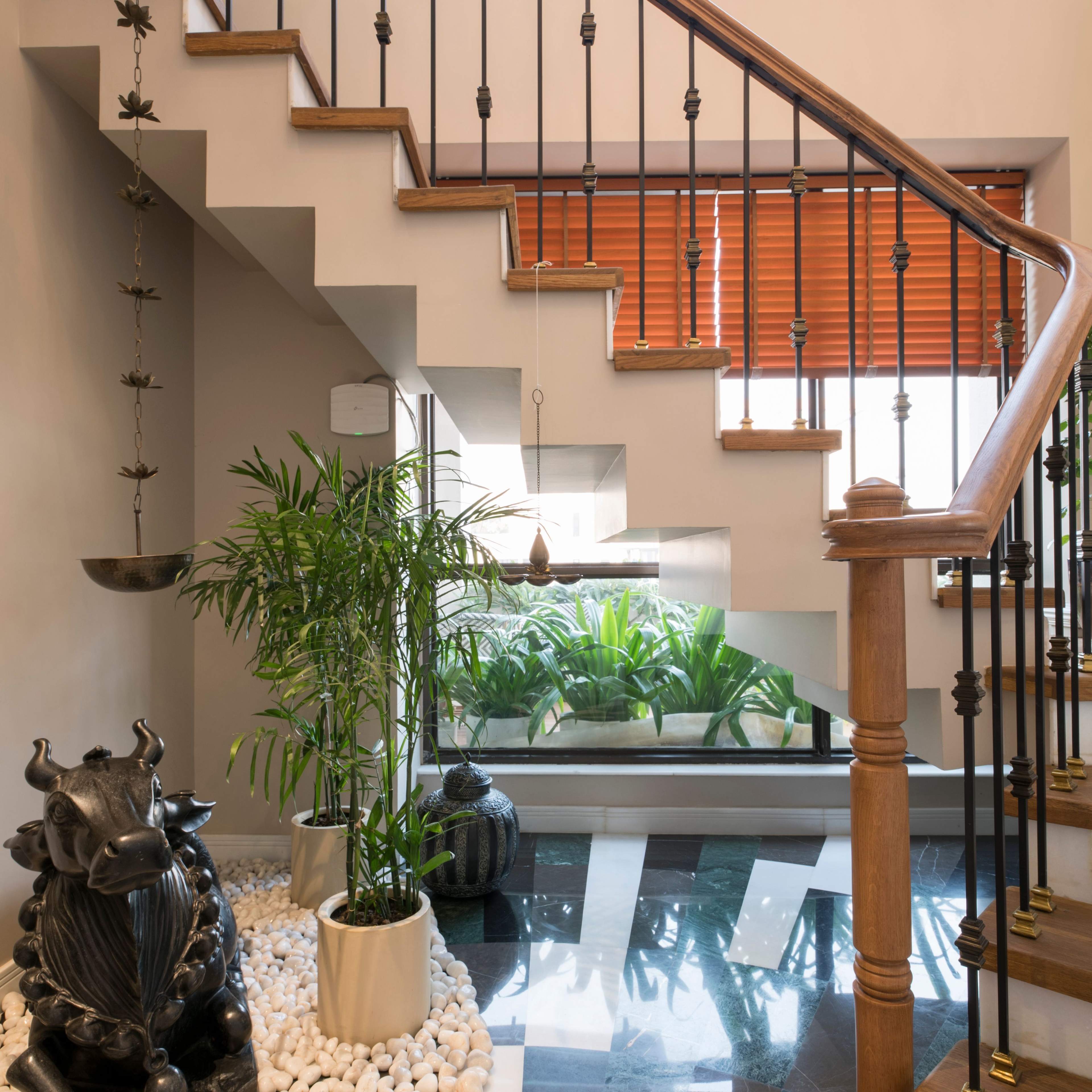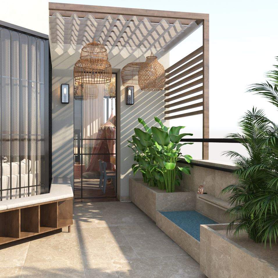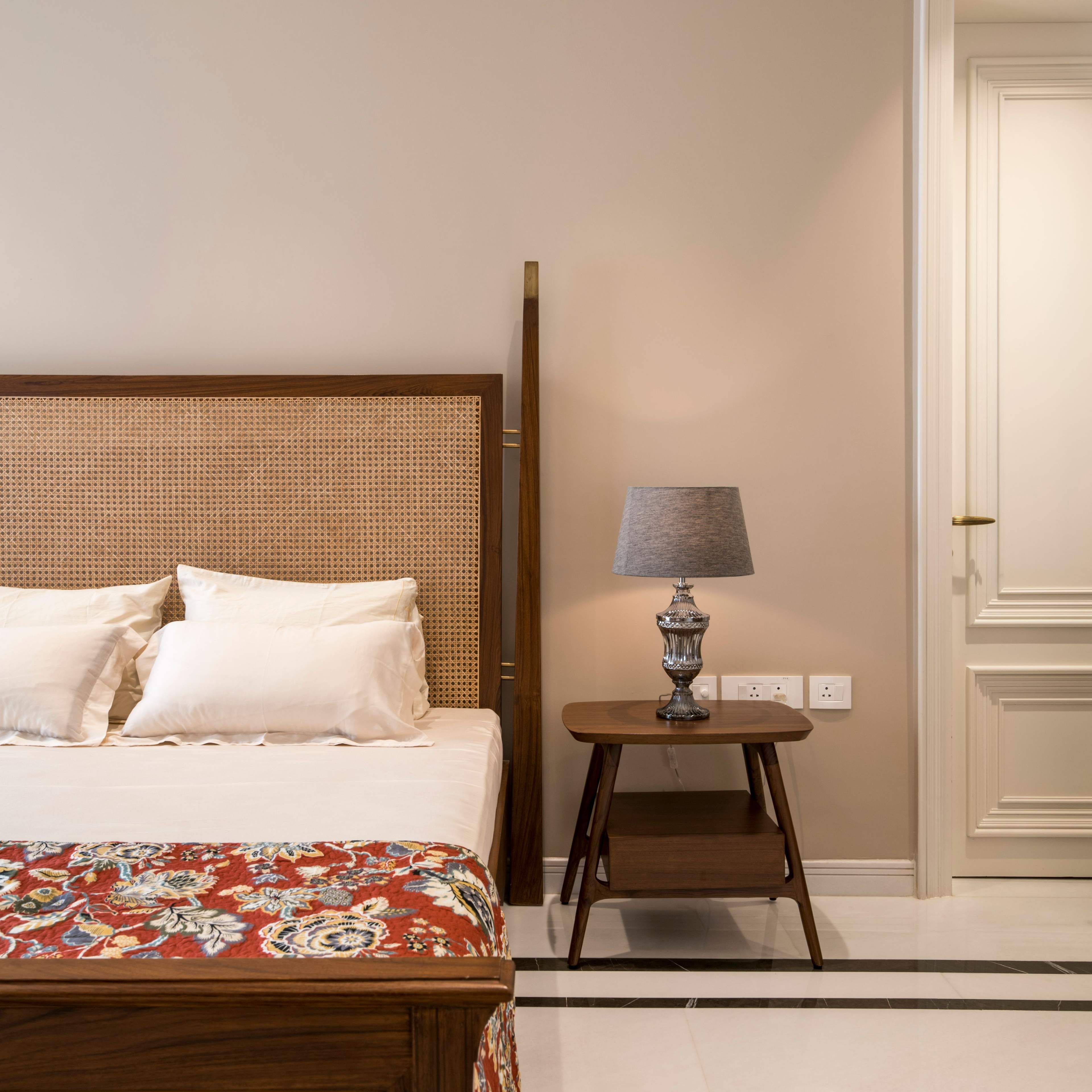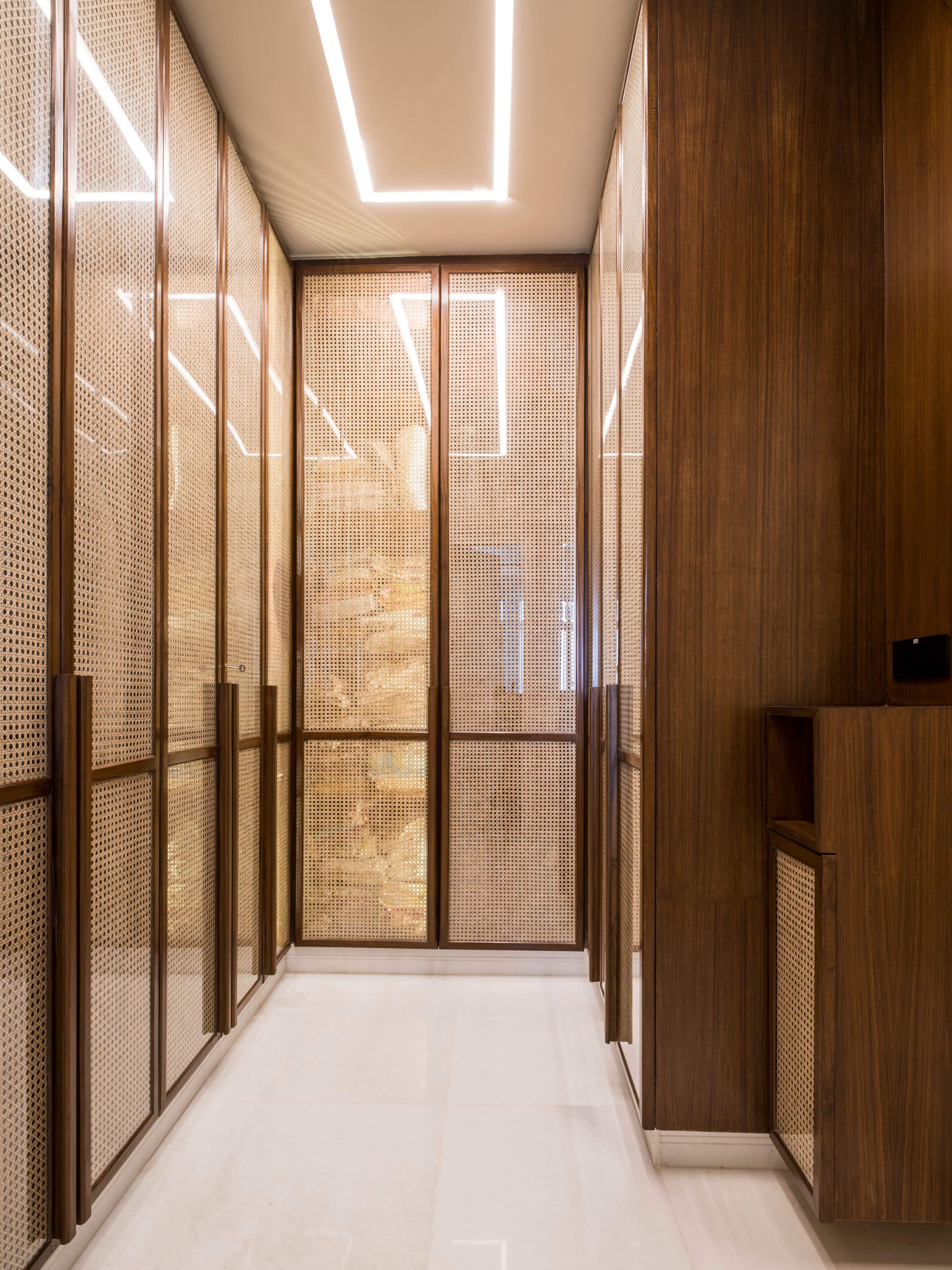 The lower floor was designed with the intent of day-to-day use and guests’. Designed with lighter elements like wicker and wood for wardrobe shutters and headboards, the design of this space honours the age-old craftsmanship of cane, lending the room an earthy tone.