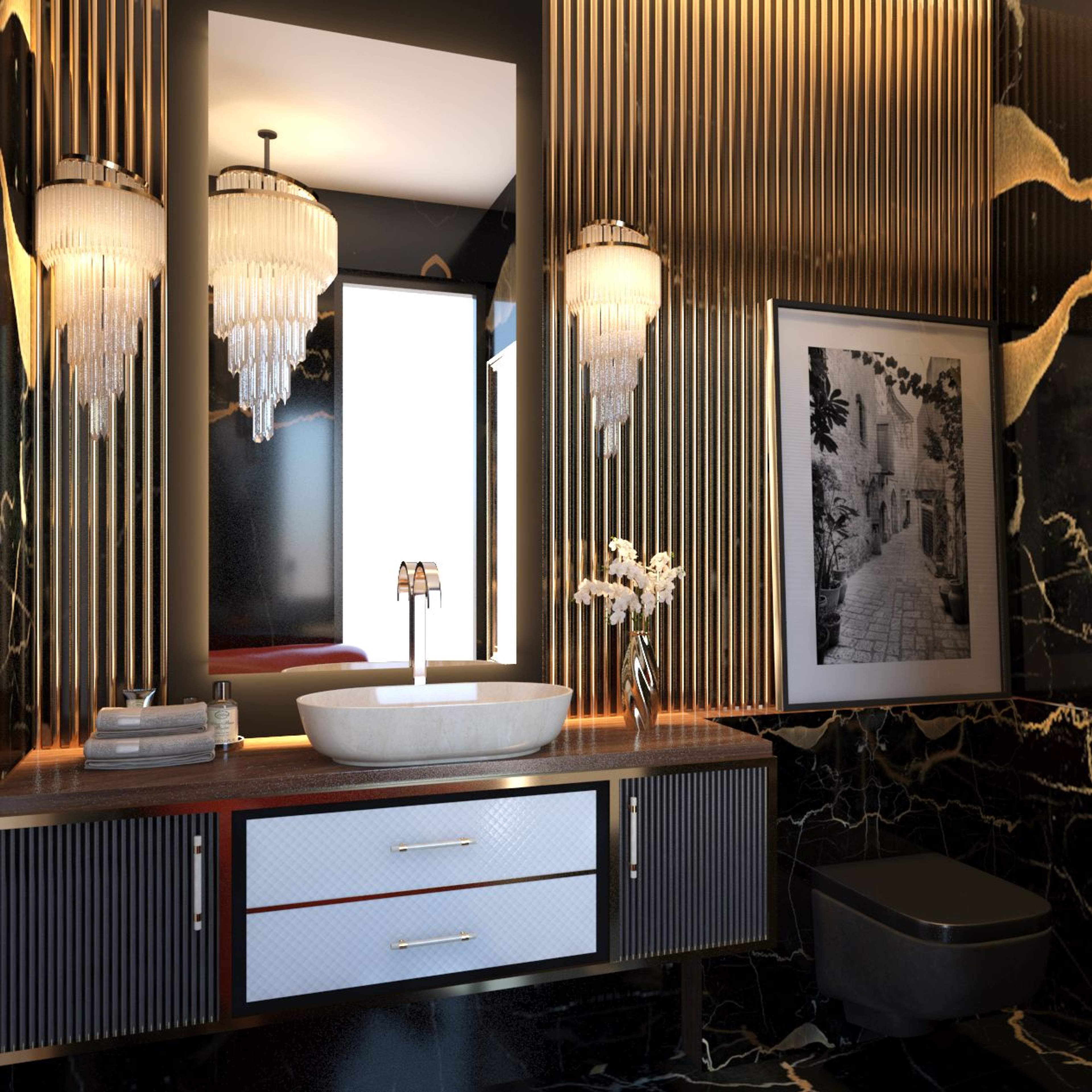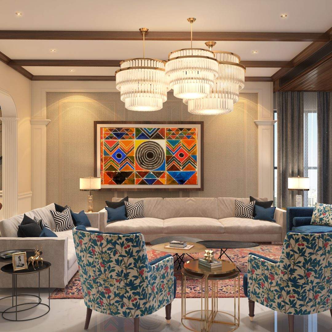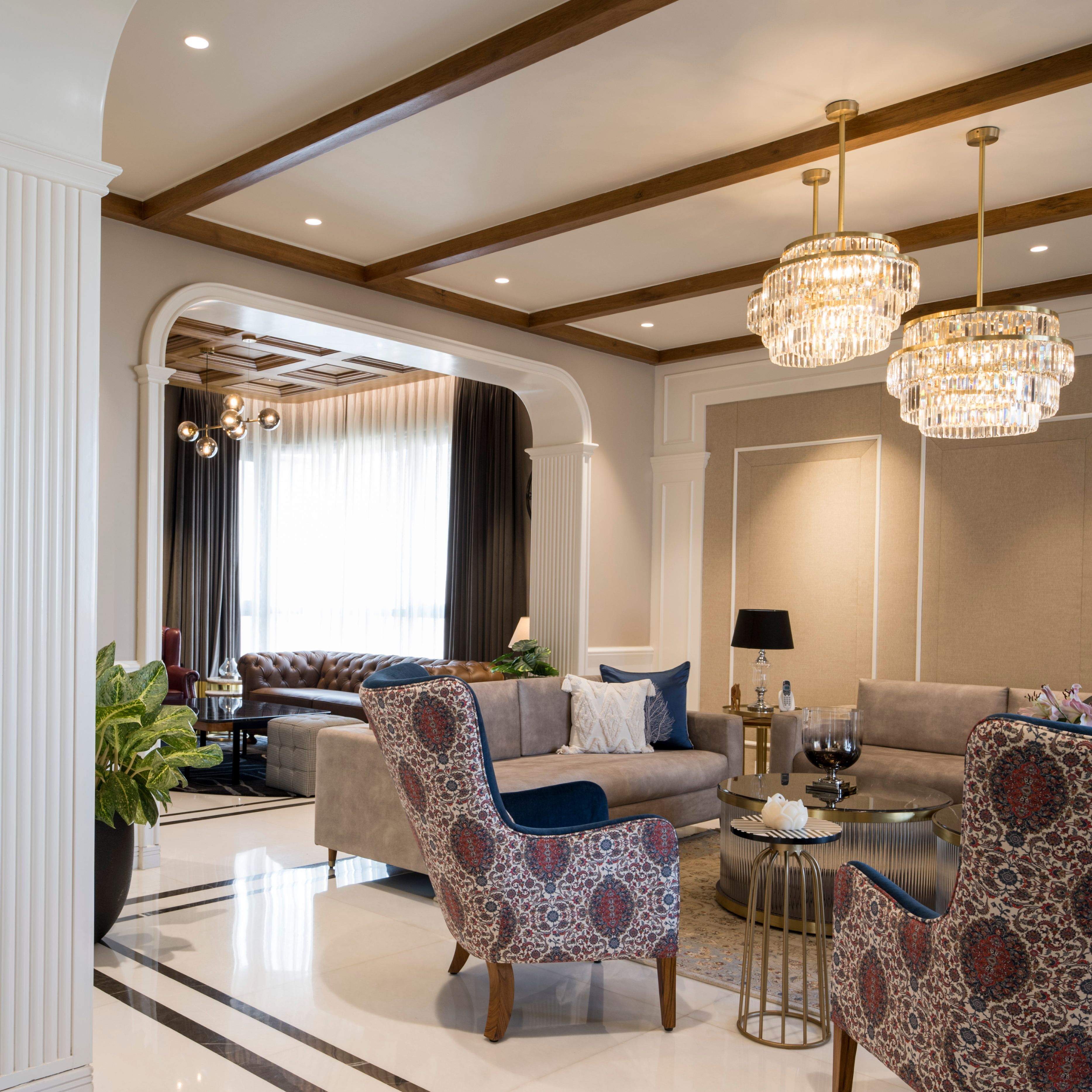 The design narrative builds upon an experience that is regal, and opulent, yet optimises in strategic spatial planning that makes this abode completely utilitarian, providing seamless circulation throughout the space. The residence’s design intent has been enhanced by bespoke decorative lighting which caters to the dynamics of the space, lending it an aura of warmth. Downlights were incorporated to generate ambient lighting, whereas statement pieces like crystal chandeliers were installed in formal places to create a rich atmosphere, accentuating the height of the space. It is critical to have a space that evenly diffuses and distributes light while also instilling a touch of elegance, in tune with the synergy of the space.