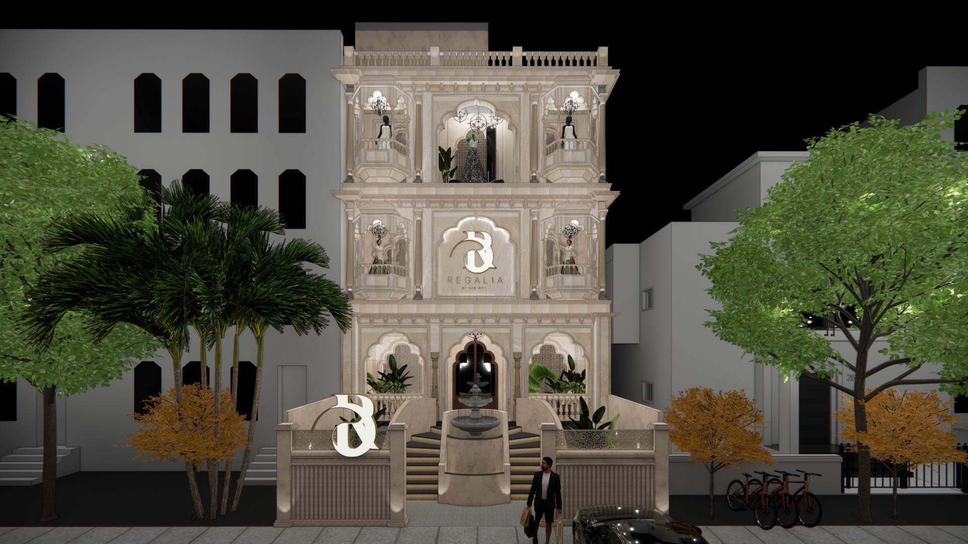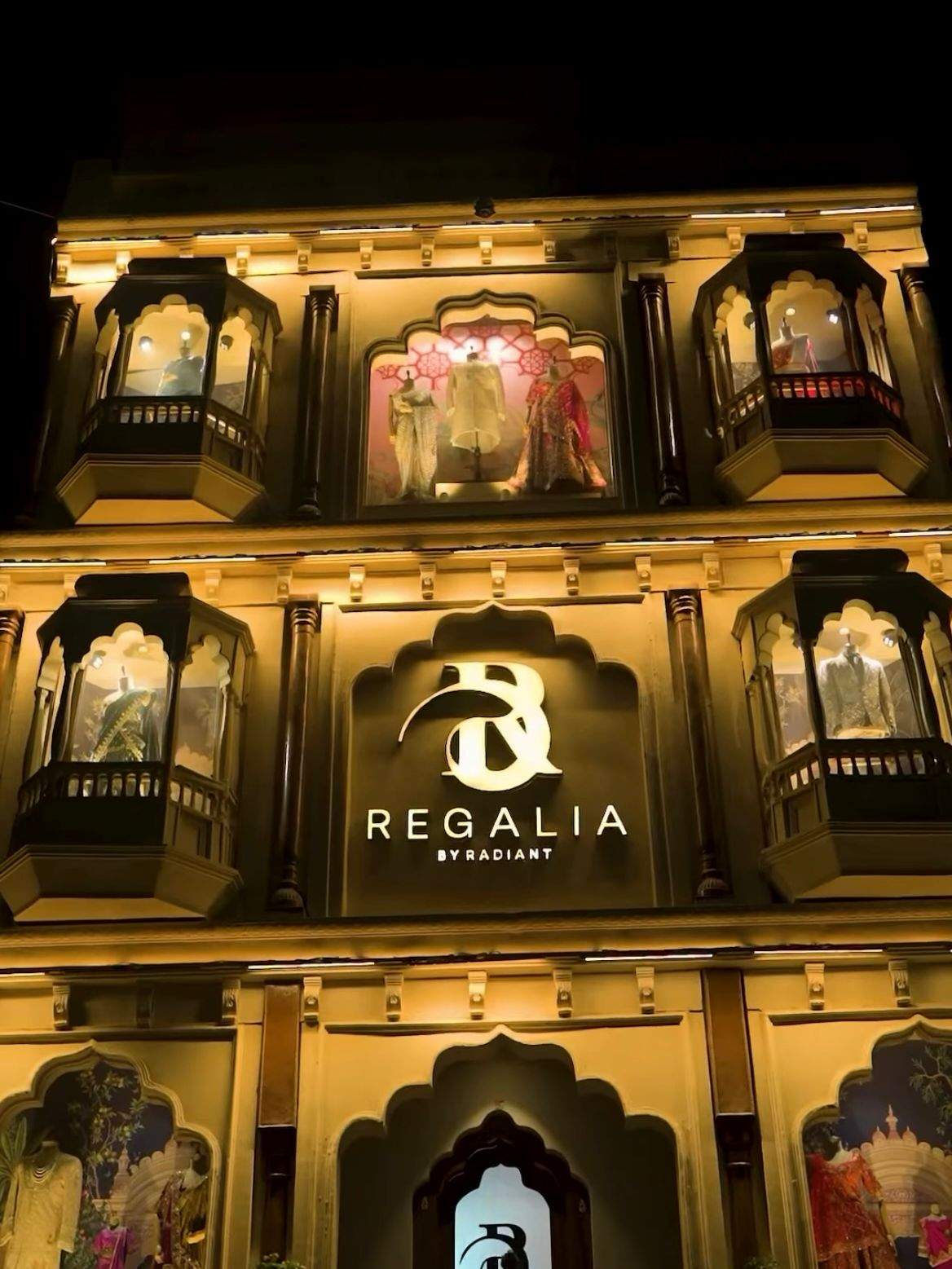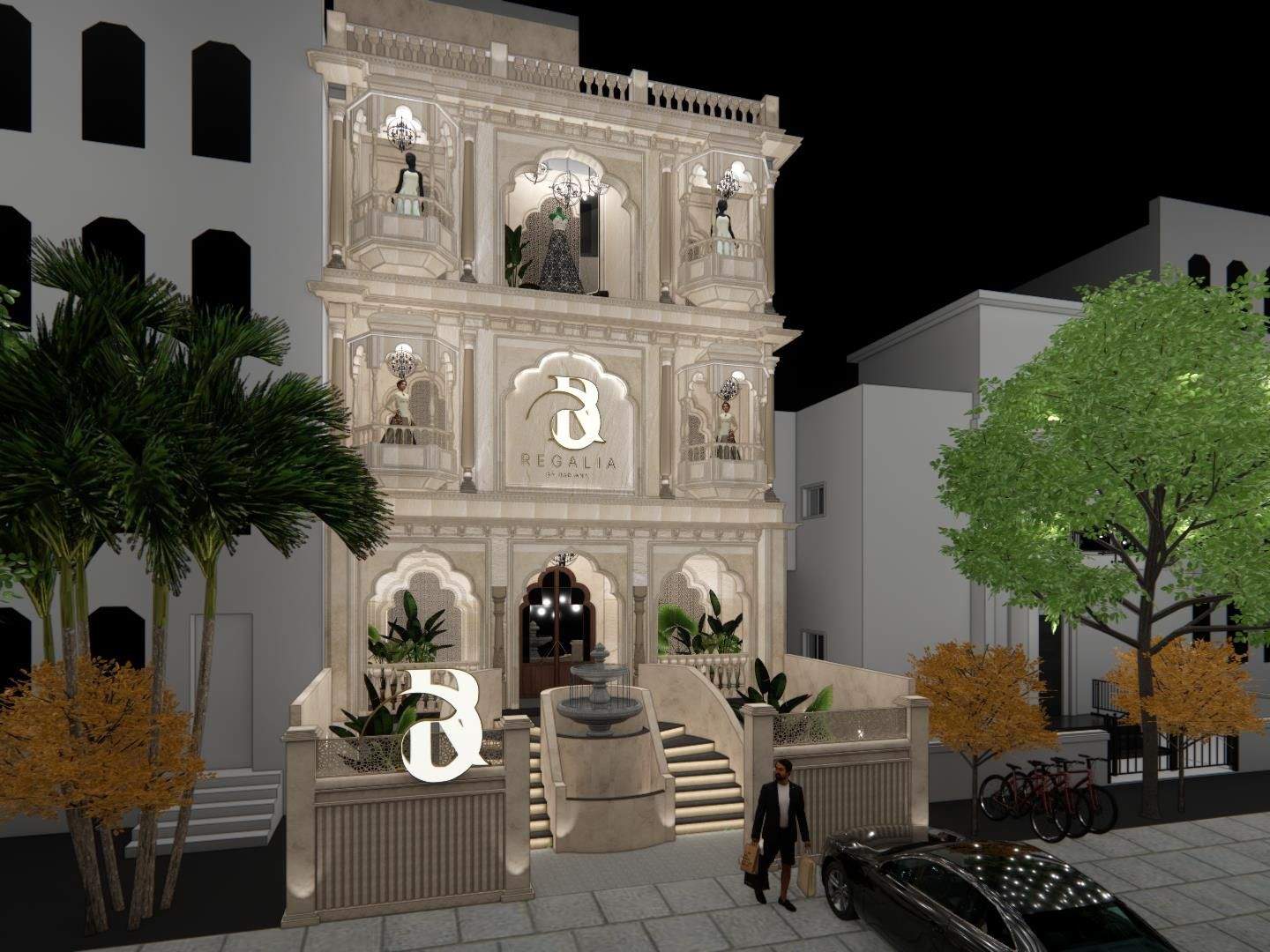The facade of Regalia Fashion Store is a striking blend of heritage and modernity, drawing inspiration from Rajasthani Haveli architecture. Every element is meticulously crafted to evoke a sense of royalty, grandeur, and timeless elegance.