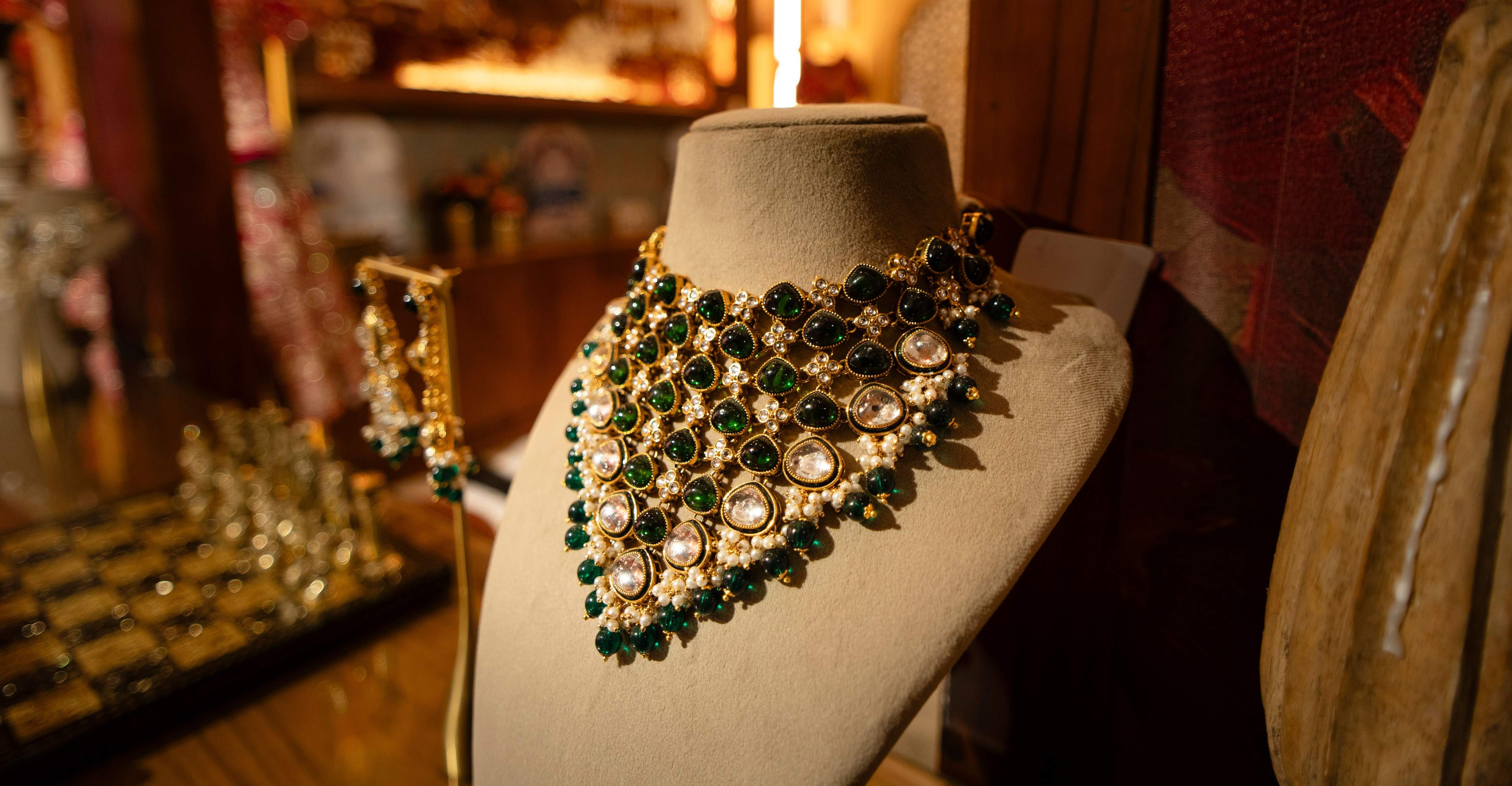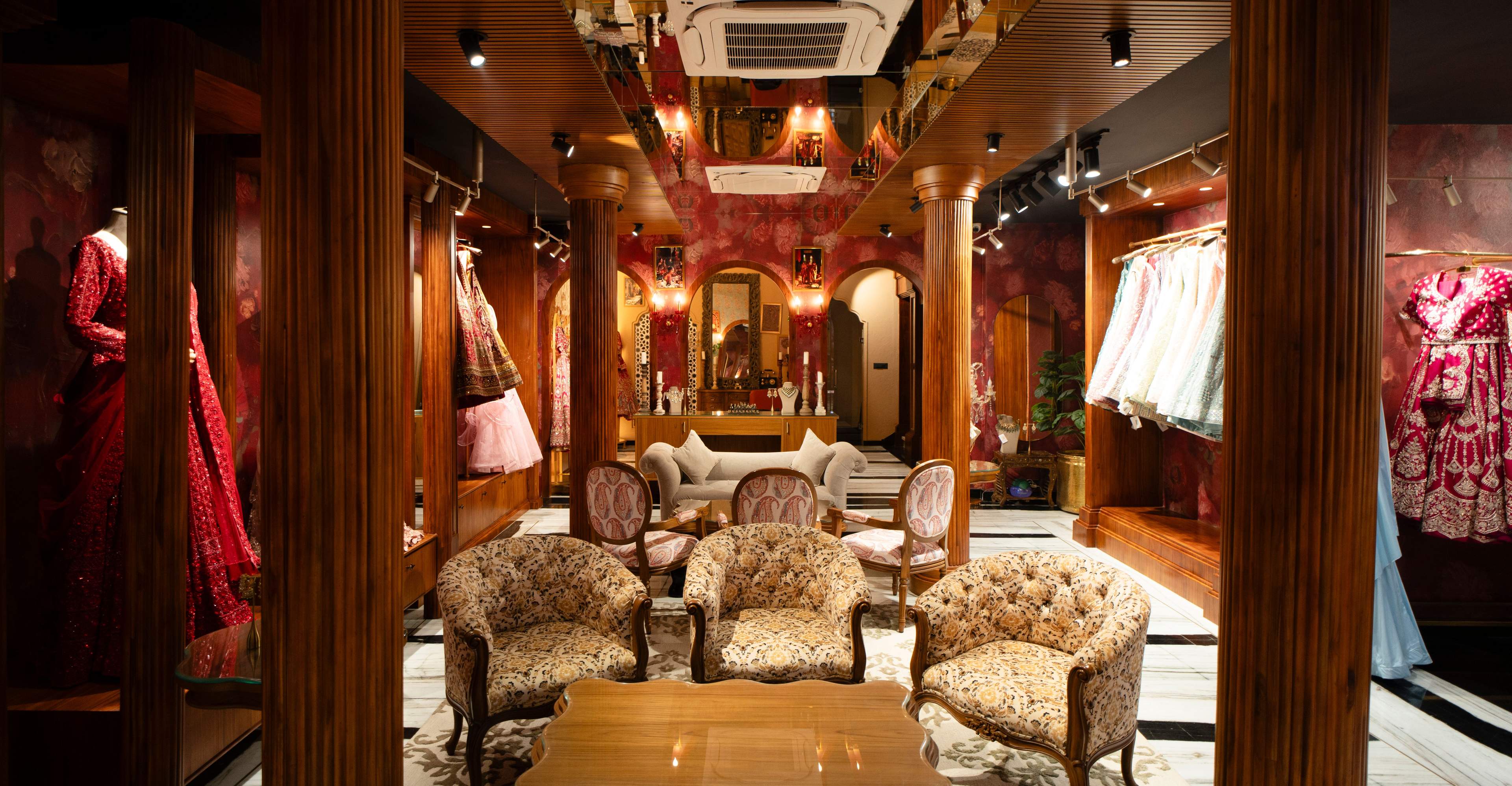 Arched Entryway – The grand entrance is adorned with sculpted arches, reminiscent of Mughal and Rajputana palatial doorways. This detail adds a regal charm while creating an inviting gateway into the world of luxury fashion.