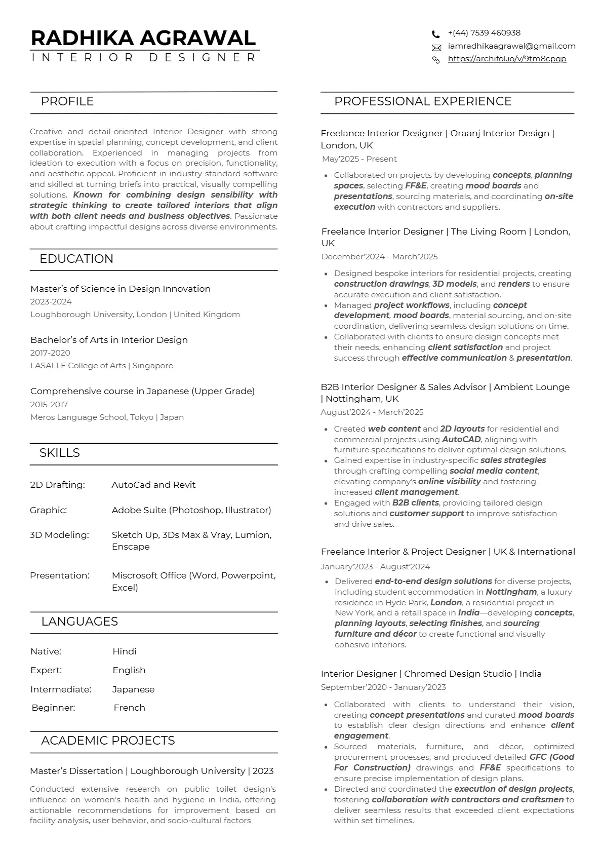 I'm eagerly seeking opportunities to collaborate and contribute my creative expertise to forward-thinking design organizations and companies. Armed with a Bachelor's degree in Interior Design from Lasalle College of Arts, Singapore, and enriched by 5 years of professional experience, I bring a diverse skill set and a fresh perspective to the table.