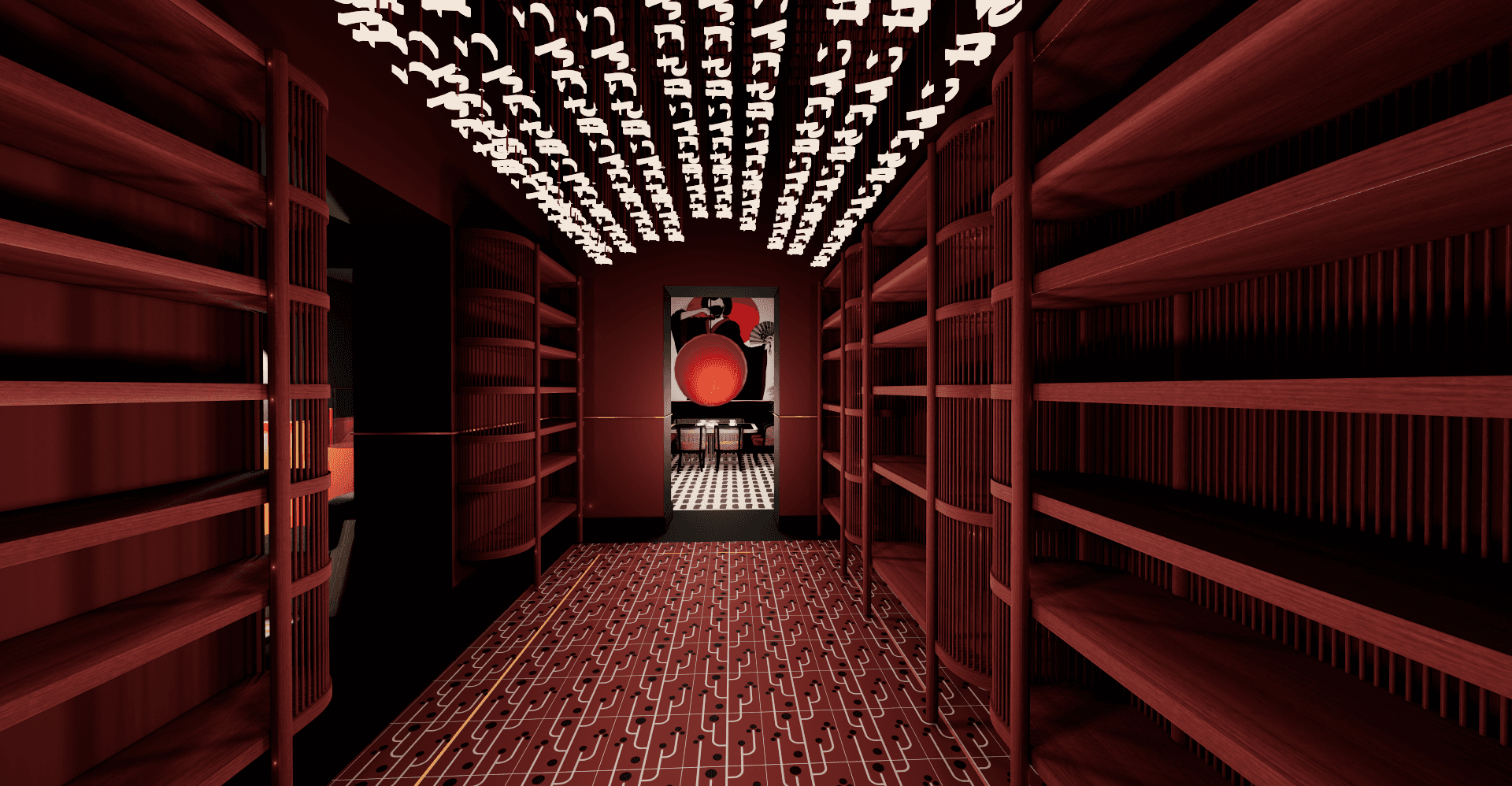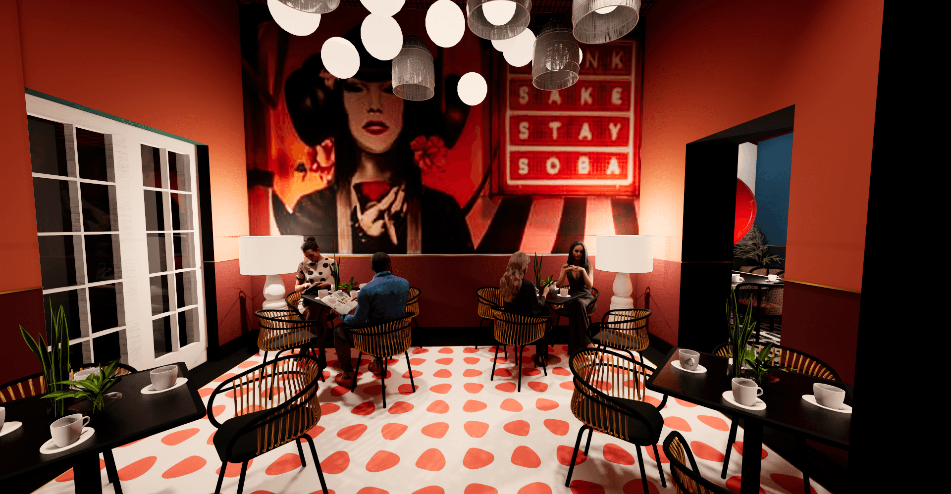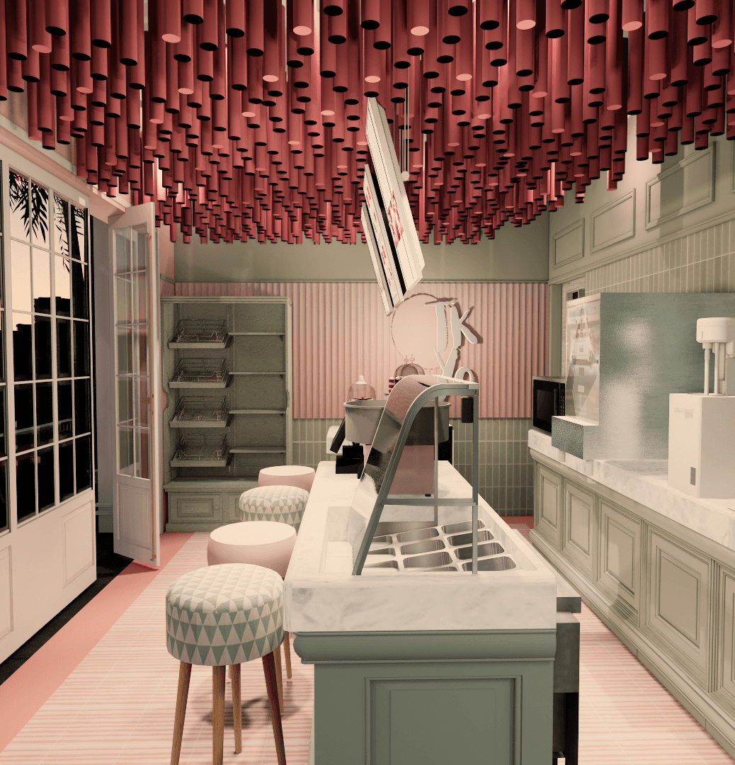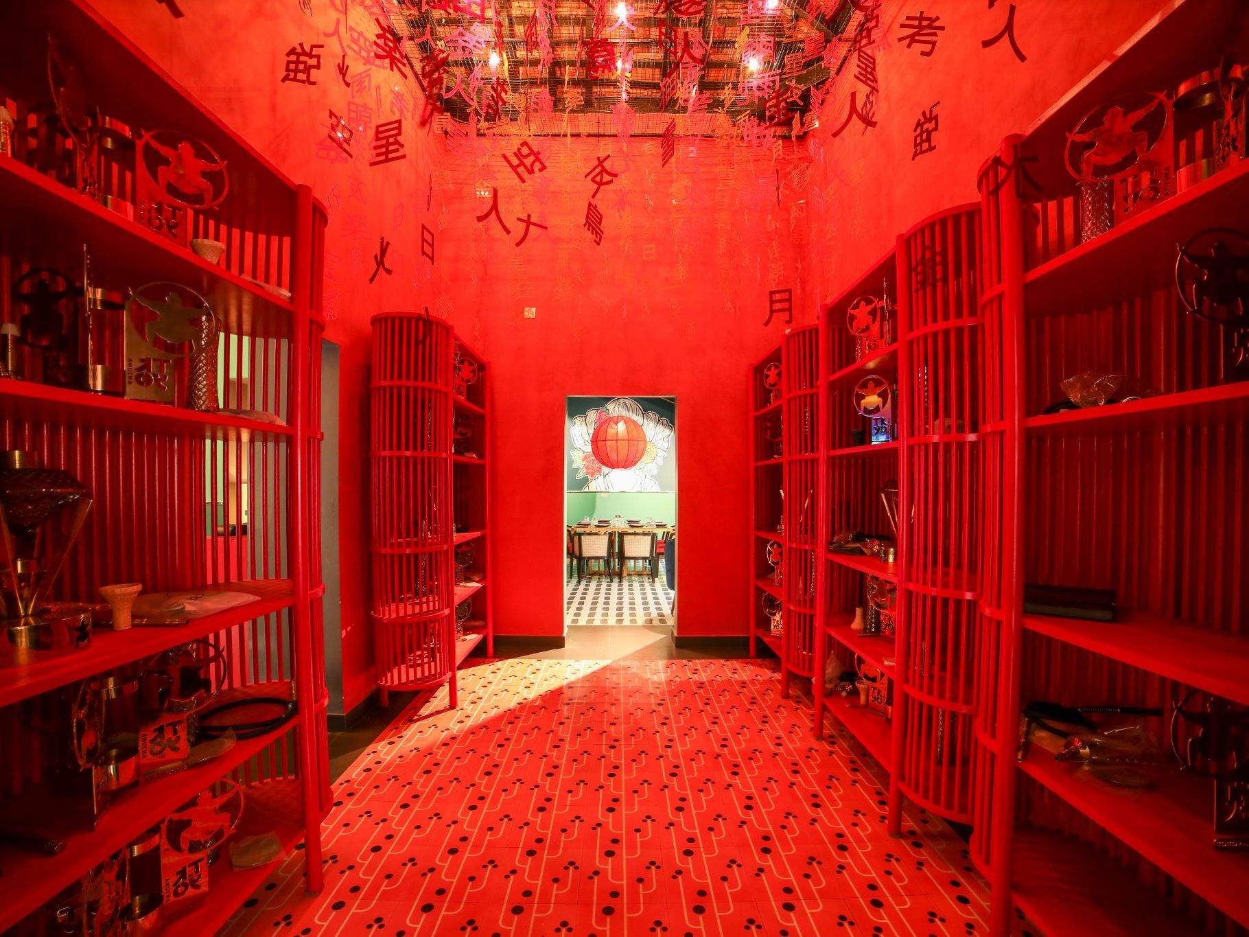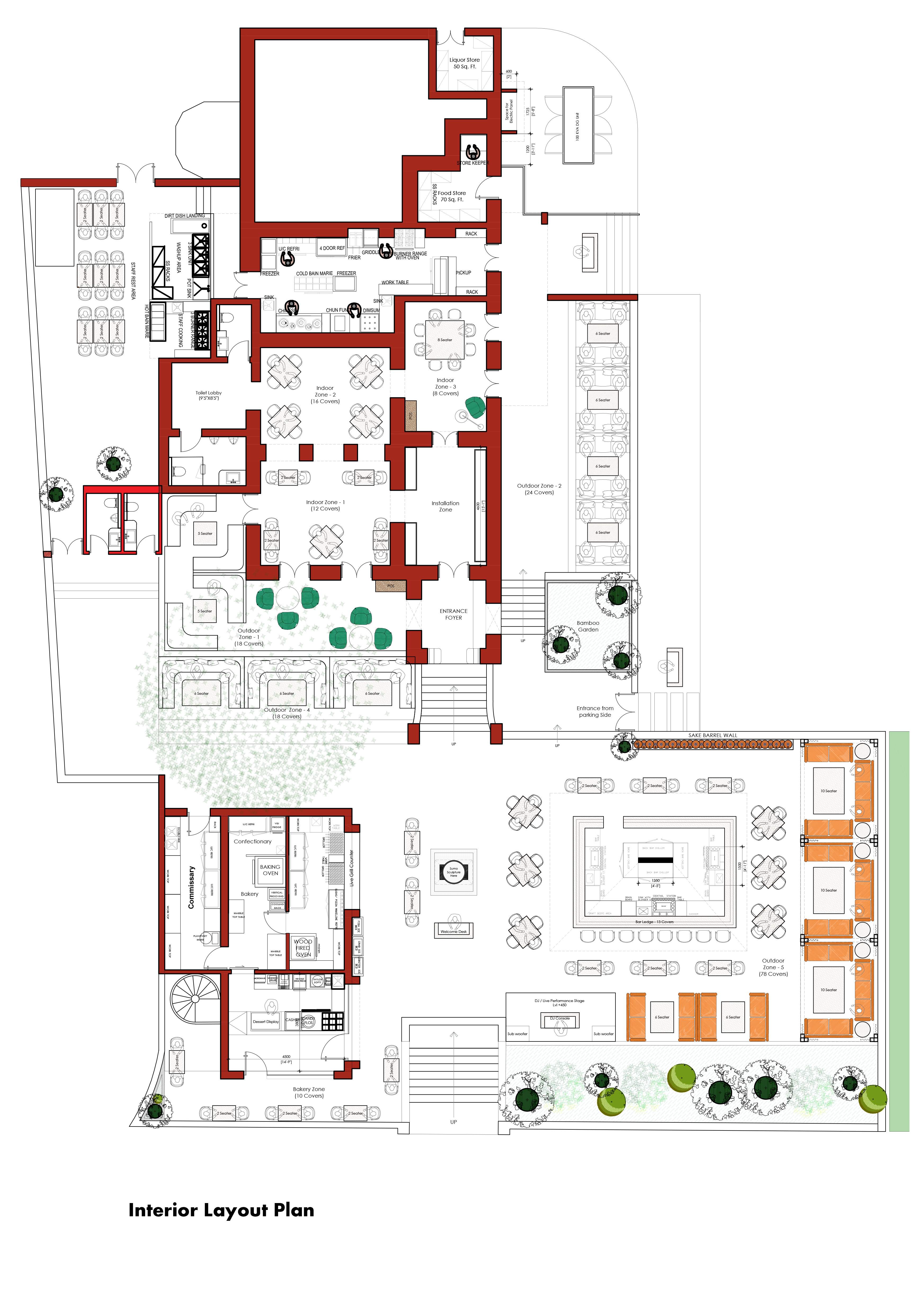 Taking the game of overlay of themes and colours to the next level, TK-YO bakehouse is an annexed bakery inspired by a mix of minimal Japanese bakeries and popular German bakehouses. TK-YO Bakehouse is synthesised in muted neutral and pastel colours, as opposed to the bold hues in other areas. A ceiling installation of hollow pipes with scattered lighting covers the ceiling. The entire room is enclosed in panoramic glass panes, and a massive 10 ft. glass door encased in a heavy iron frame. The bakehouse also shares its wall with the live grill section on the other side.