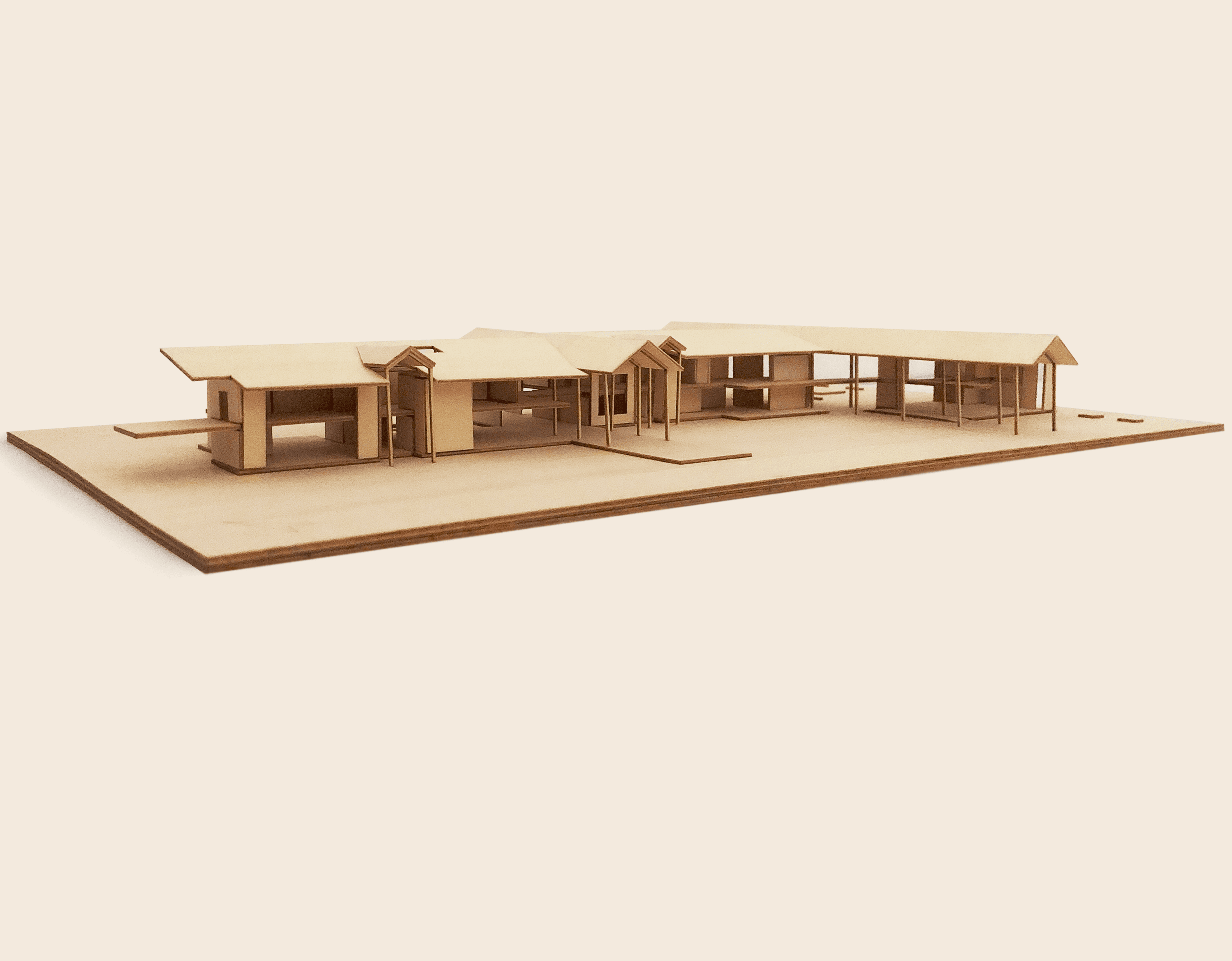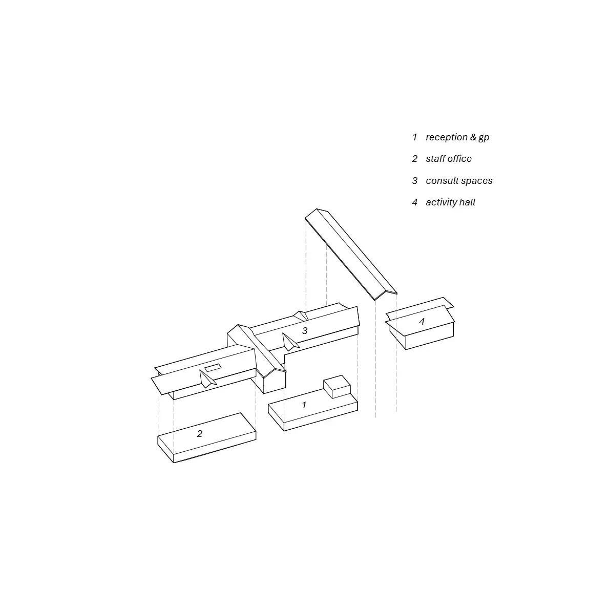 The canopy undertakes an unconventional exploration of fluidity through rectilinear geometries. Surfaces fold and fall becoming furniture and the boundaries between the interior and exterior are blurred. An organic flow is implemented through inhabitable circulation spaces by configuring enclosed rooms as soft boundaries between static common areas. These common areas are designed to allow people to remain in the space after their appointments, destigmatising counselling spaces. The medical corridor is reframed as an external passage which embeds the architecture into the landscape, connecting public paths and framing park views.