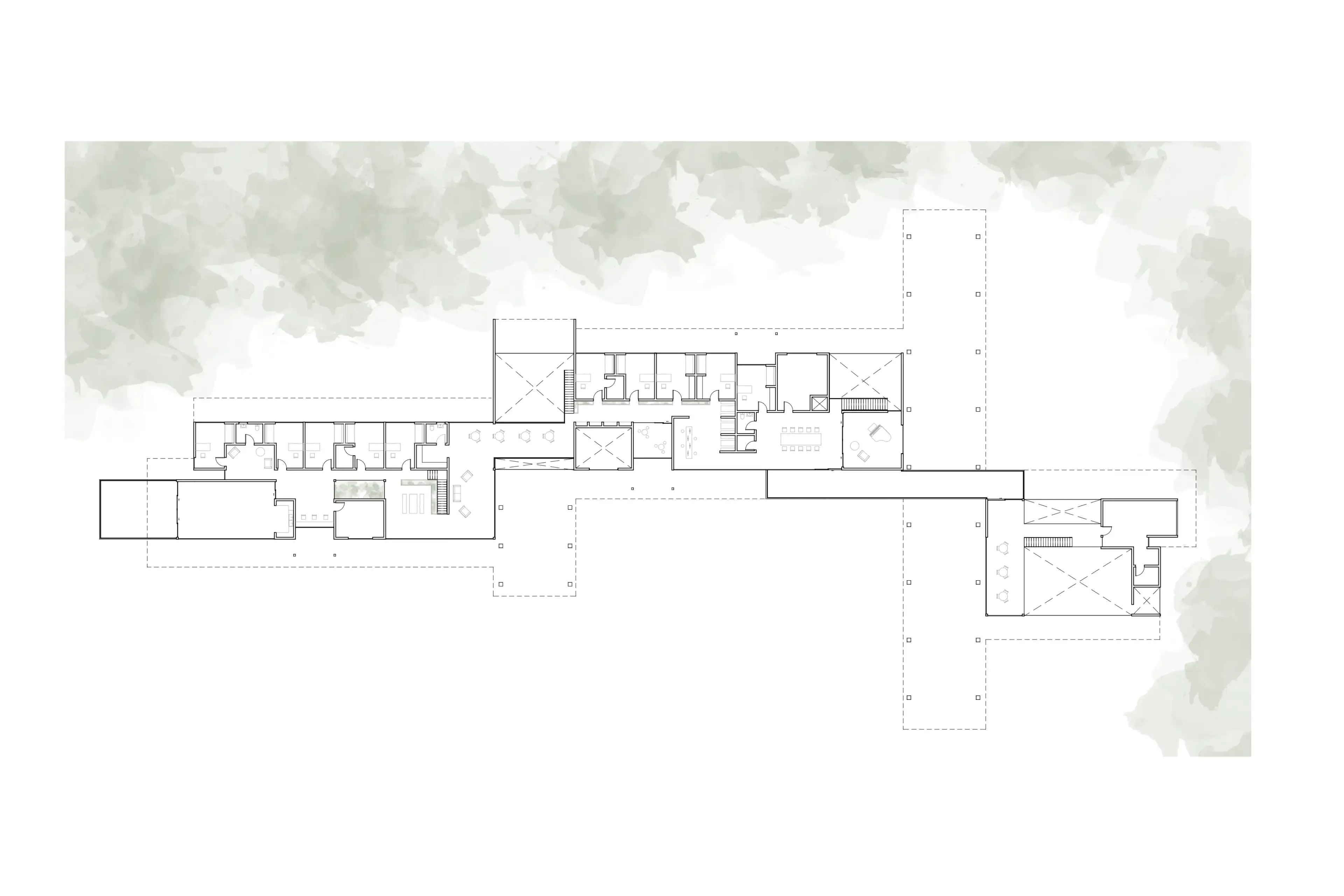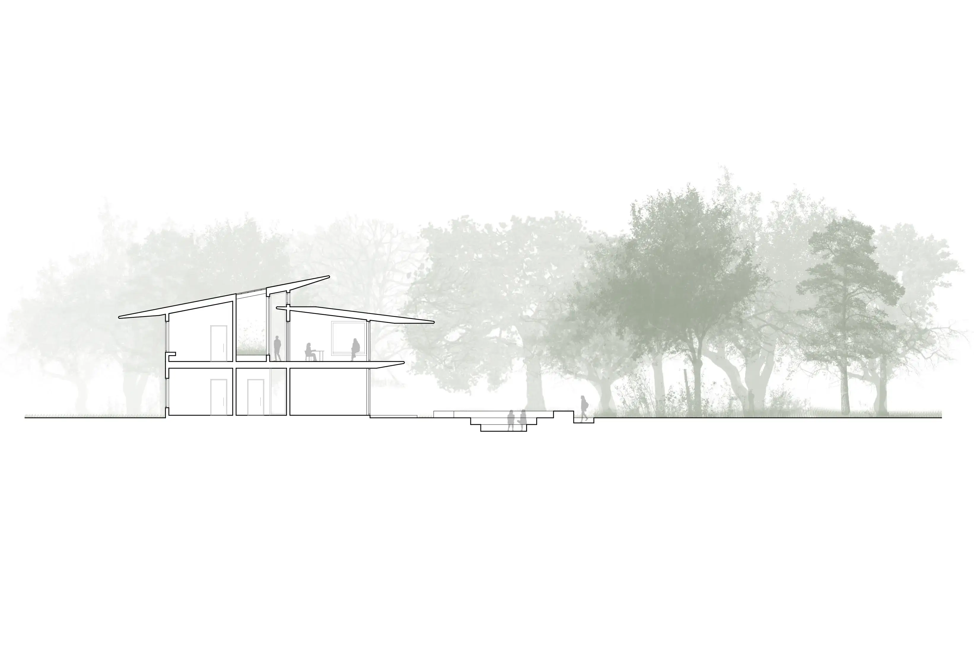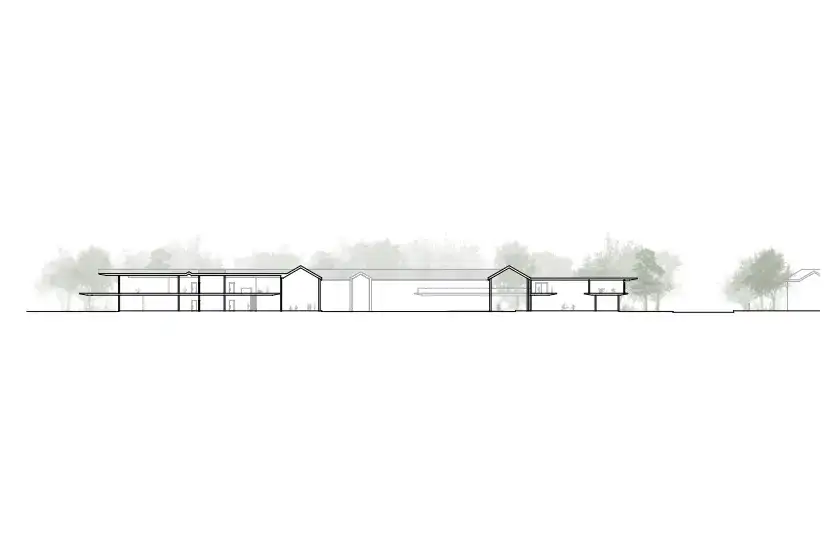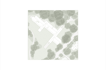 The Canopy aims to create a holist healing environment going beyond traditional clinical healing, through a sequence of escape, dwell and connect. The architecture aims to remove the users from the hustle and bustle of the city and place them into the natural environment, encouraging them to find a moment of stillness to create community connections. The form sits parallel to a tree canopy becoming it's extension and enabling access to the trees from two stories. Below, dapple light shines through the canopy leaves onto the ground under the trees. A level up, the interiors are submersed into the canopy creating a feeling of escape and refuge in the natural landscape. The interior spaces feel warm and cozy, and the exteriors feel serene and calming fostering a comforting environment