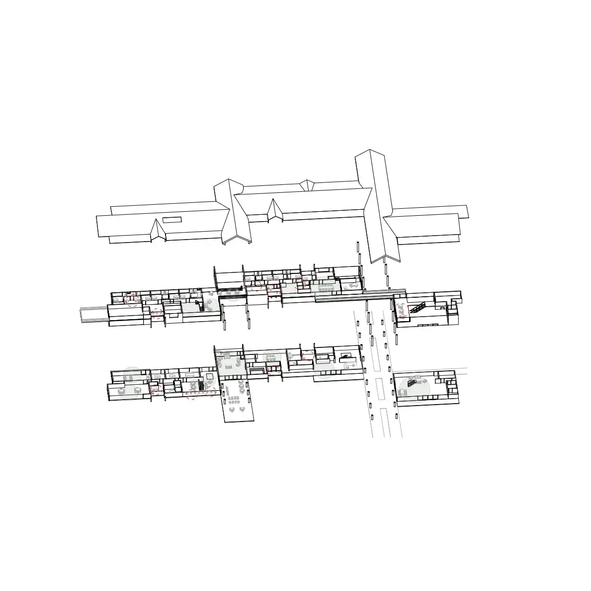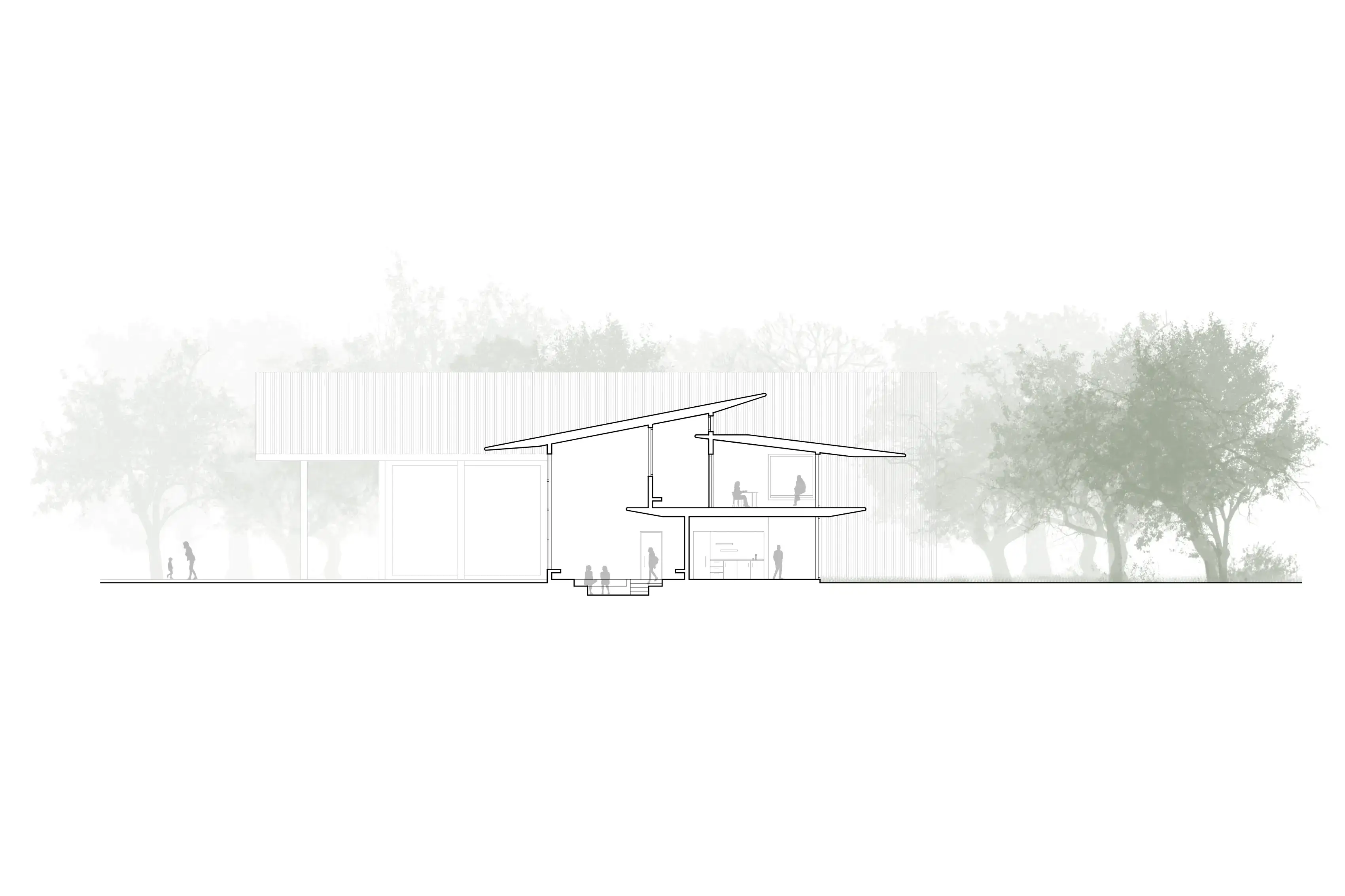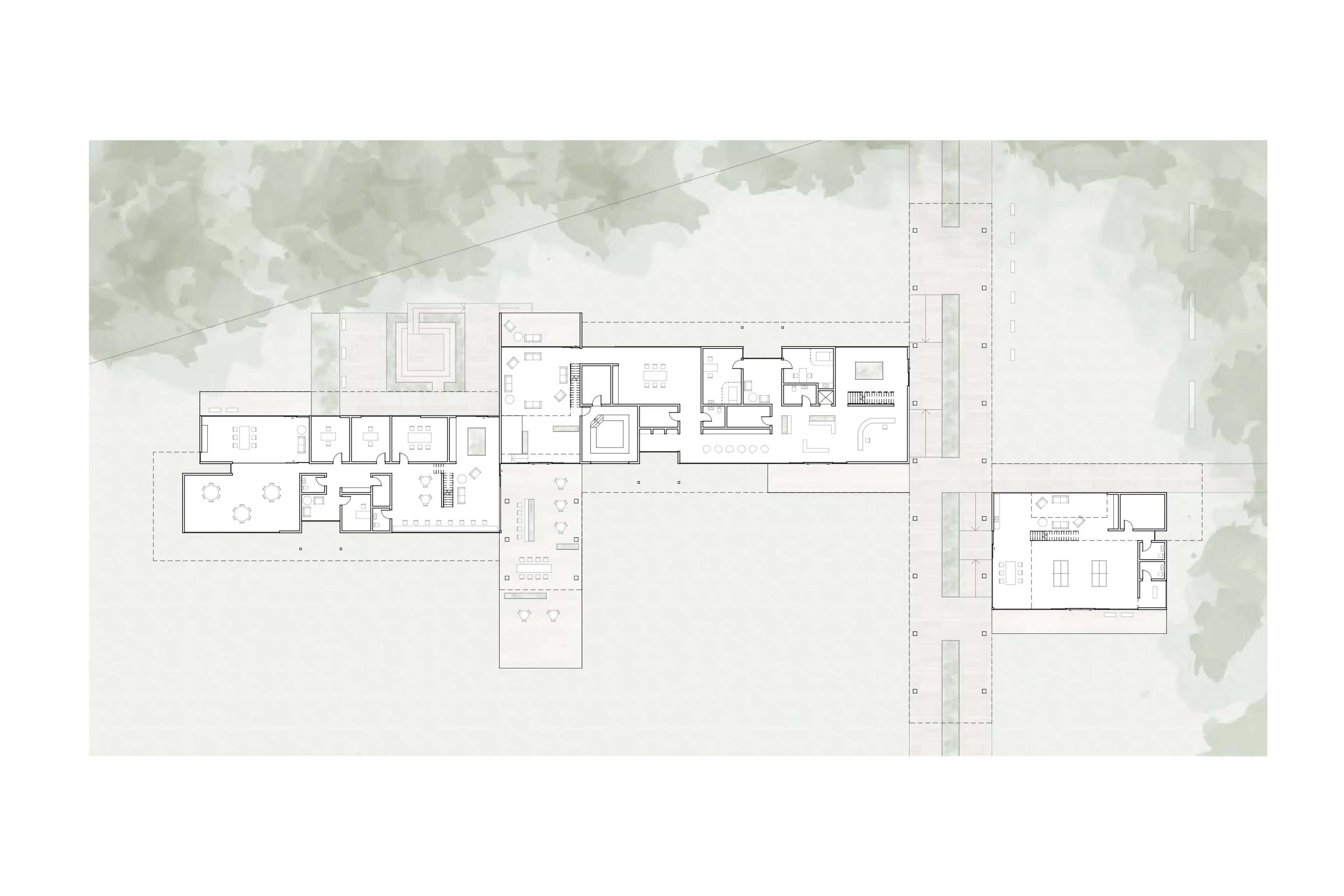 The Canopy aims to create a holist healing environment going beyond traditional clinical healing, through a sequence of escape, dwell and connect. The architecture aims to remove the users from the hustle and bustle of the city and place them into the natural environment, encouraging them to find a moment of stillness to create community connections. The form sits parallel to a tree canopy becoming it's extension and enabling access to the trees from two stories. Below, dapple light shines through the canopy leaves onto the ground under the trees. A level up, the interiors are submersed into the canopy creating a feeling of escape and refuge in the natural landscape. The interior spaces feel warm and cozy, and the exteriors feel serene and calming fostering a comforting environment