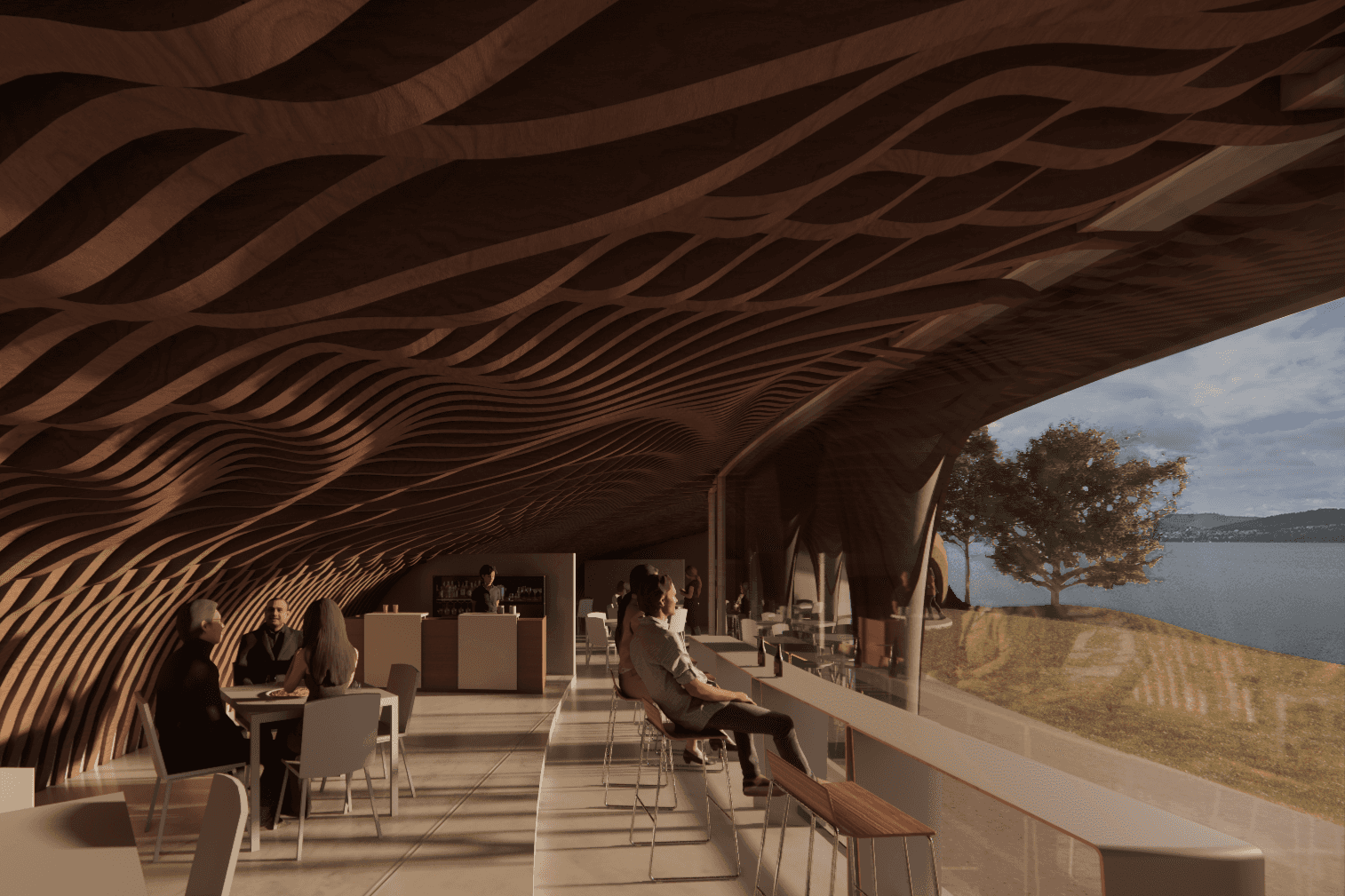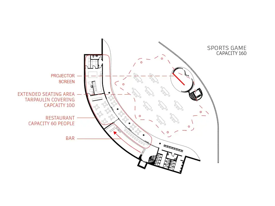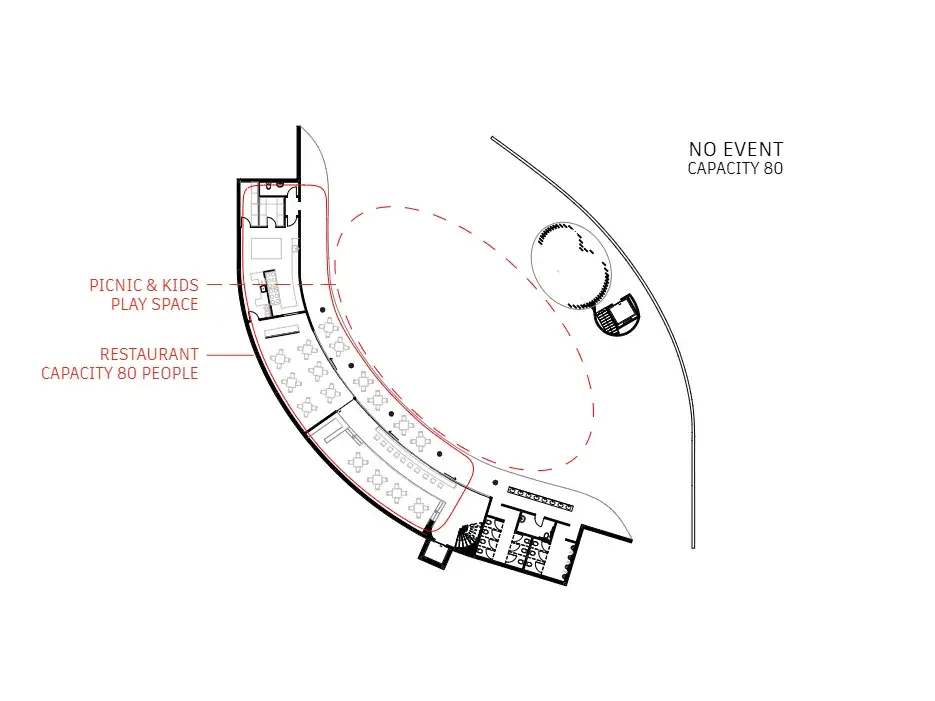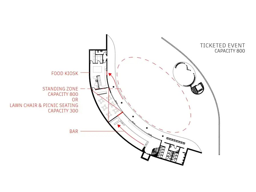 The dynamic cove space draws attention outwards towards the stage. The patterned flowing ceiling creates rhythm and unites the ceiling, walls and columns into a singular structural entity; the space appearing to be carved into the earth. The “hidden venue” is an exclusivity marketing strategy. The multi-purpose adaptable venue allows for consistent funding from the indoor restaurant to maintain the seasonal outdoor event space.
