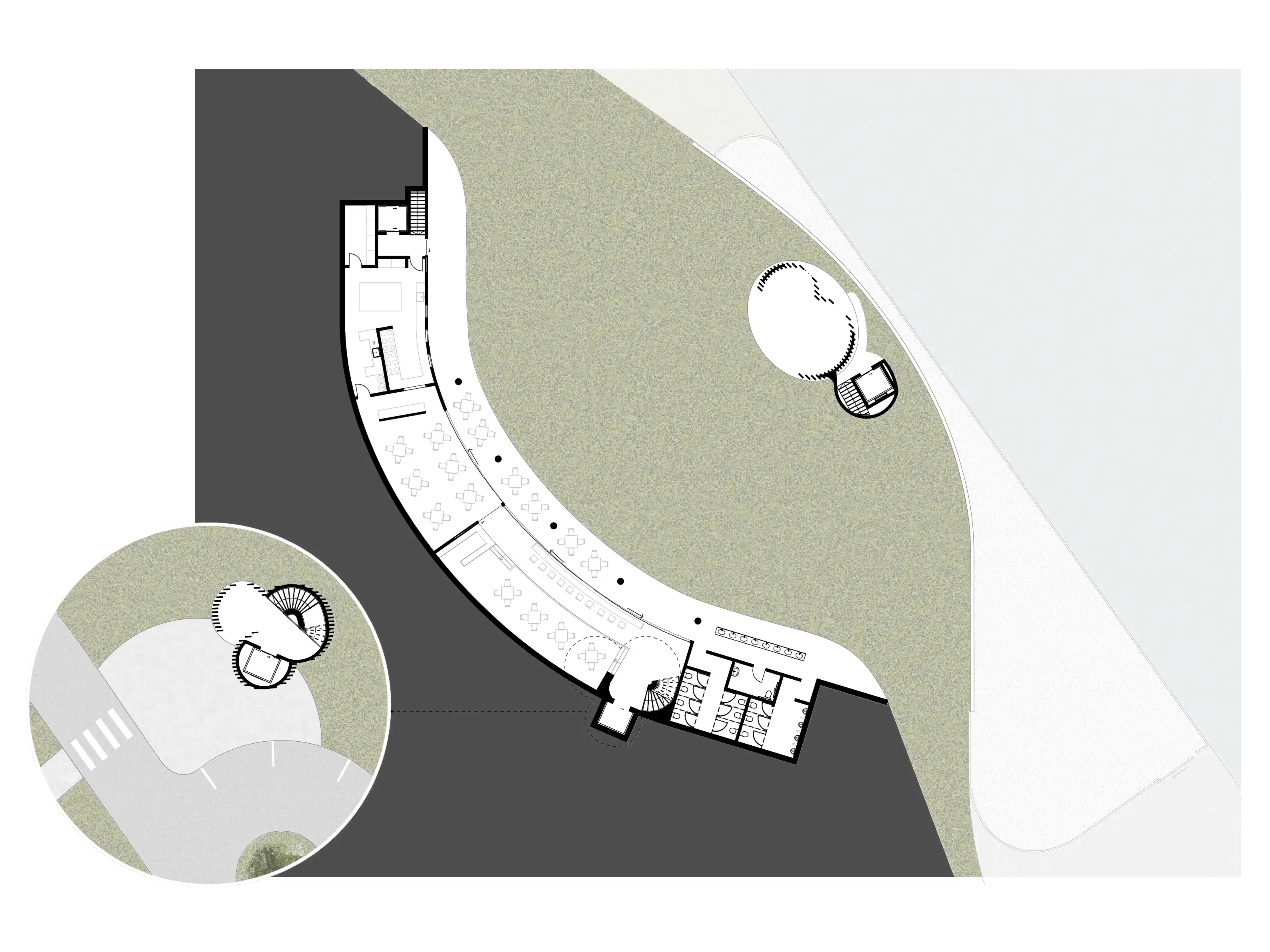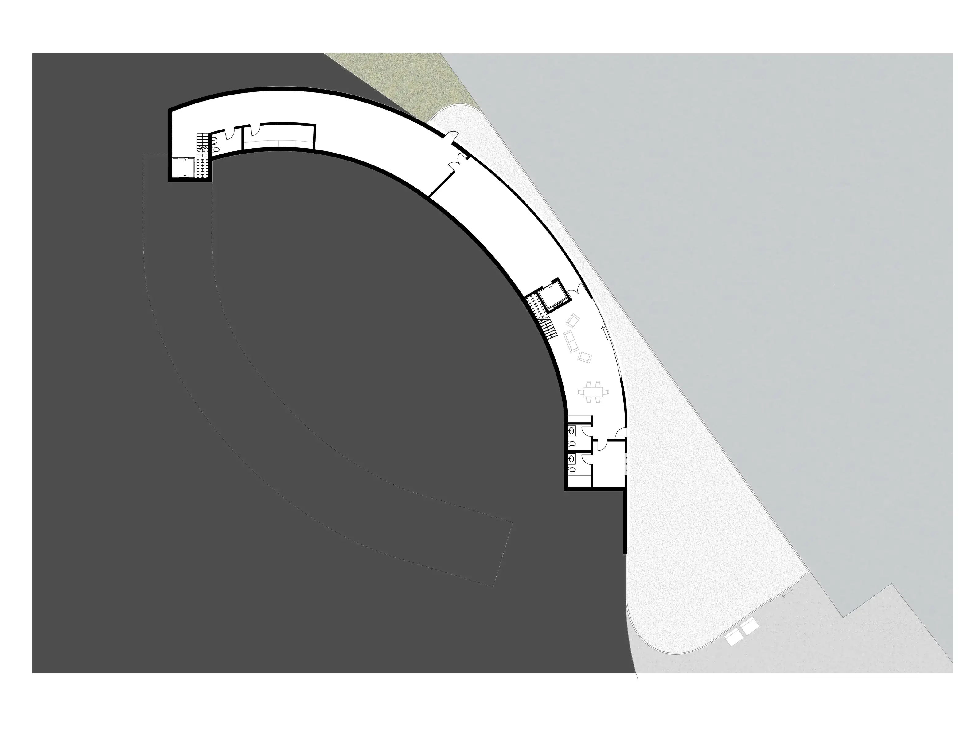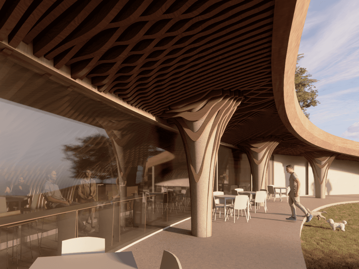 The dynamic cove space draws attention outwards towards the stage. The patterned flowing ceiling creates rhythm and unites the ceiling, walls and columns into a singular structural entity; the space appearing to be carved into the earth. The “hidden venue” is an exclusivity marketing strategy. The multi-purpose adaptable venue allows for consistent funding from the indoor restaurant to maintain the seasonal outdoor event space.