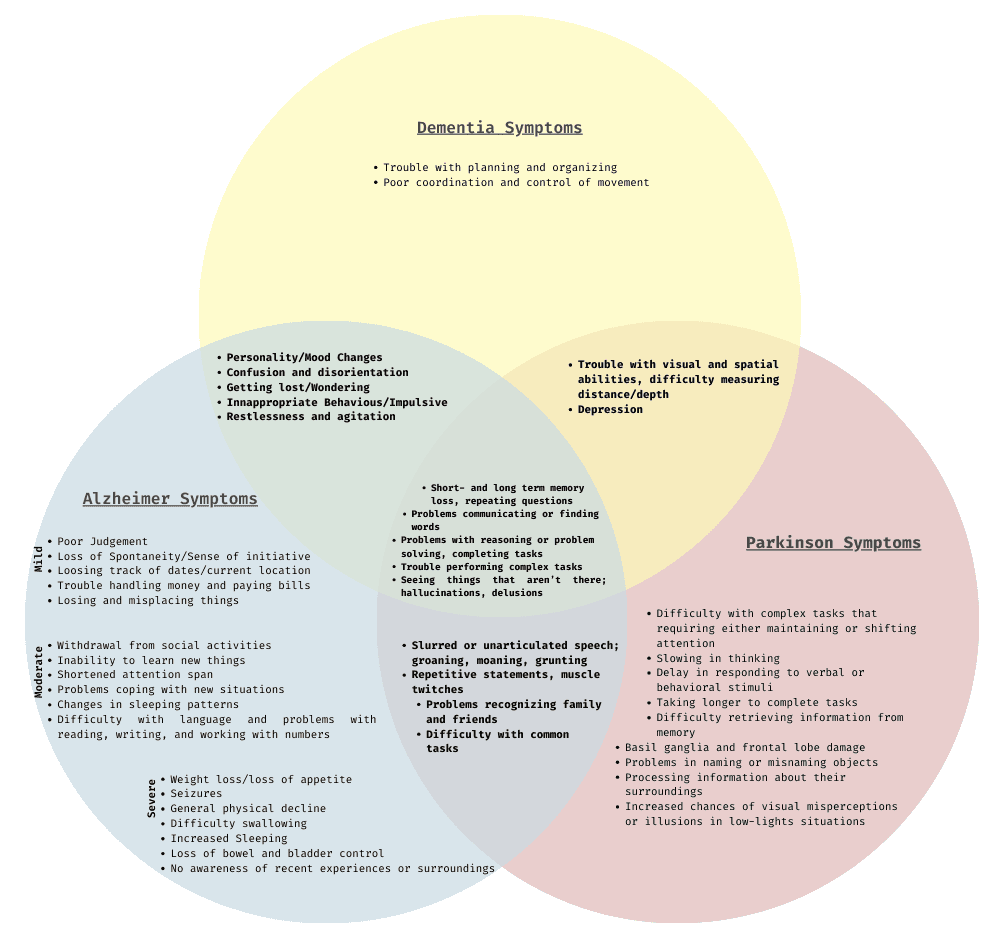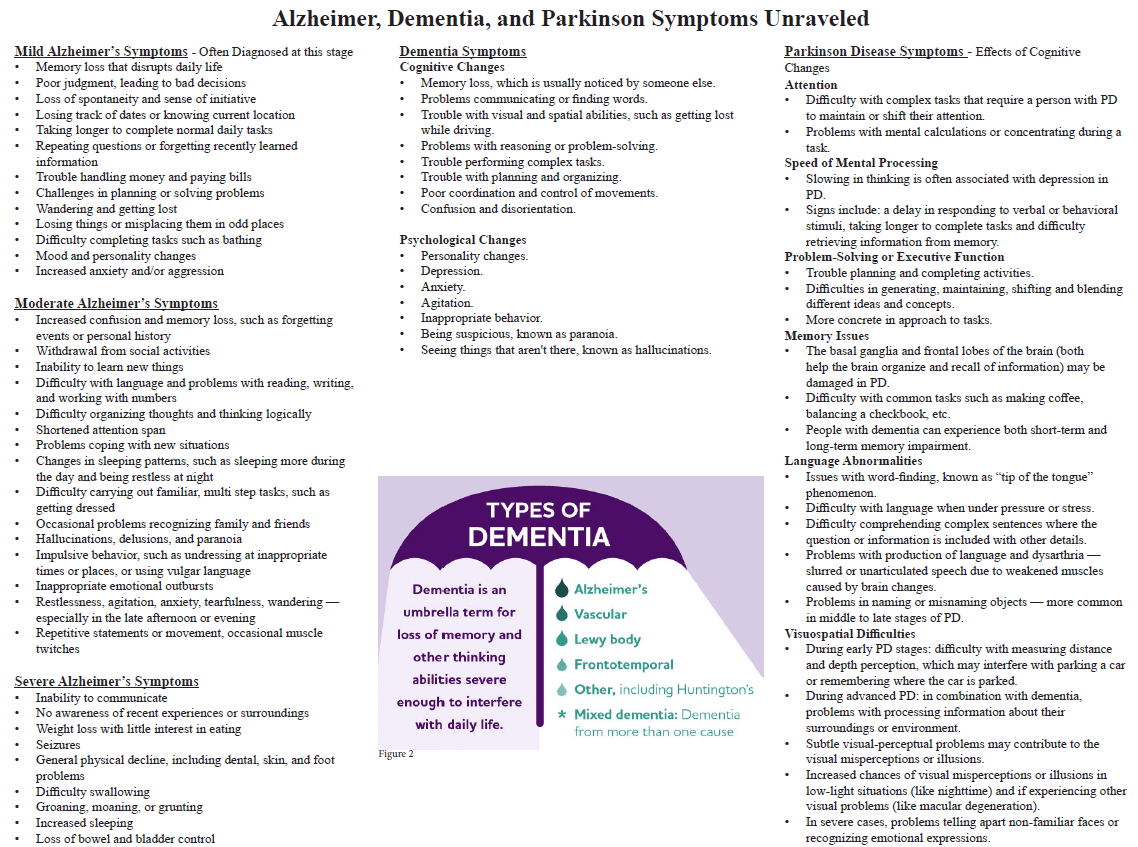 Parkinson disease causes physical symptoms at first. Problems with cognitive function, including forgetfulness and trouble with concentration, may start later. As the disease gets worse over time, about 4 in 5 people develop dementia.