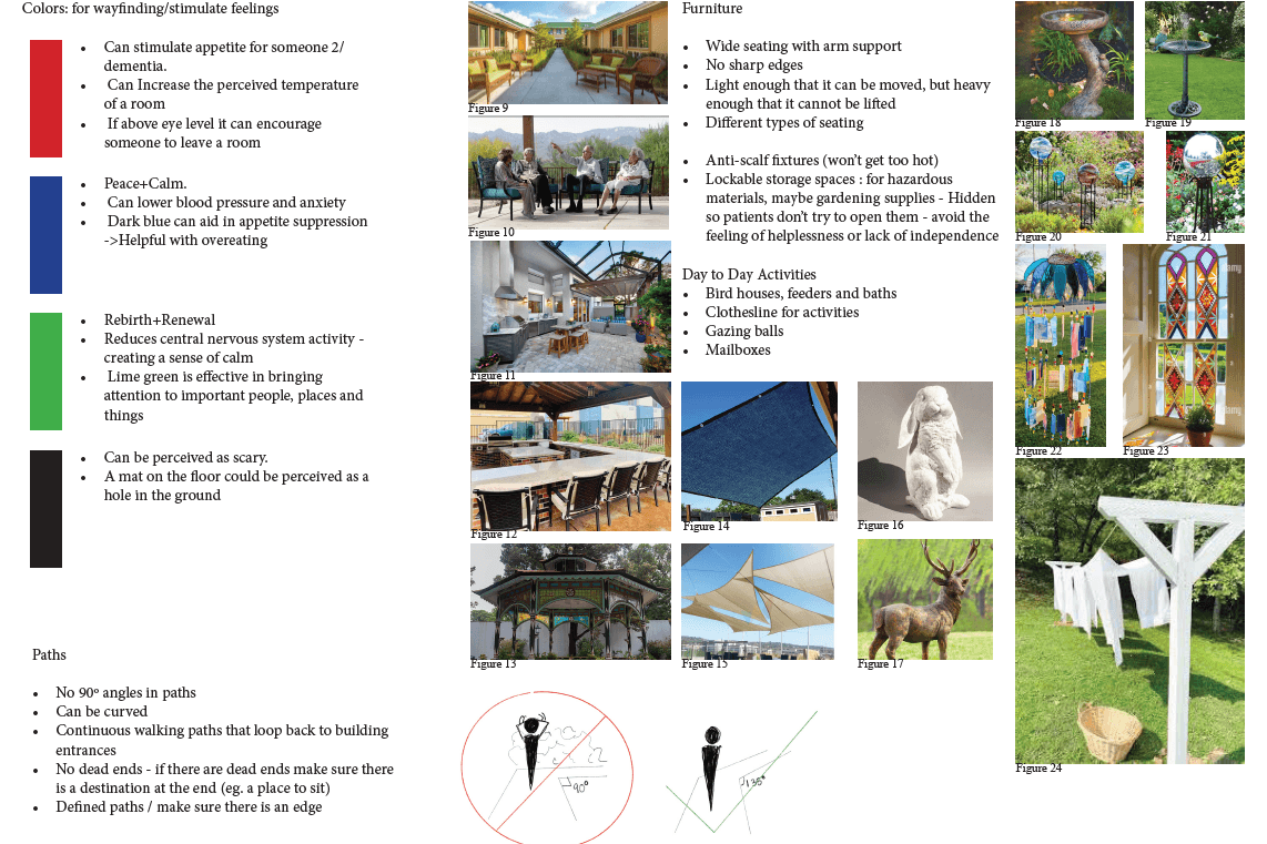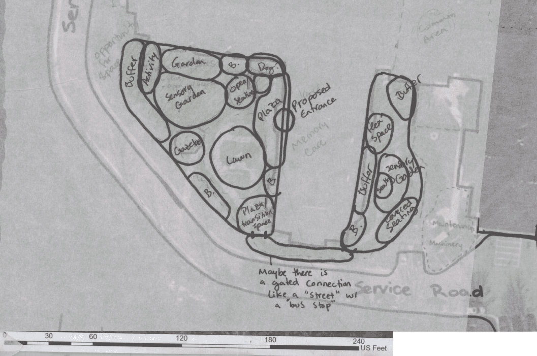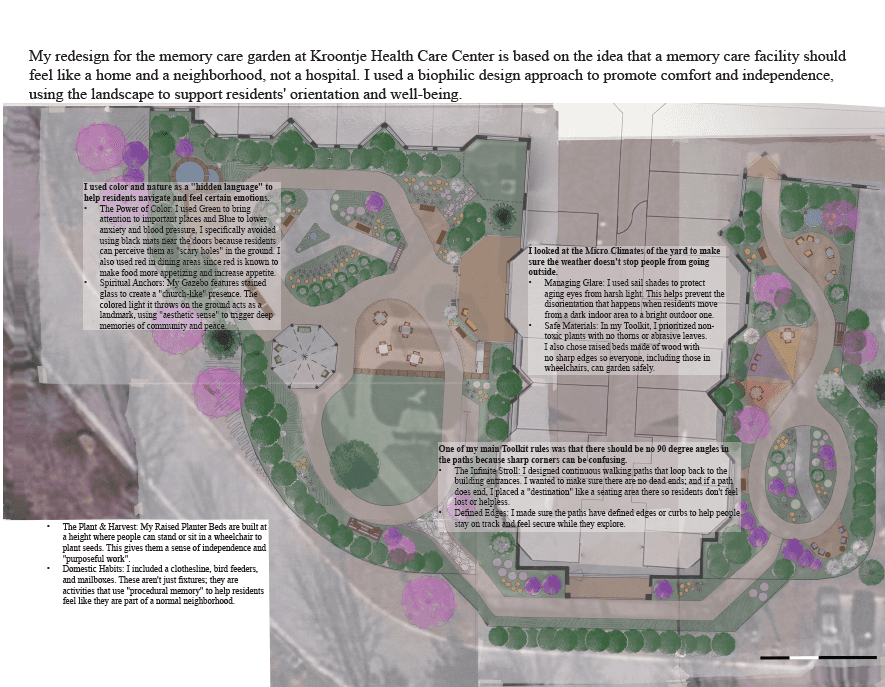 My redesign for the memory care garden at Kroontje Health Care Center is based on the idea that a memory care facility should feel like a home and a neighborhood, not a hospital. I used a biophilic design approach to promote comfort and independence, using the landscape to support residents' orientation and well-being.