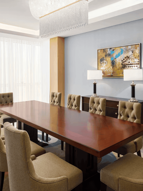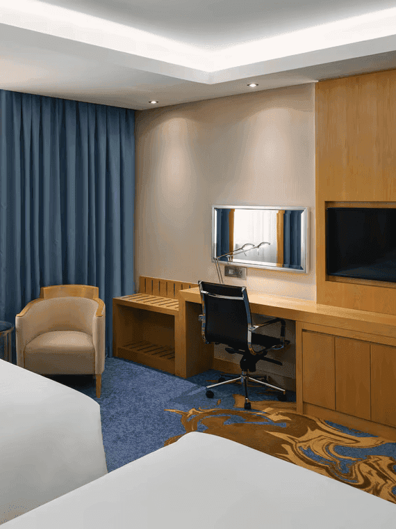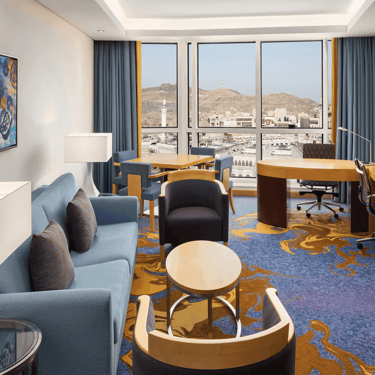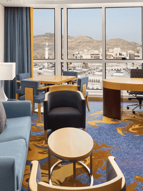 The interior design of Jabal Al Kaaba Hotel in Makkah blends spiritual essence with modern luxury, featuring elegant Islamic-inspired lobbies, serene guest rooms, refined dining areas, and tranquil prayer spaces. Using premium materials and custom furnishings, the design creates a harmonious environment that elevates both comfort and spirituality for every guest.