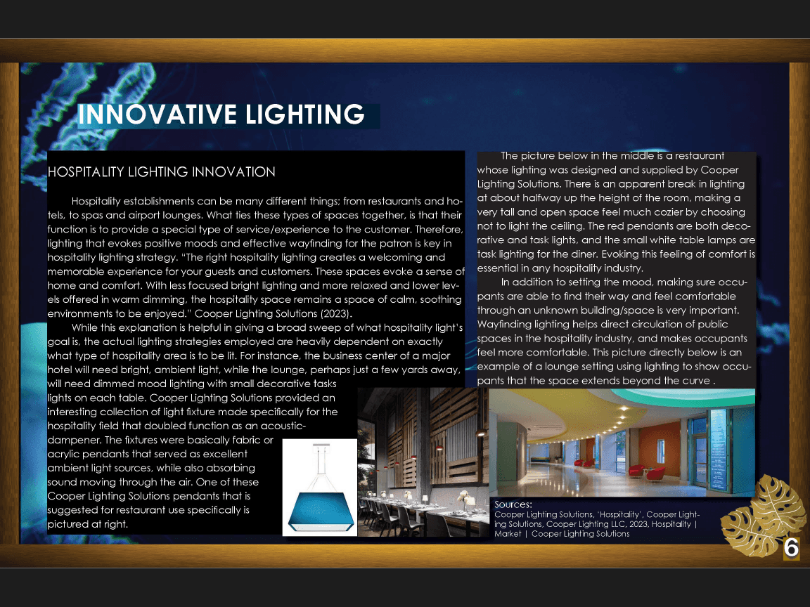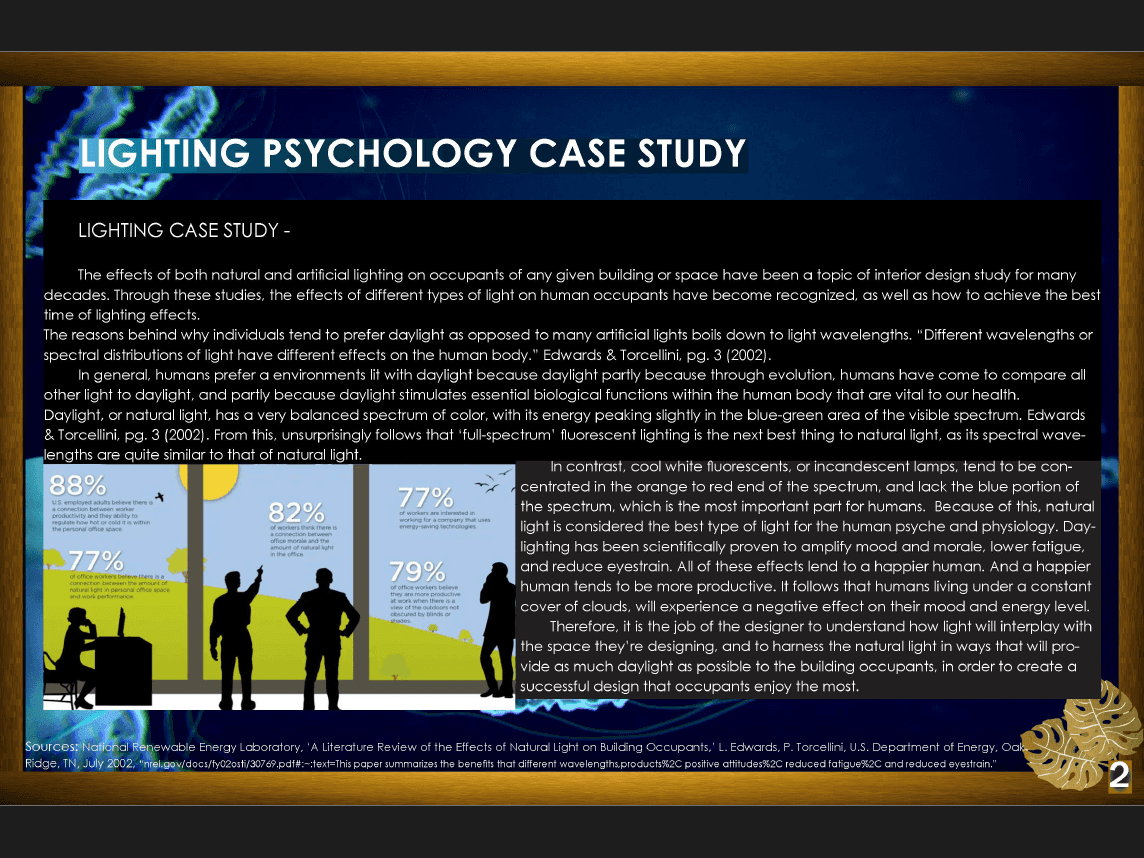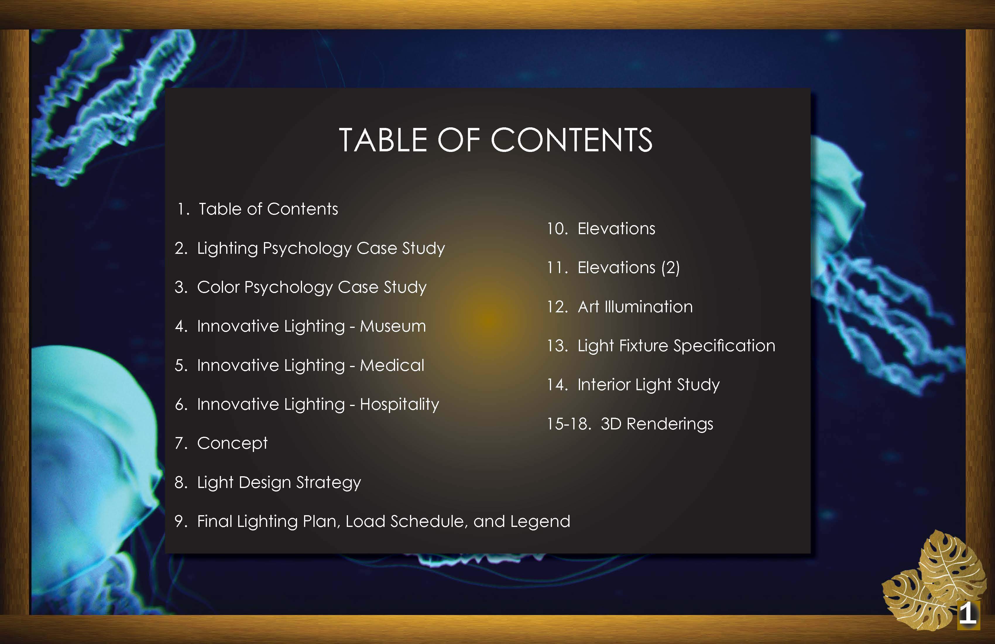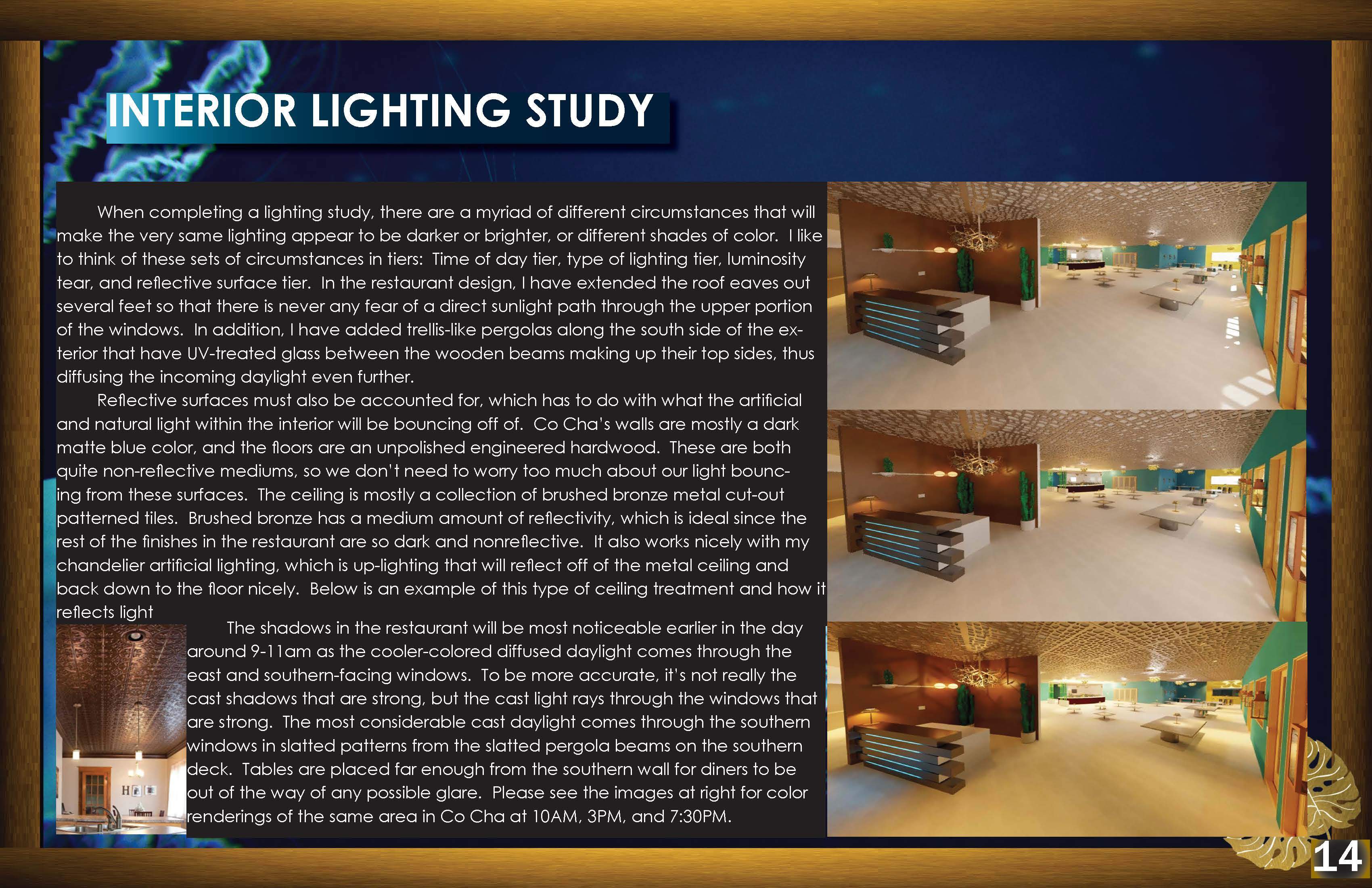 The project was a great introduction to interior lighting design. The biggest take away was understanding the impact daylight can have on interiors, and how to diffuse the light in a manner consistent with the concept of the interior. Looking back at this project now, the lack of negative space on my presentation pages bothers me, but of course, this is indicative on my progression in design documentation.