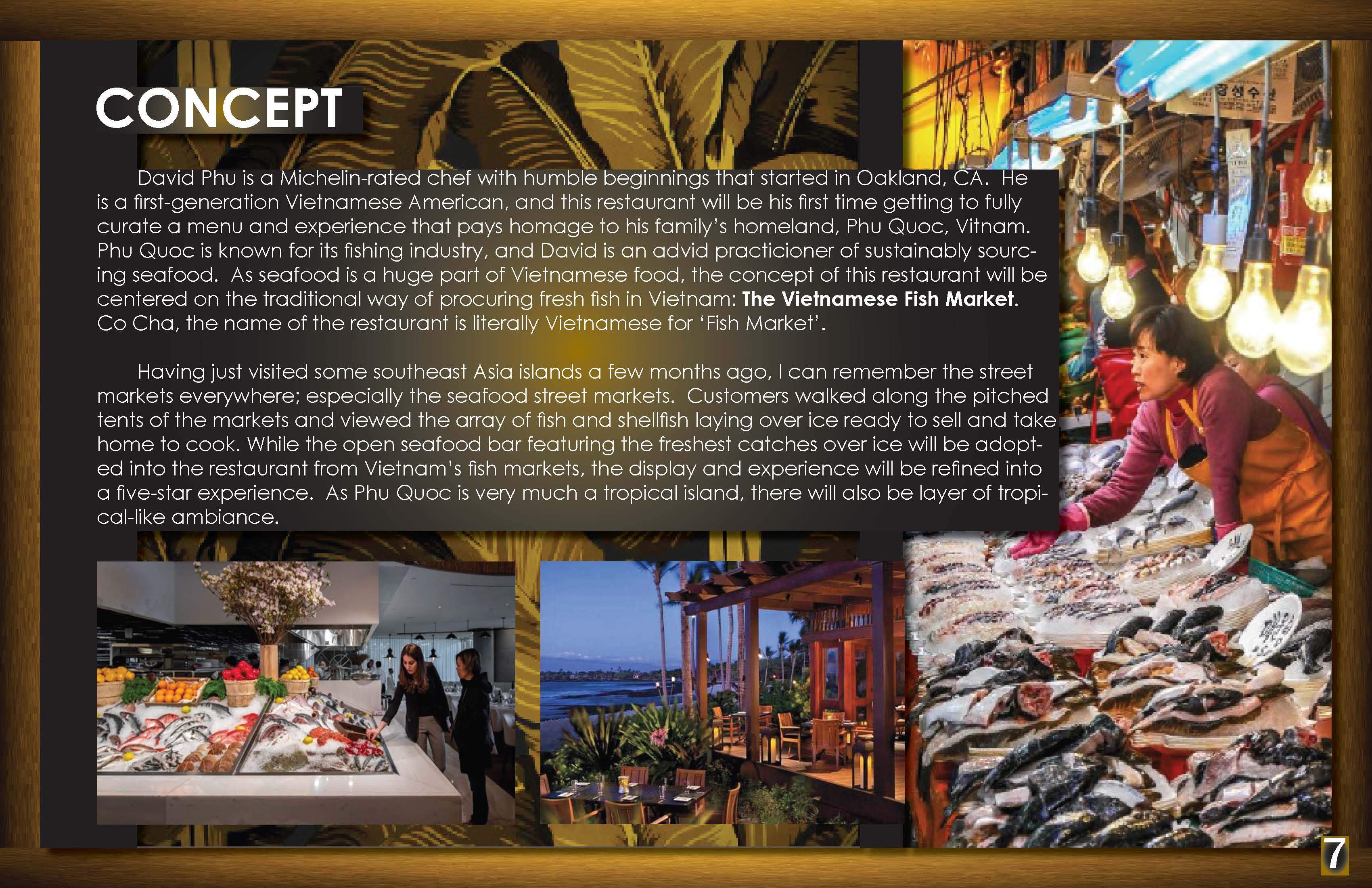 The concept for this project, Vietnamese Fish Market, was selected after a brainstorming session, detailed below. At right is the concept statement and rationale behind the selected name for the restaurant: Co Cha.