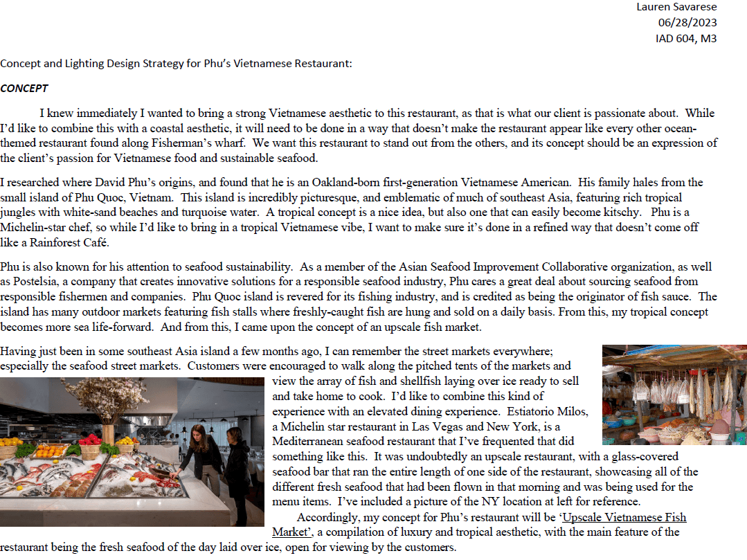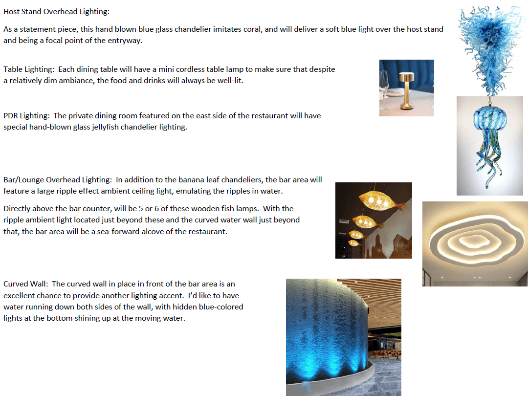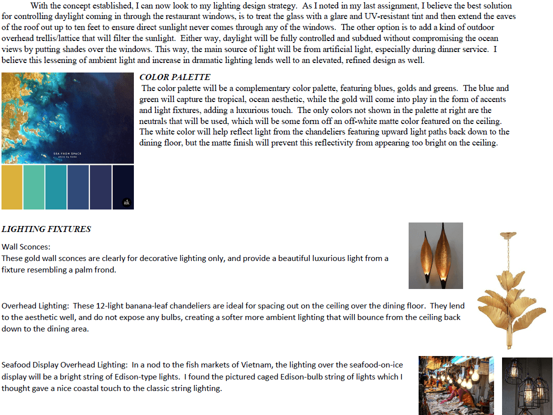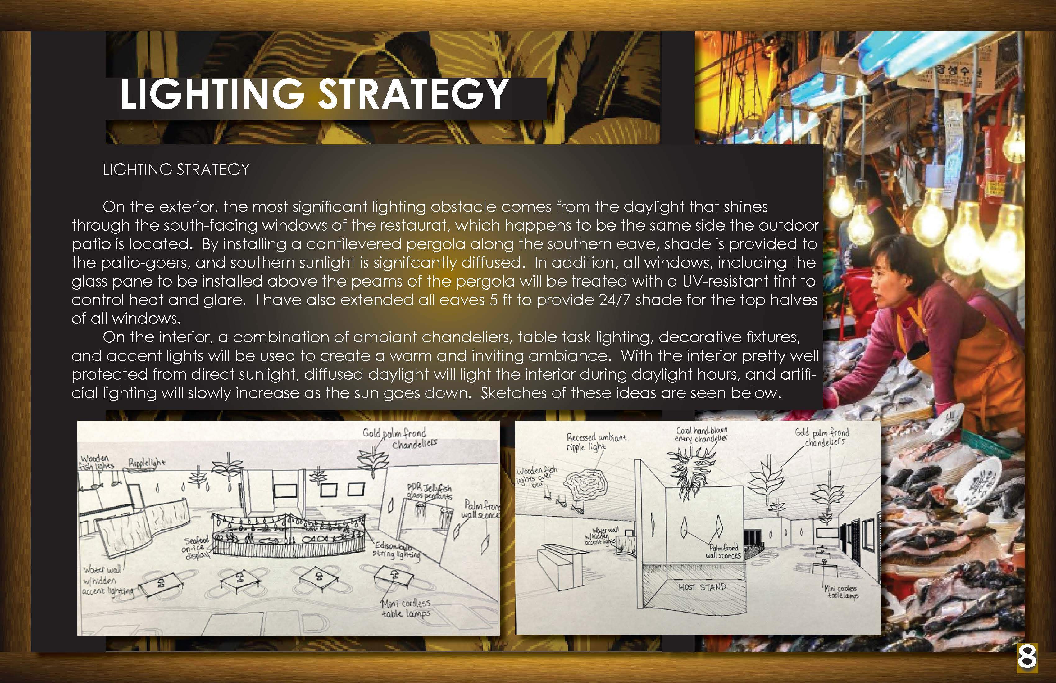 The first half of this project is purely lighting study research. In the second half, I establish my concept for the restaurant, the lighting strategies I intend to use, and finally plans, elevations, specifications and renderings of the completed front-of-house area of the restaurant.