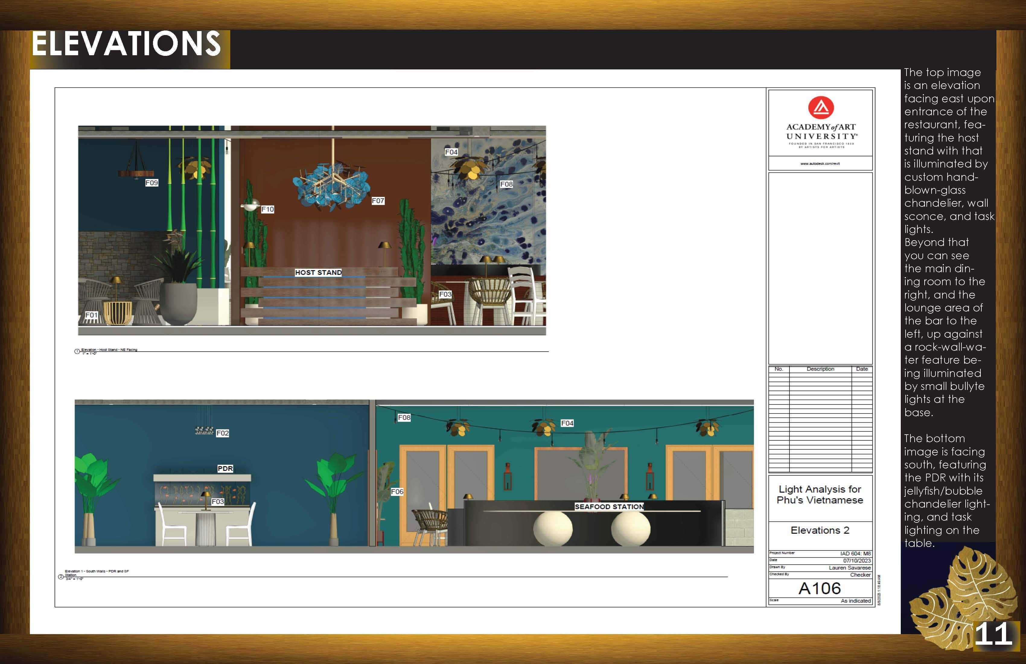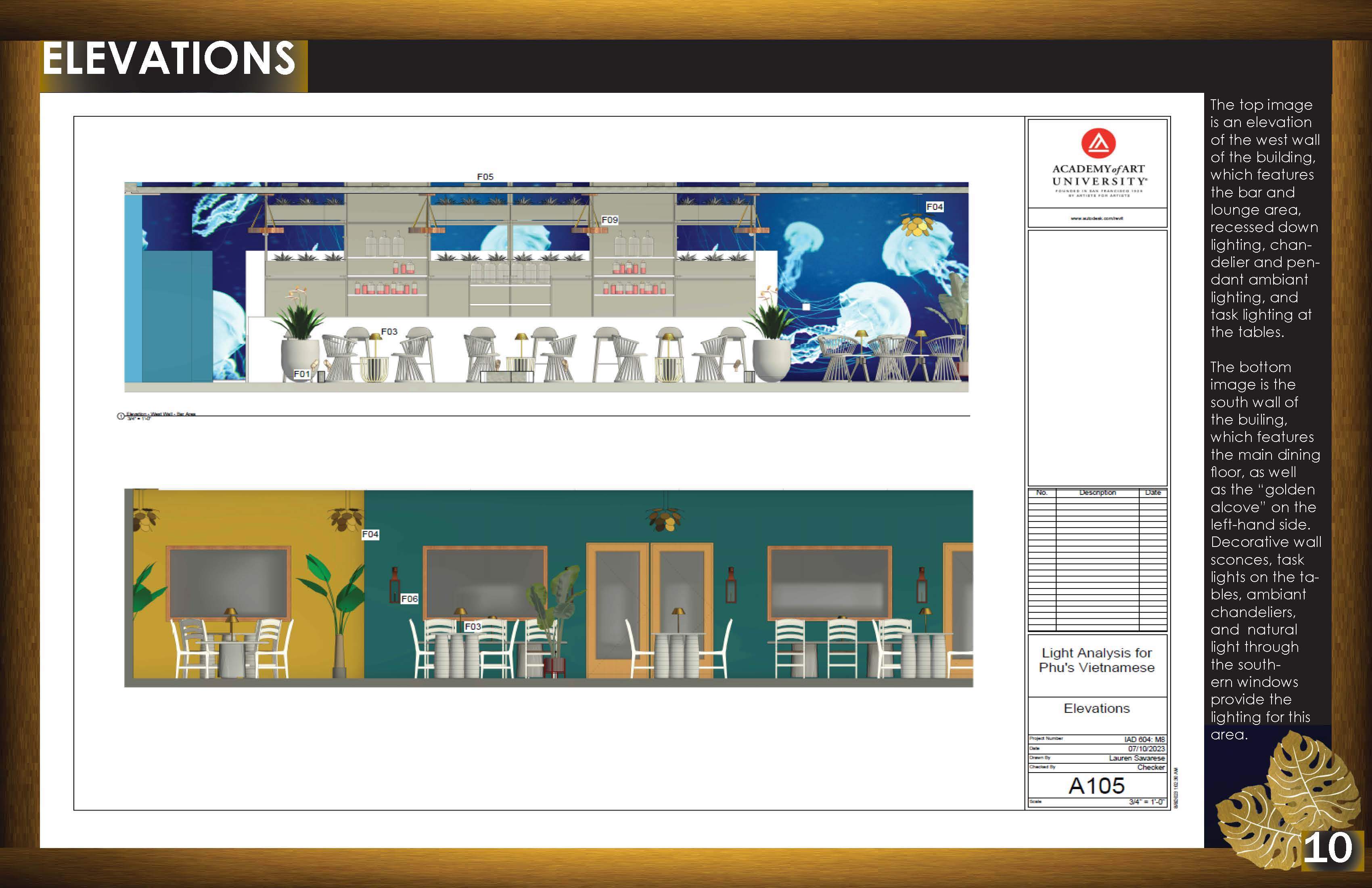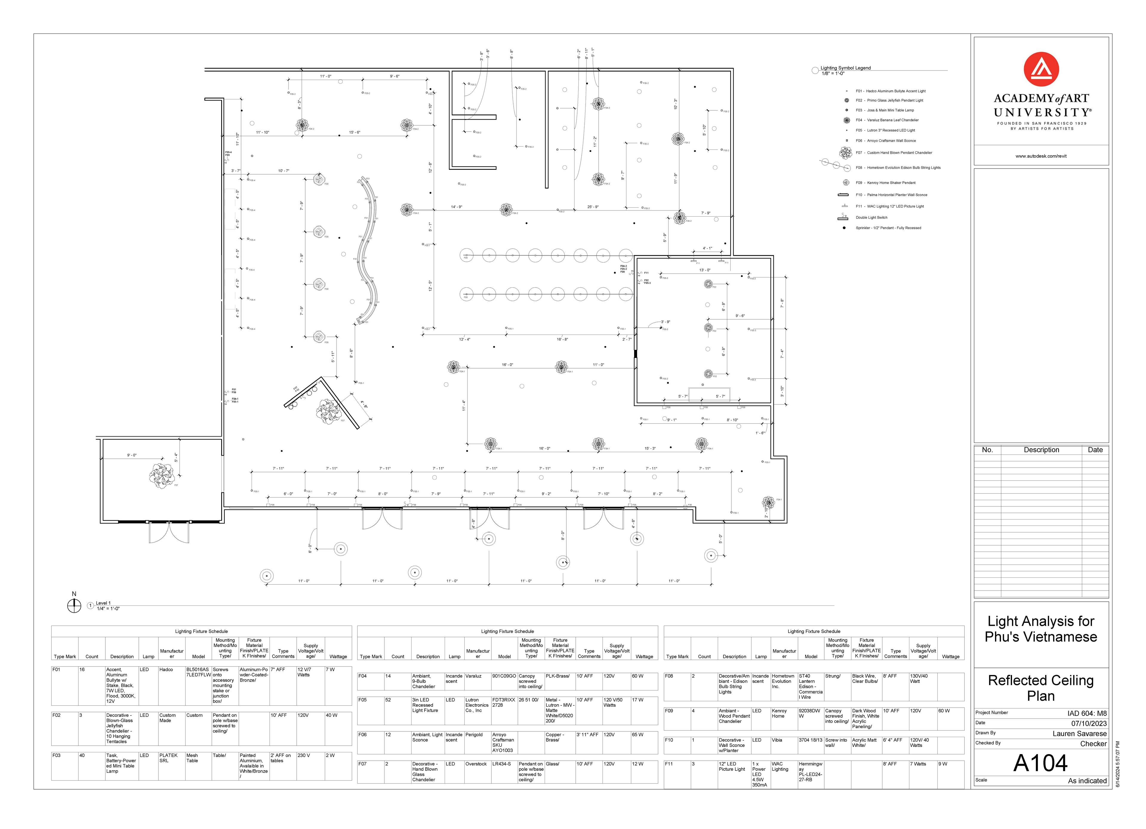 The first half of this project is purely lighting study research. In the second half, I establish my concept for the restaurant, the lighting strategies I intend to use, and finally plans, elevations, specifications and renderings of the completed front-of-house area of the restaurant.