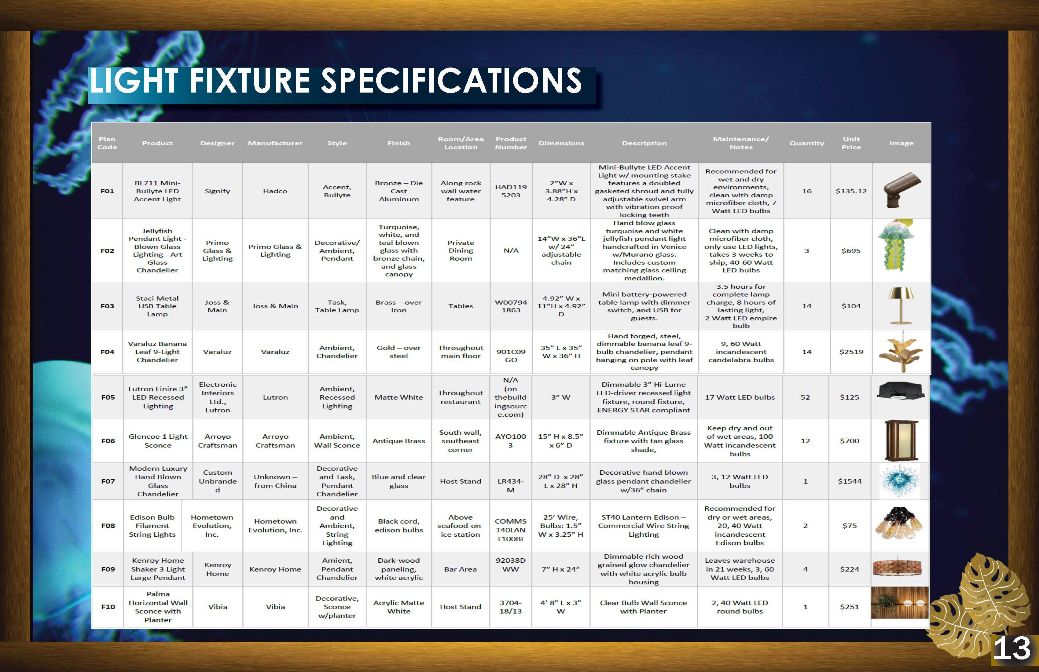 At right in the specification list of all non-recessed lighting found on the reflected ceiling plan. Below, is a lighting study showing how the restaurant interior interacts with morning, afternoon and evening daylight. Material and fixture choice is also explained as they relate to lighting strategies.
