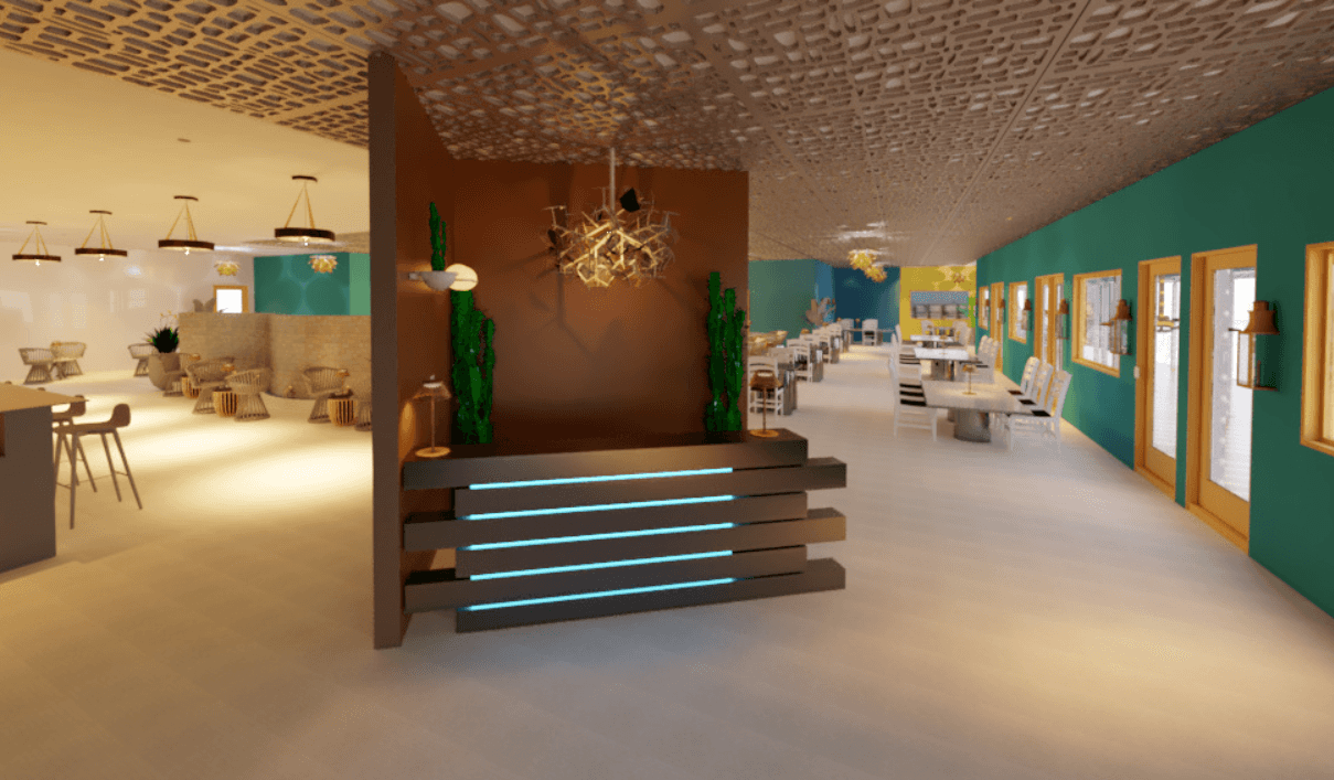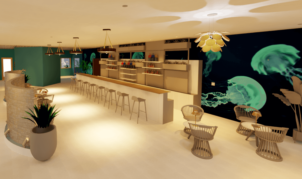 Using Revit's Cloud Rendering, the following images were generated from my Revit model of the restaurant. At right, the south seating area, with views of the seafood station and bar can be seen. Below, is the Southwest seating alcove, the host stand upon entry, and the seafood station facing north, respectively.
