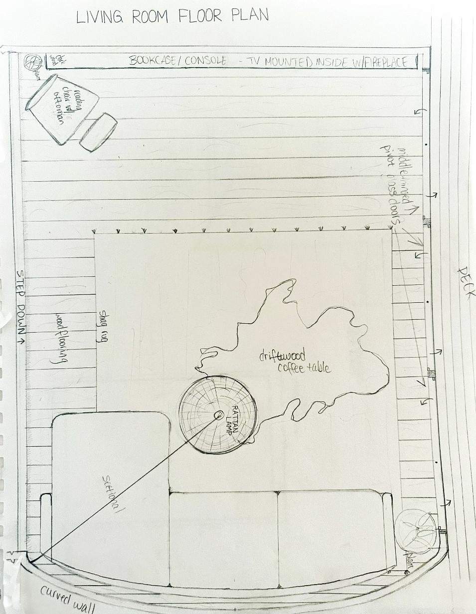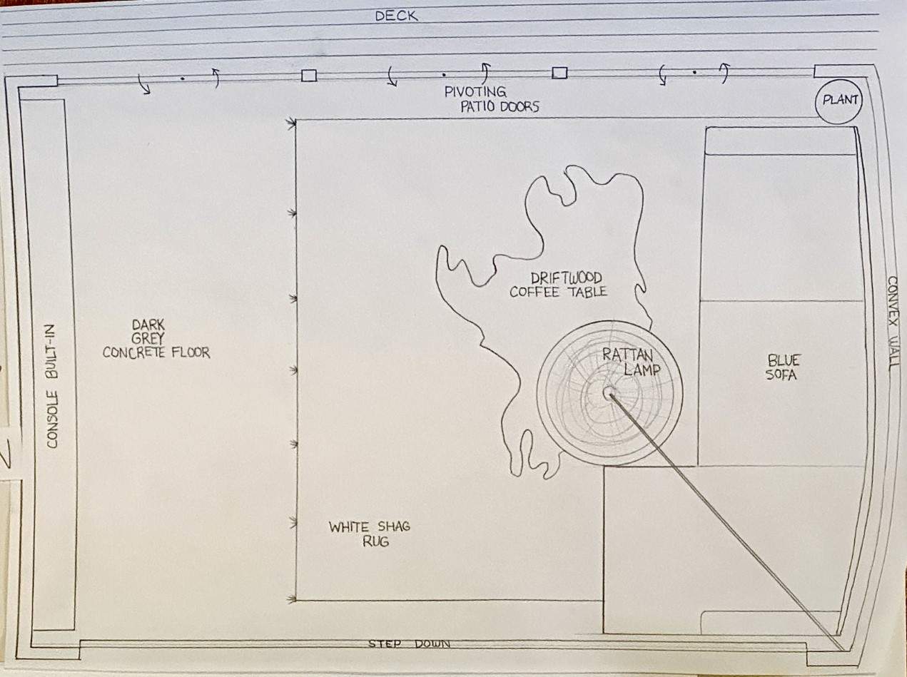 My initial floor plan sketch is seen at right. I chose to design a residential living area, adjacent to a patio on the beach. The top/north wall features a built-in that houses the TV, a fireplace and lots of storage shelving. The left/west side is completely open with a single step that leads up to the other parts of the house, creating a sunken living room. The right/east wall is mostly large pivoting floor-to-ceiling- glass doors that lead to the outdoor patio. The bottom/south wall is curved to give the room a soft look.