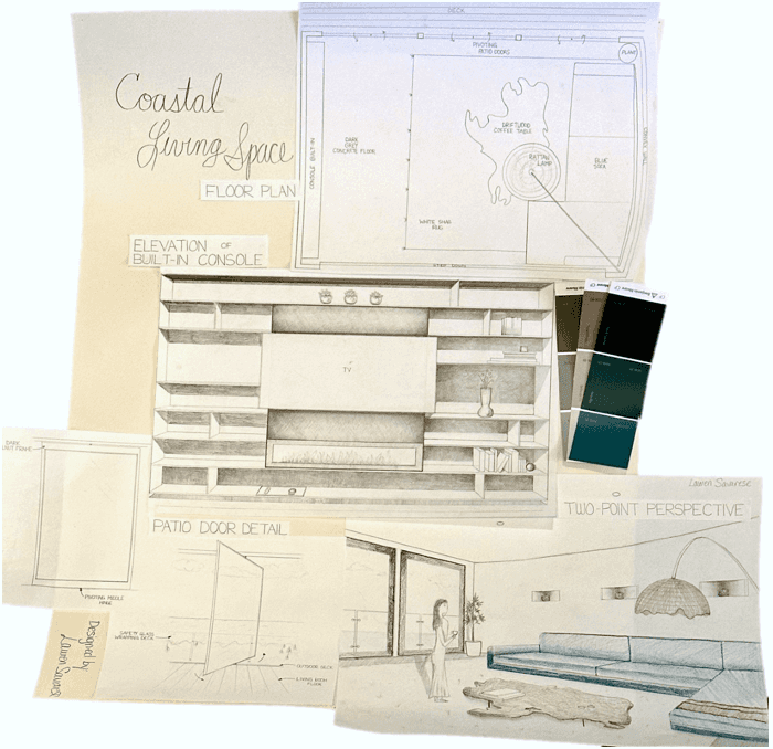 This was a great project in developing my perspective sketching and line weight skills. For project submission, I created a collage of my floorplan, detail, elevation, and perspective sketch along with a sample color swatch that I envisioned the space having.