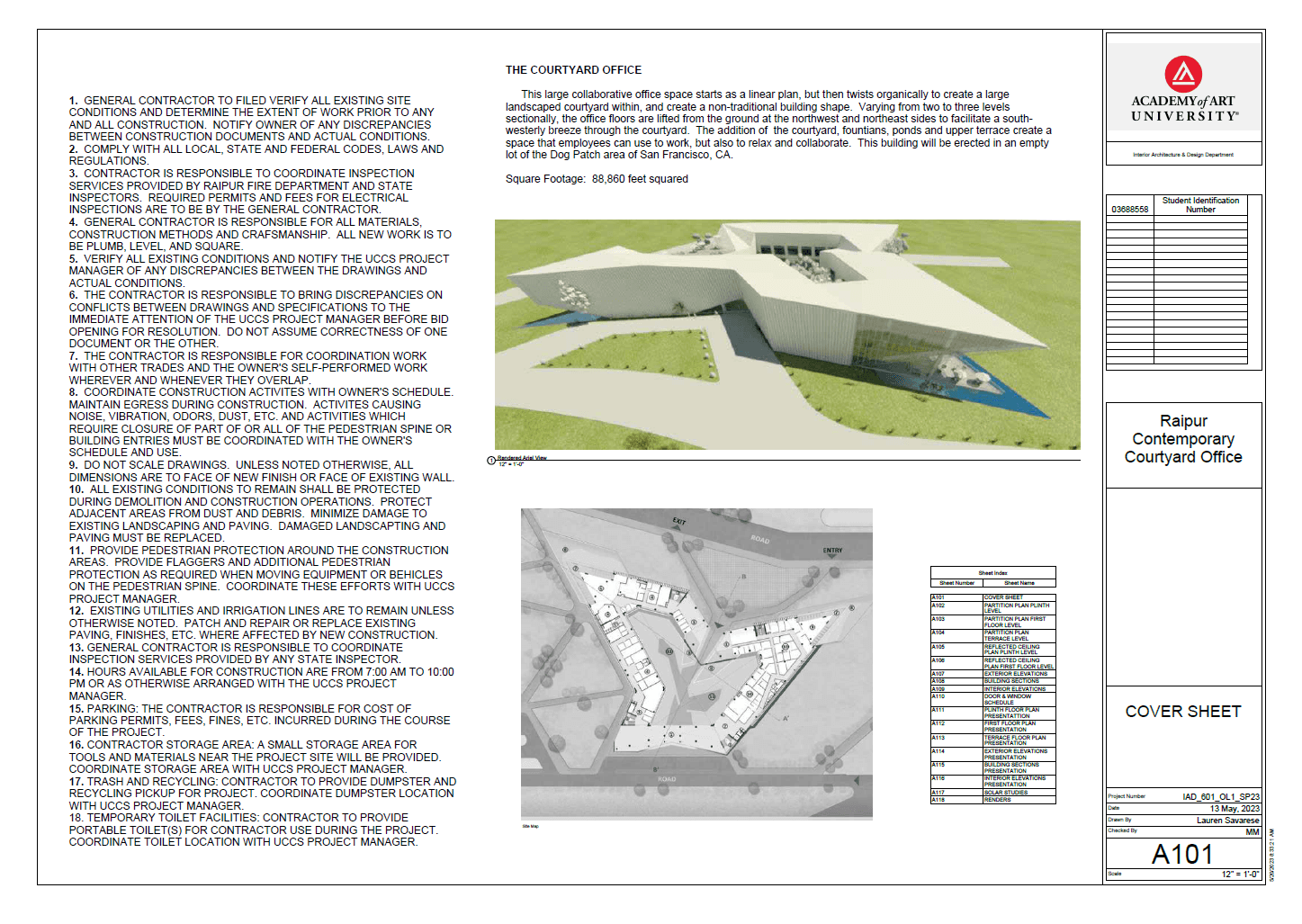 This project marked a great progression in my learning of how to manipulate organically-shaped masses in Revit. While the interior details are sparse, the project illustrates my knowledge in contract document format, and core practices of building within Revit software.
