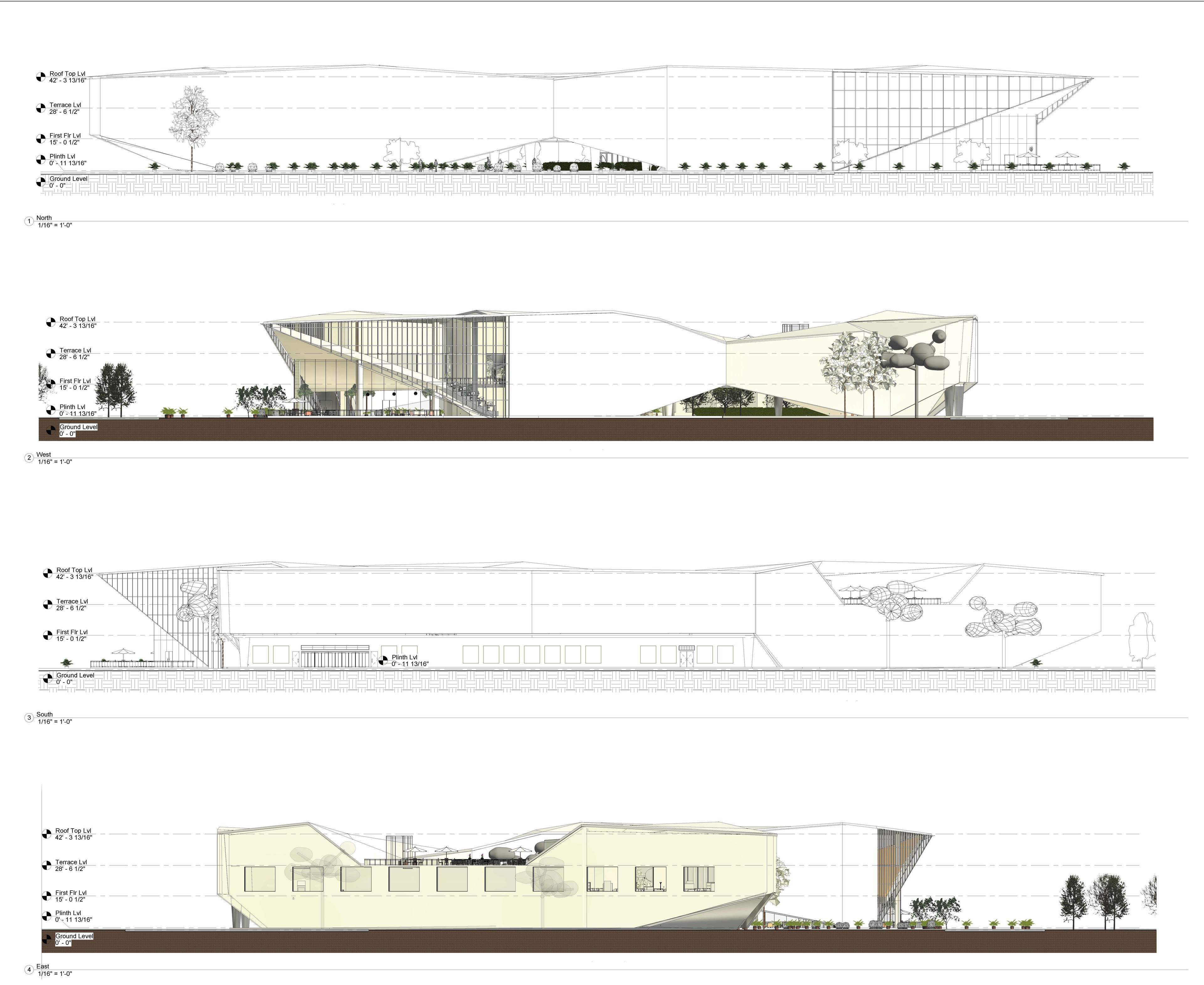 These exterior sections show the building from each direction, and mark where each level cuts through the interior.