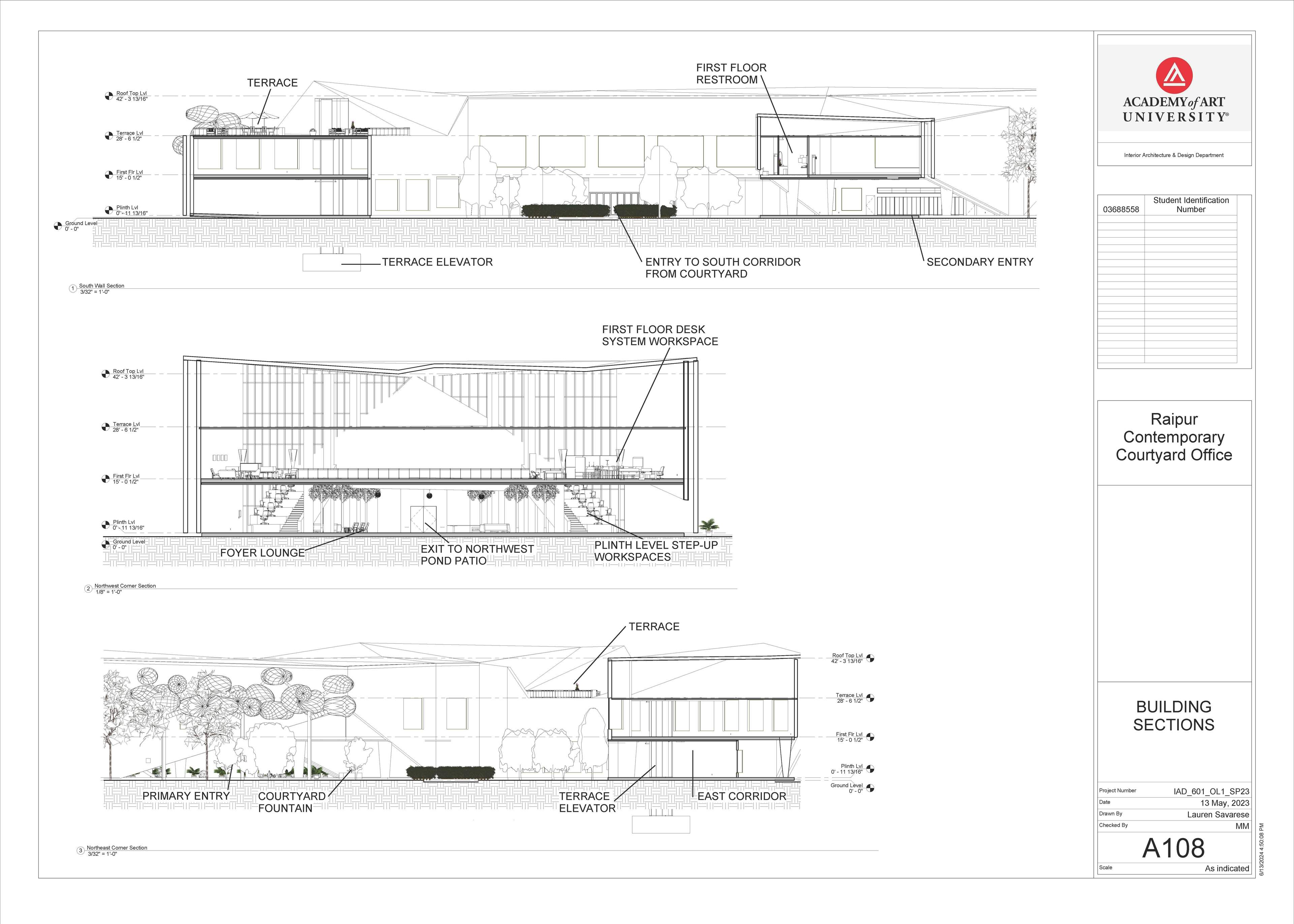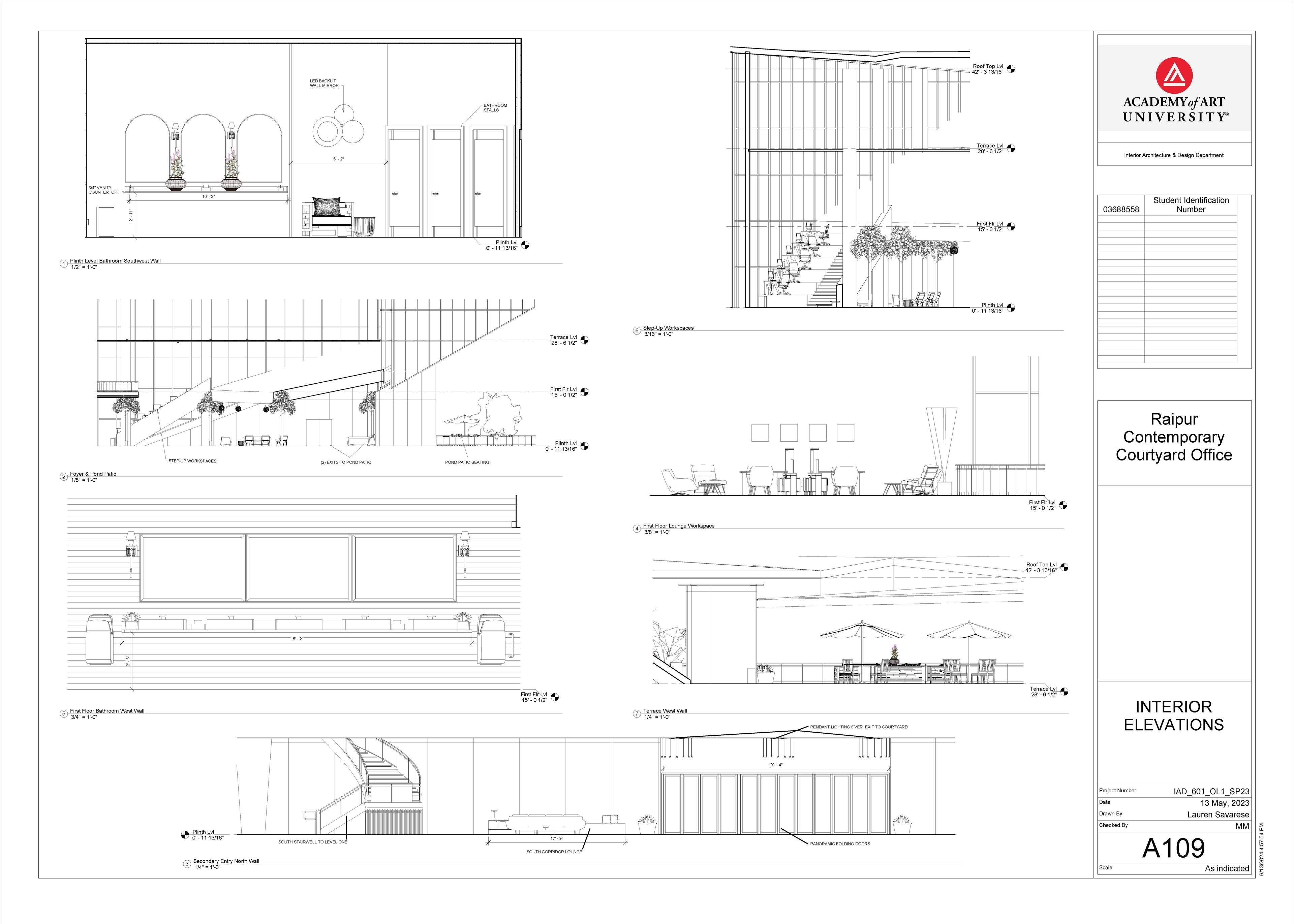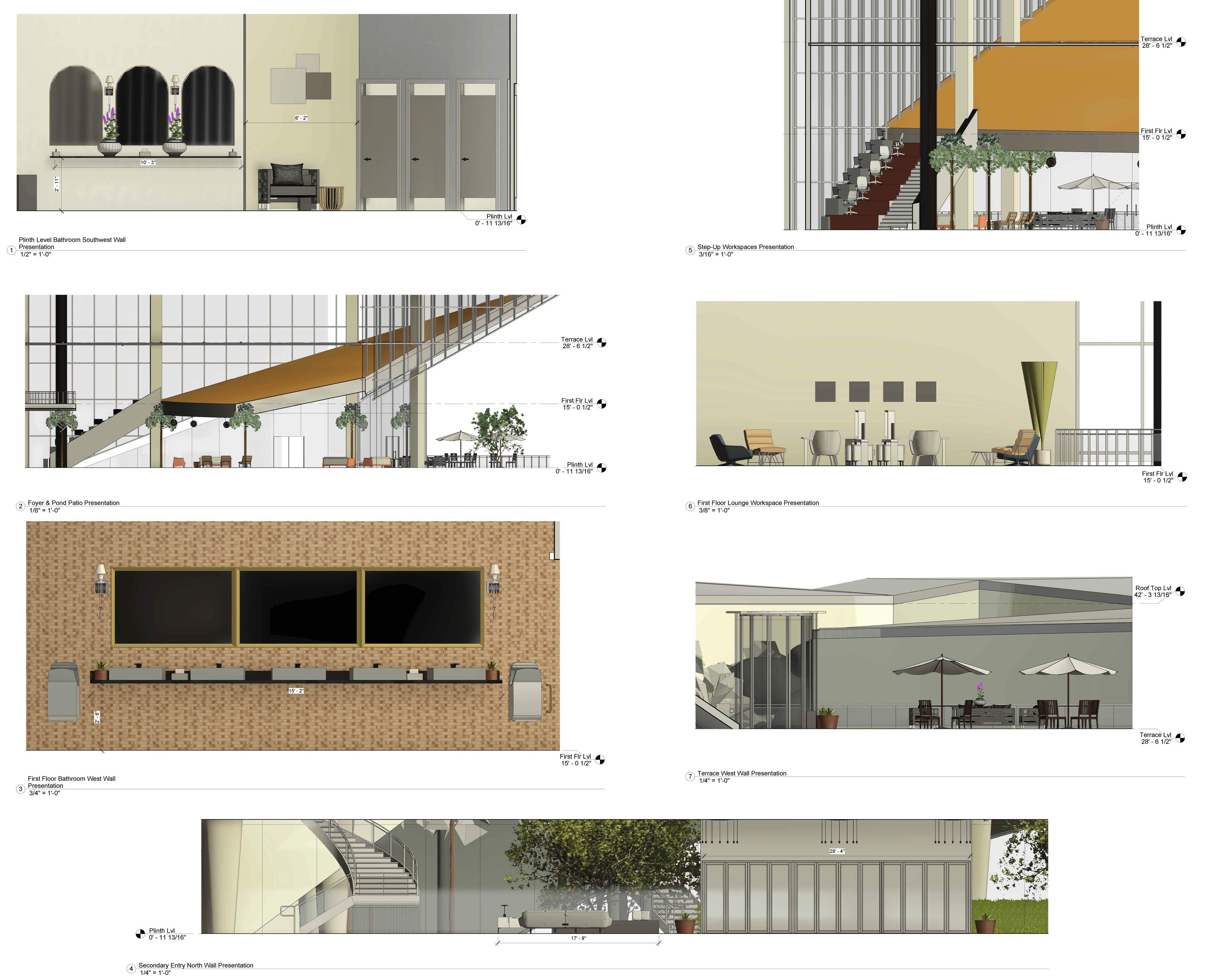 Following are interior/exterior building sections as well as interior elevations that showcase the FF&E selections for the respective spaces. Important dimensions of fixtures within the elevation are included.
