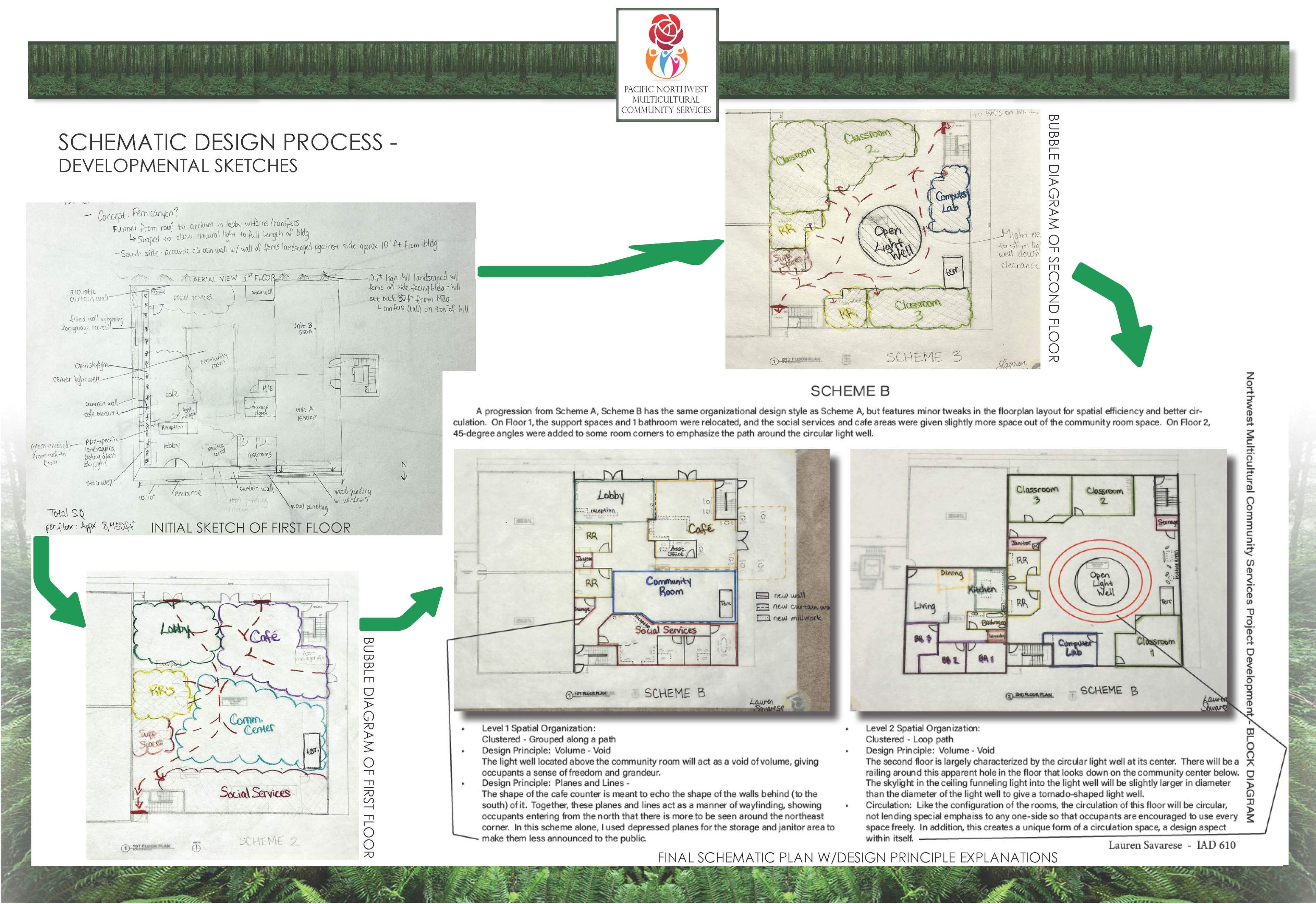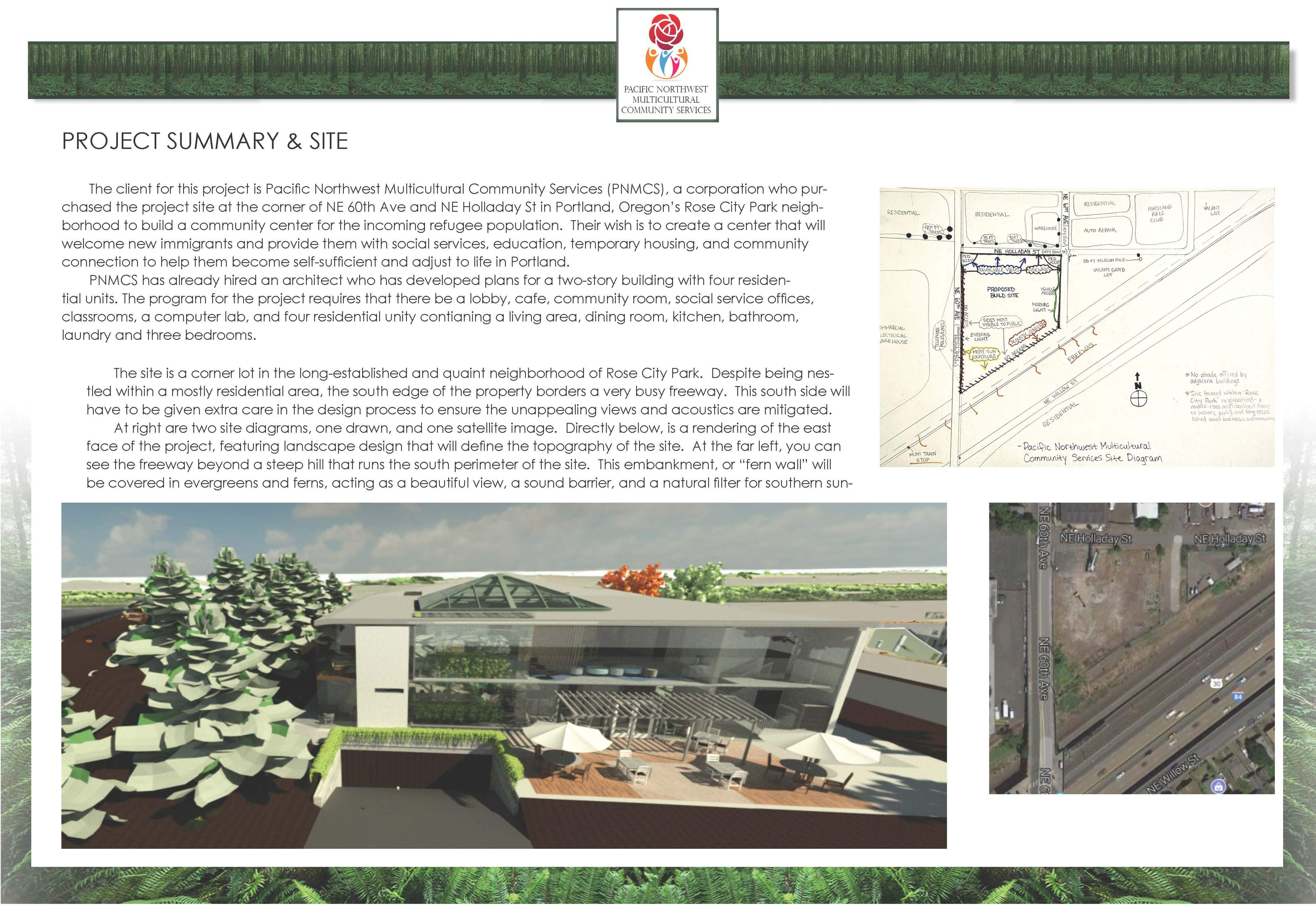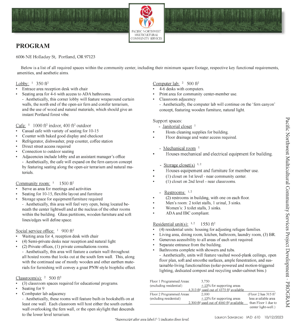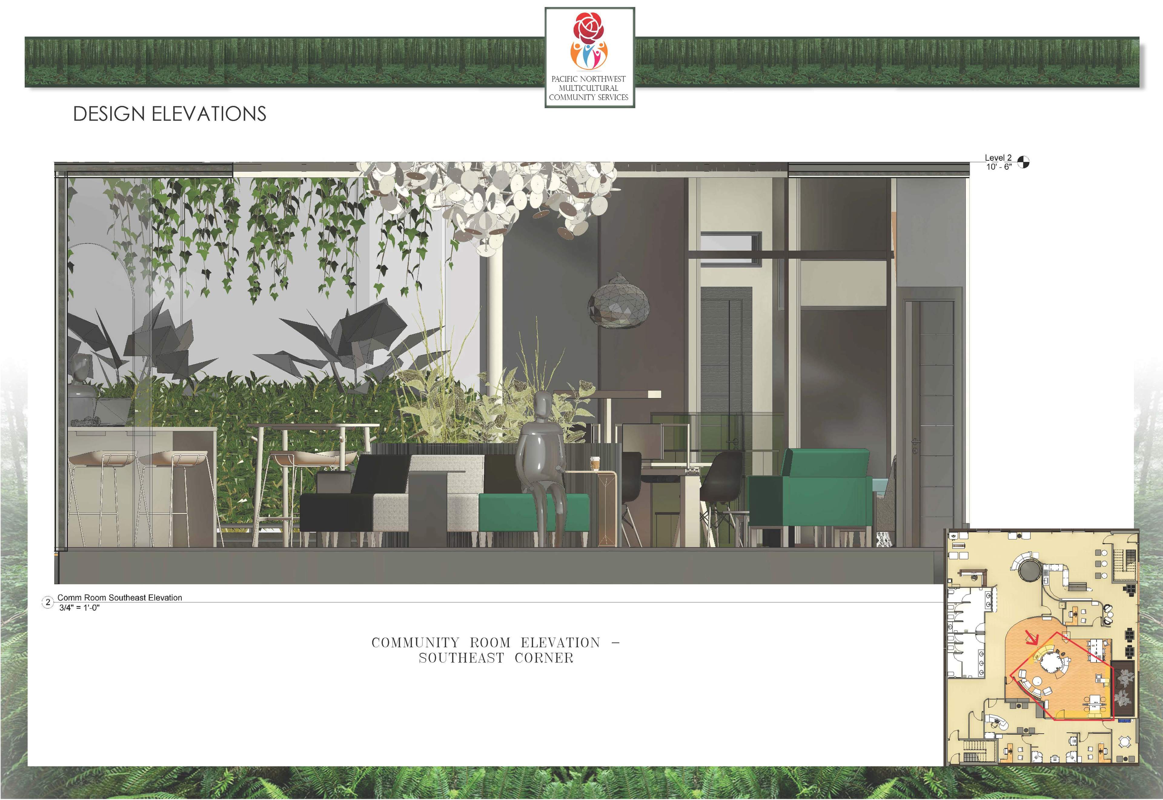 This project involves the spatial design of a community center in a rural neighborhood of Portland, OR, for client, Pacific Northwest Multicultural Community Services. The community center is intended to welcome new refugees and provide them with a space for social services, education, job training and community connection as they adjust to life in a new city.