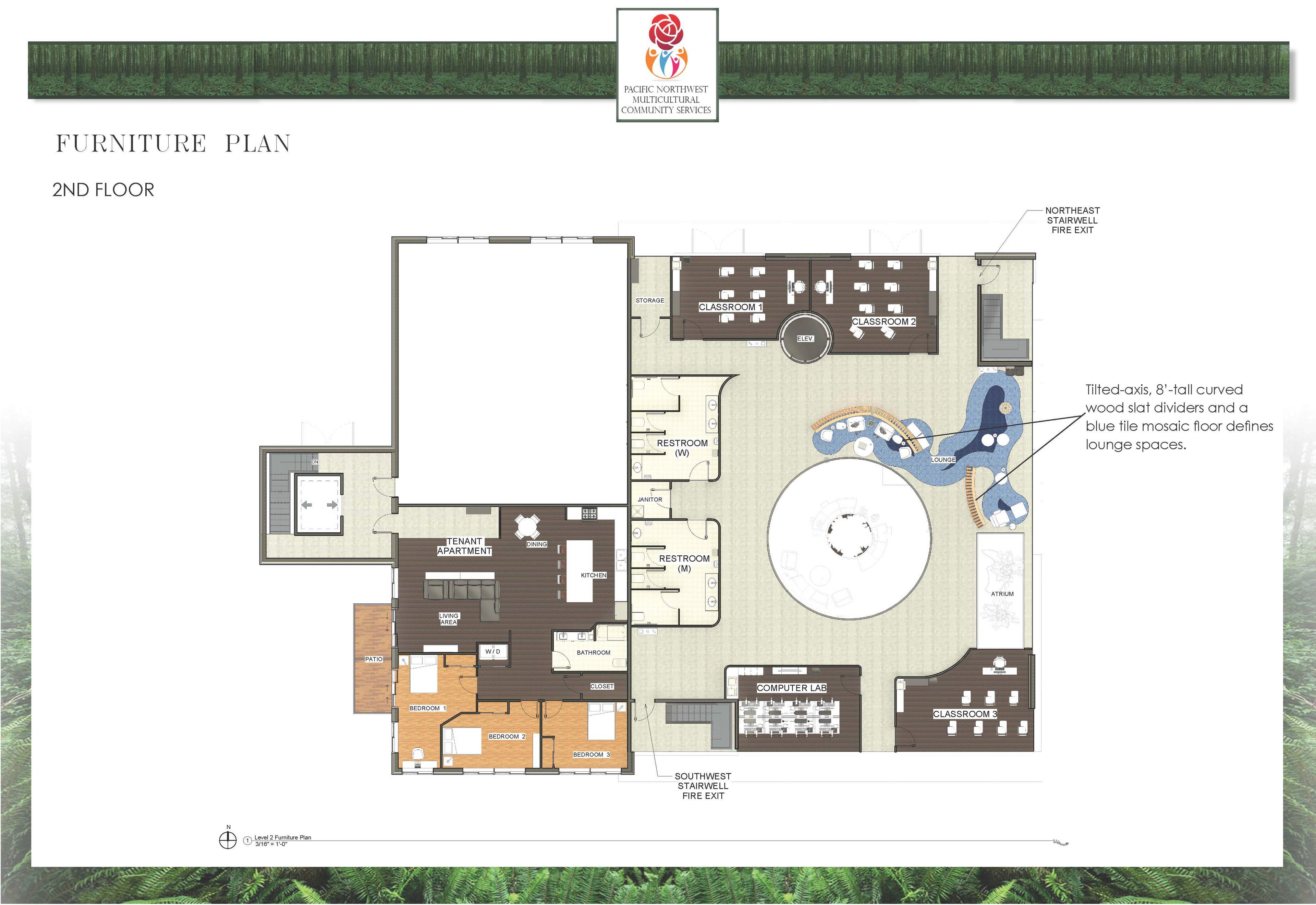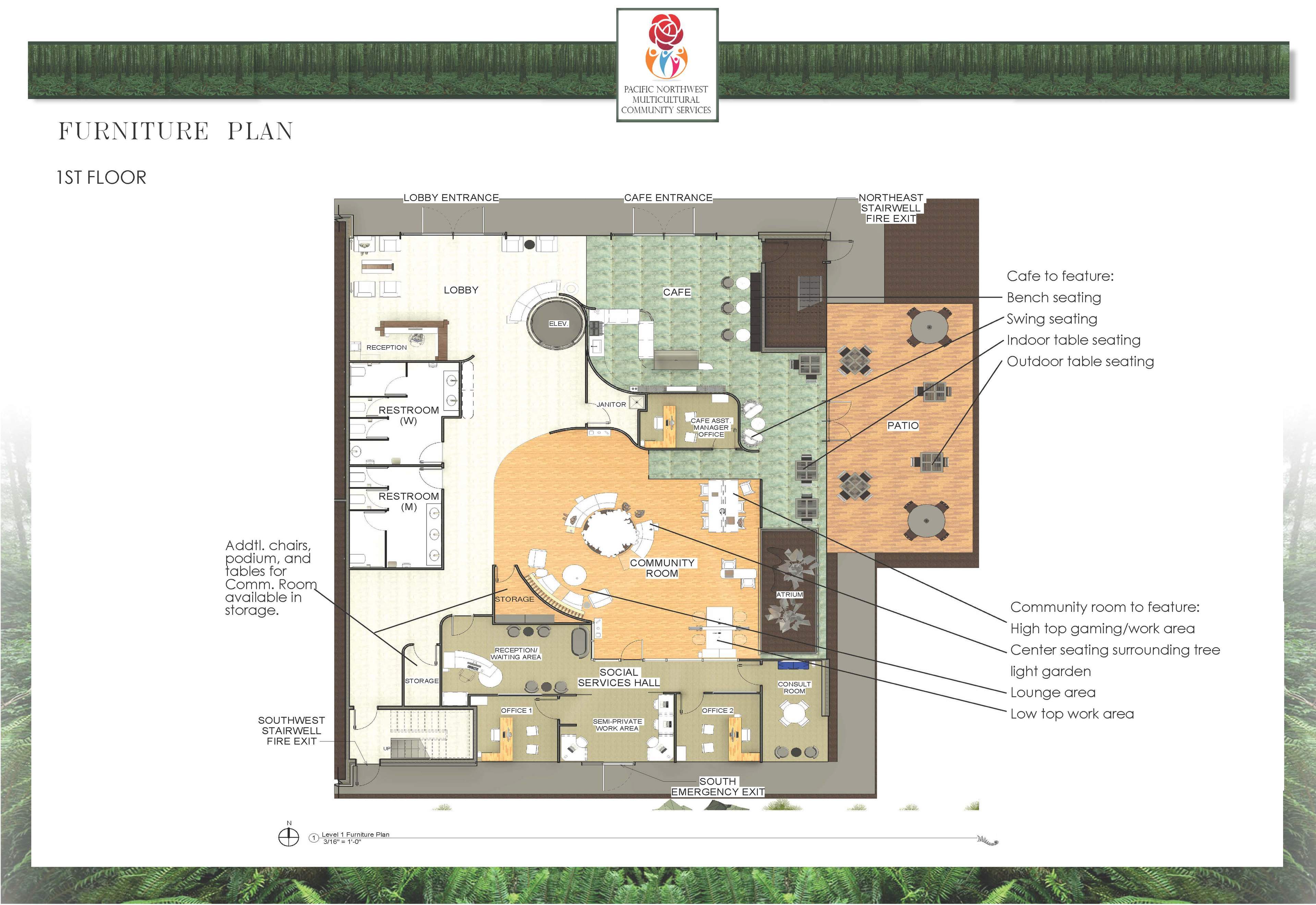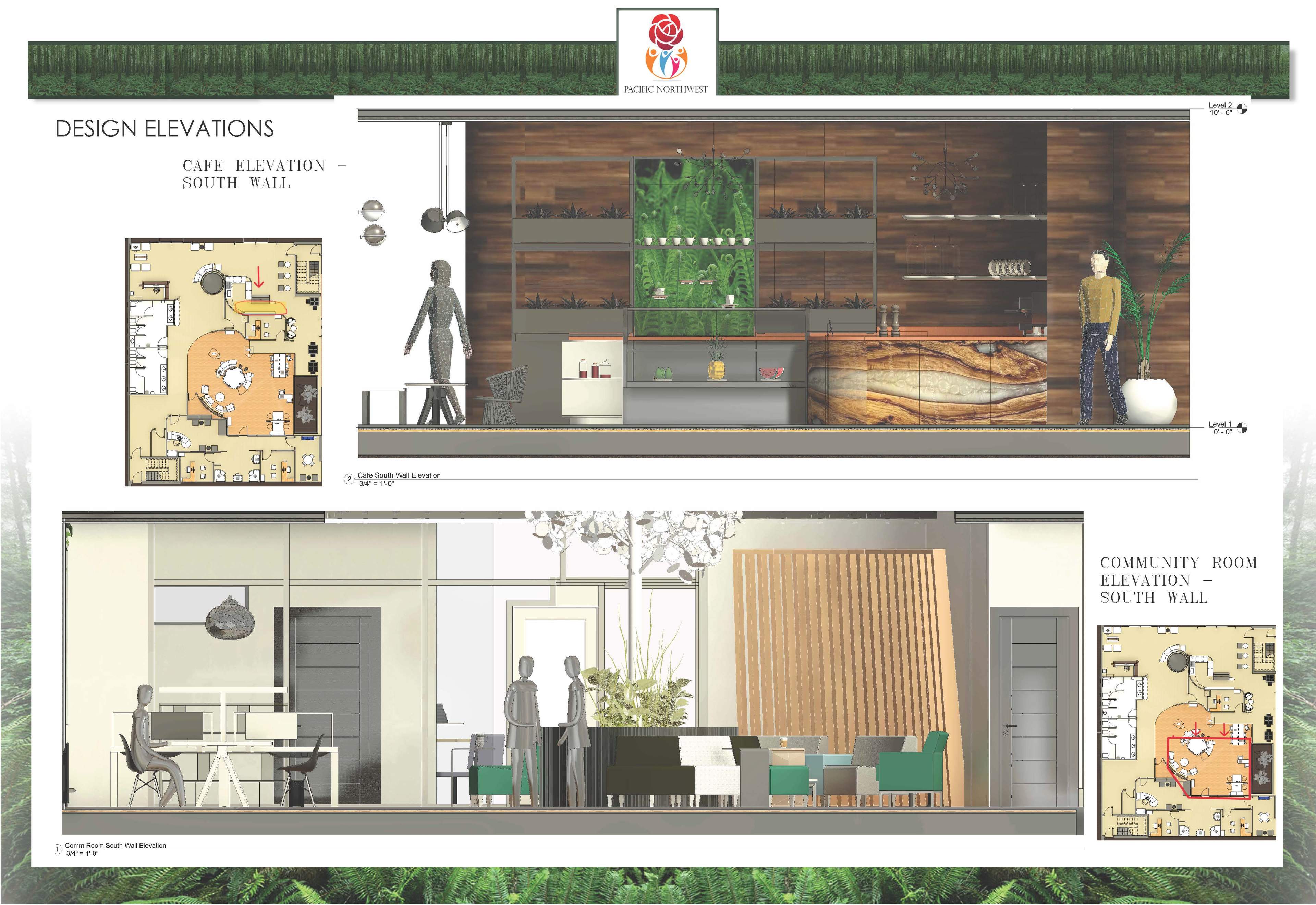 I chose earth-toned colors, natural materials, and an abundance of wood to give this community center interior a regional and comforting vibe that would help segue refugees into the PNW.