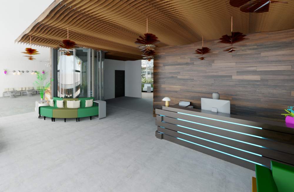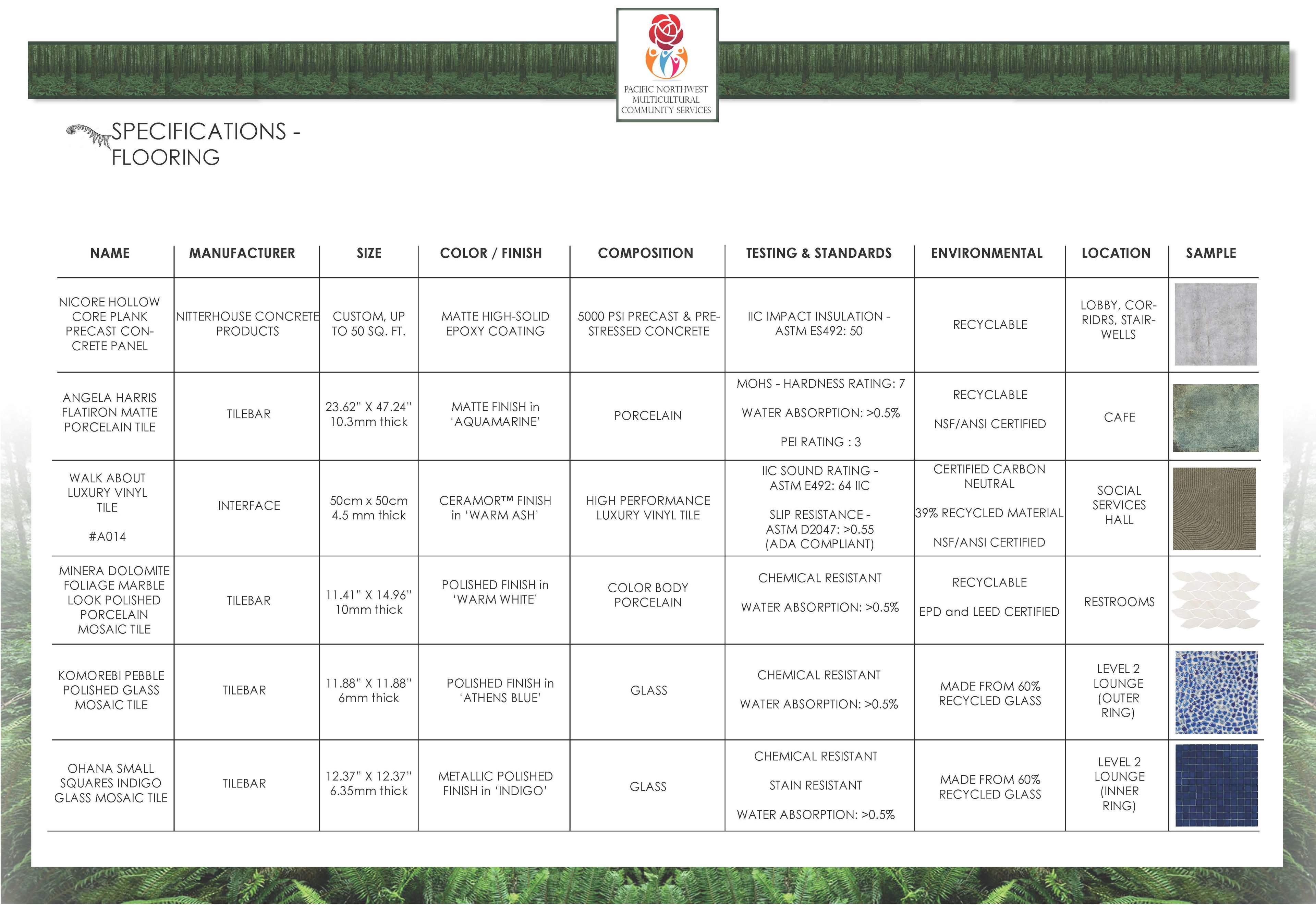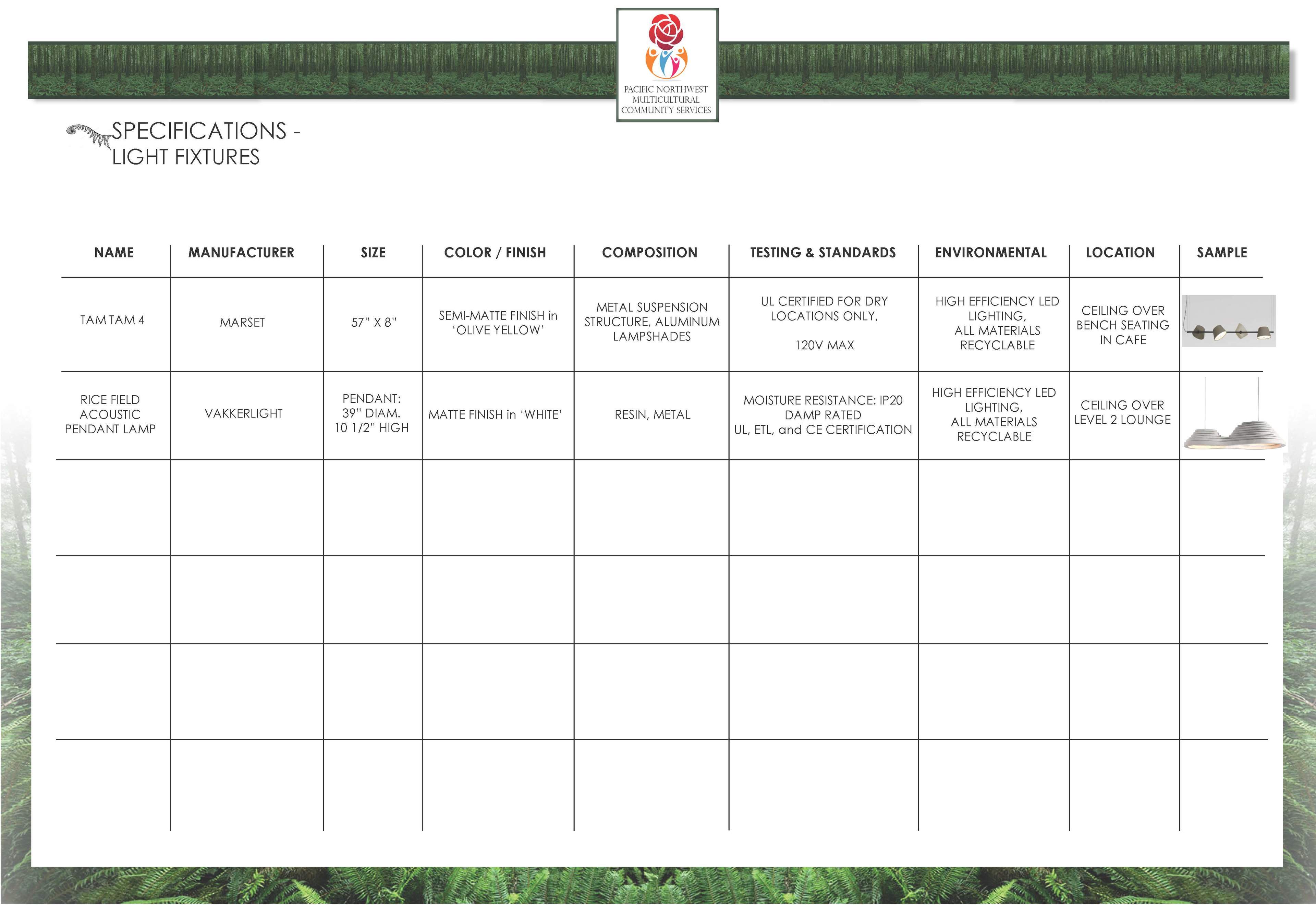 I chose earth-toned colors, natural materials, and an abundance of wood to give this community center interior a regional and comforting vibe that would help segue refugees into the PNW.