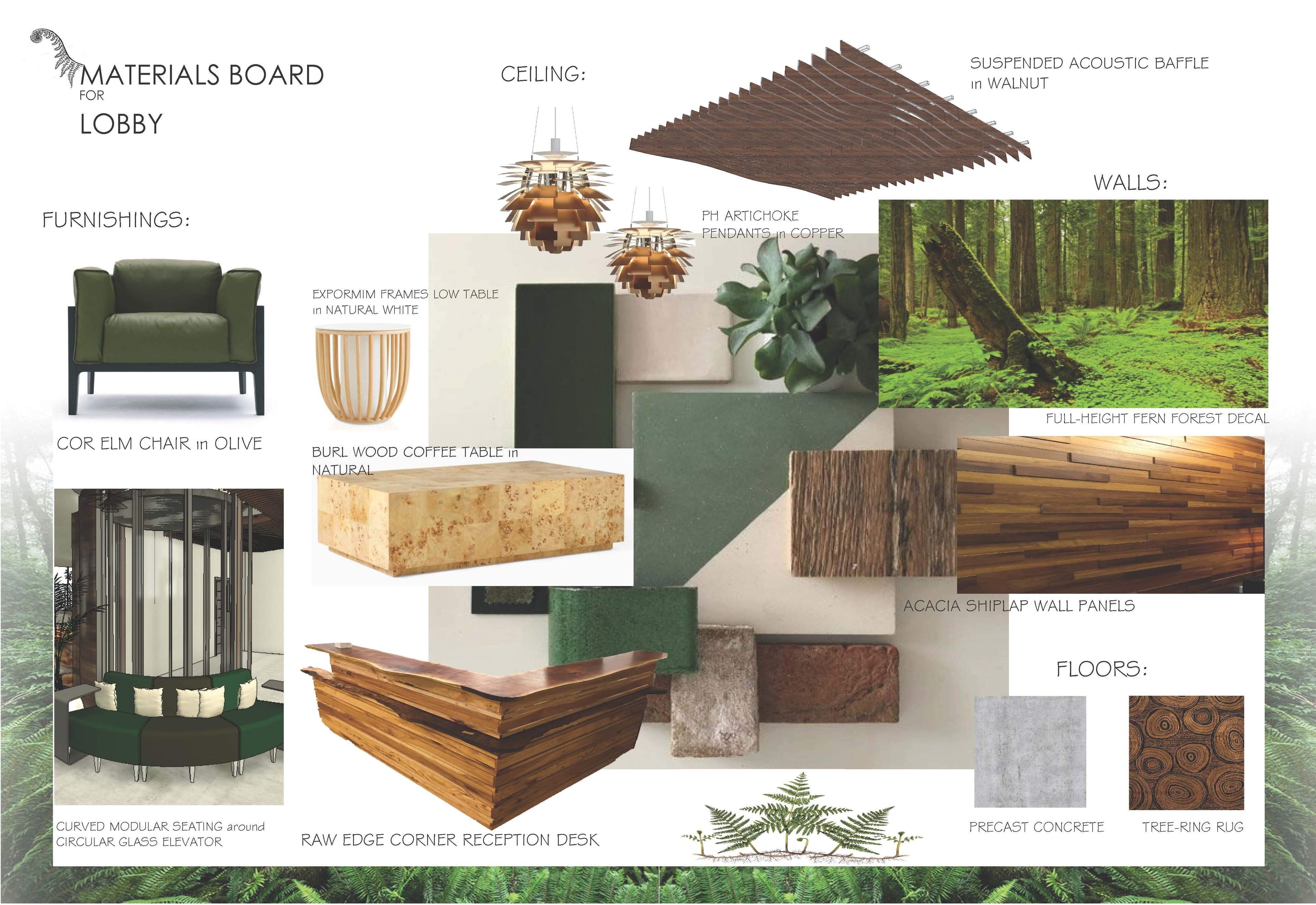 To illustrate our concept's presence via materials and furnishings, a materials board was required for one major functional area of the project, and presentation elevations were needed for at least four of the major functional areas.