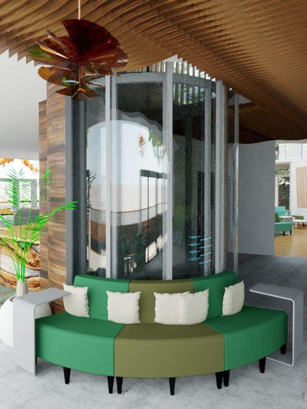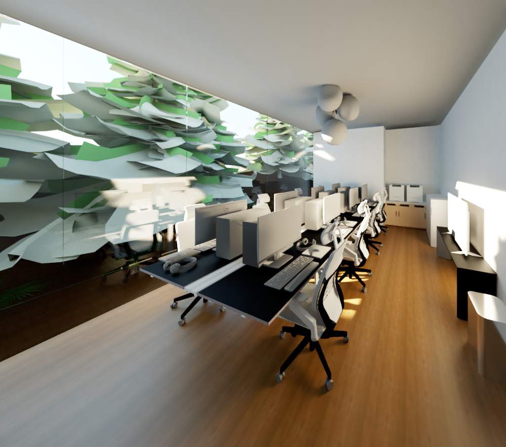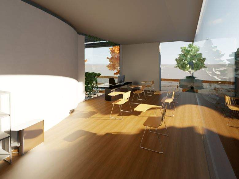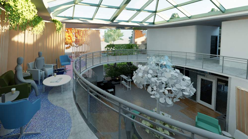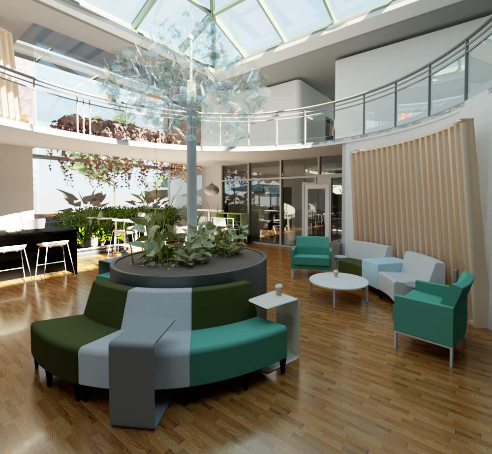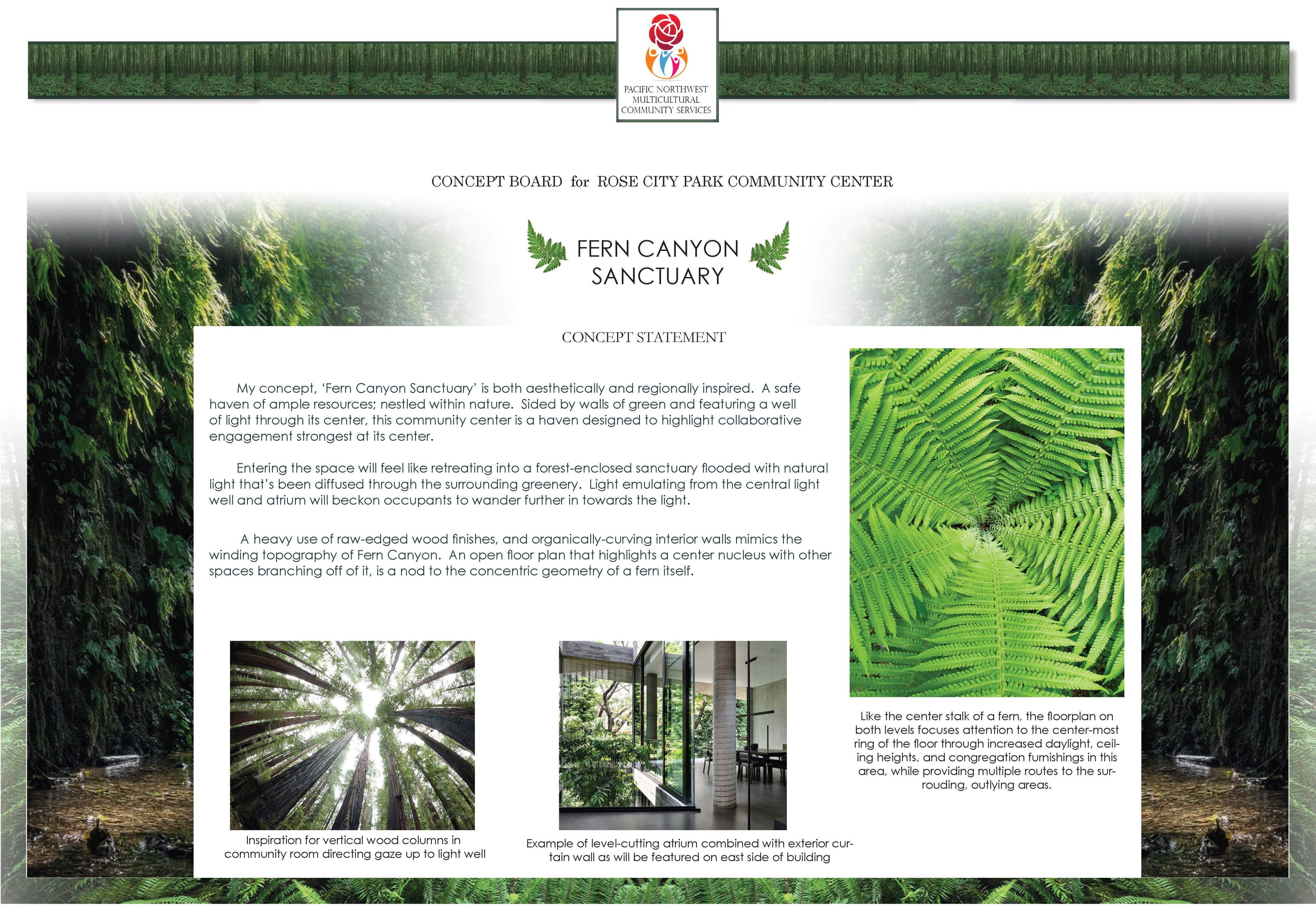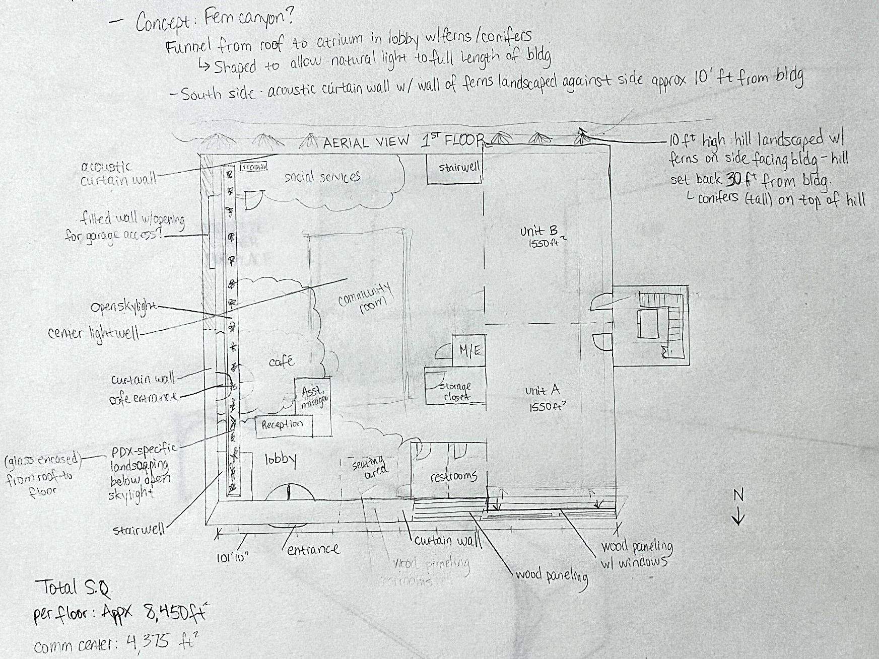 Working off my concept, my beginning sketches of the ground floor of the community center featured a central-point circulation system, where the community room acted as a nucleus beneath a circular light well with other areas arranged around it in a circle. This arrangement combined with the light well and oversized indoor terrarium lent well to the fern canyon sanctuary concept.