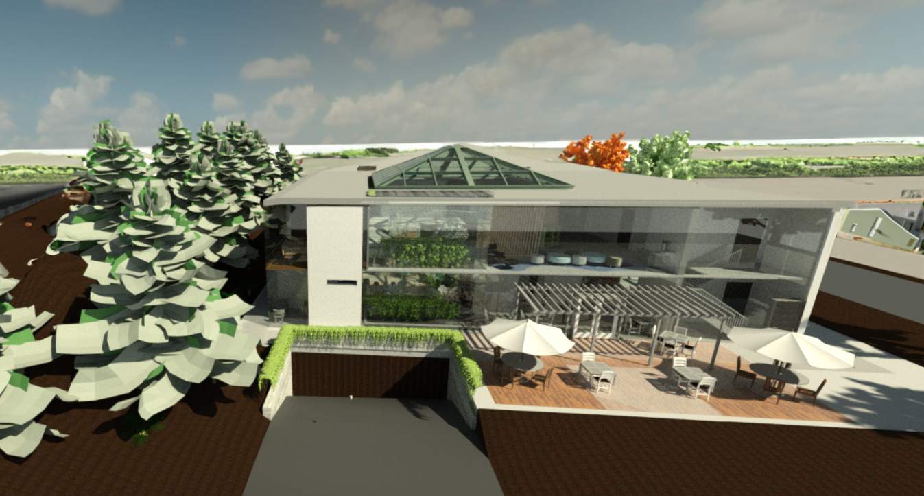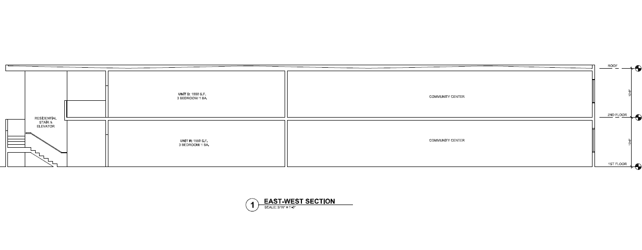 An existing 3-story building (basement + 2 floors) will be renovated to house a lobby, cafe, community room, social service offices, classrooms, computer lab and support spaces, as well as four residential units.