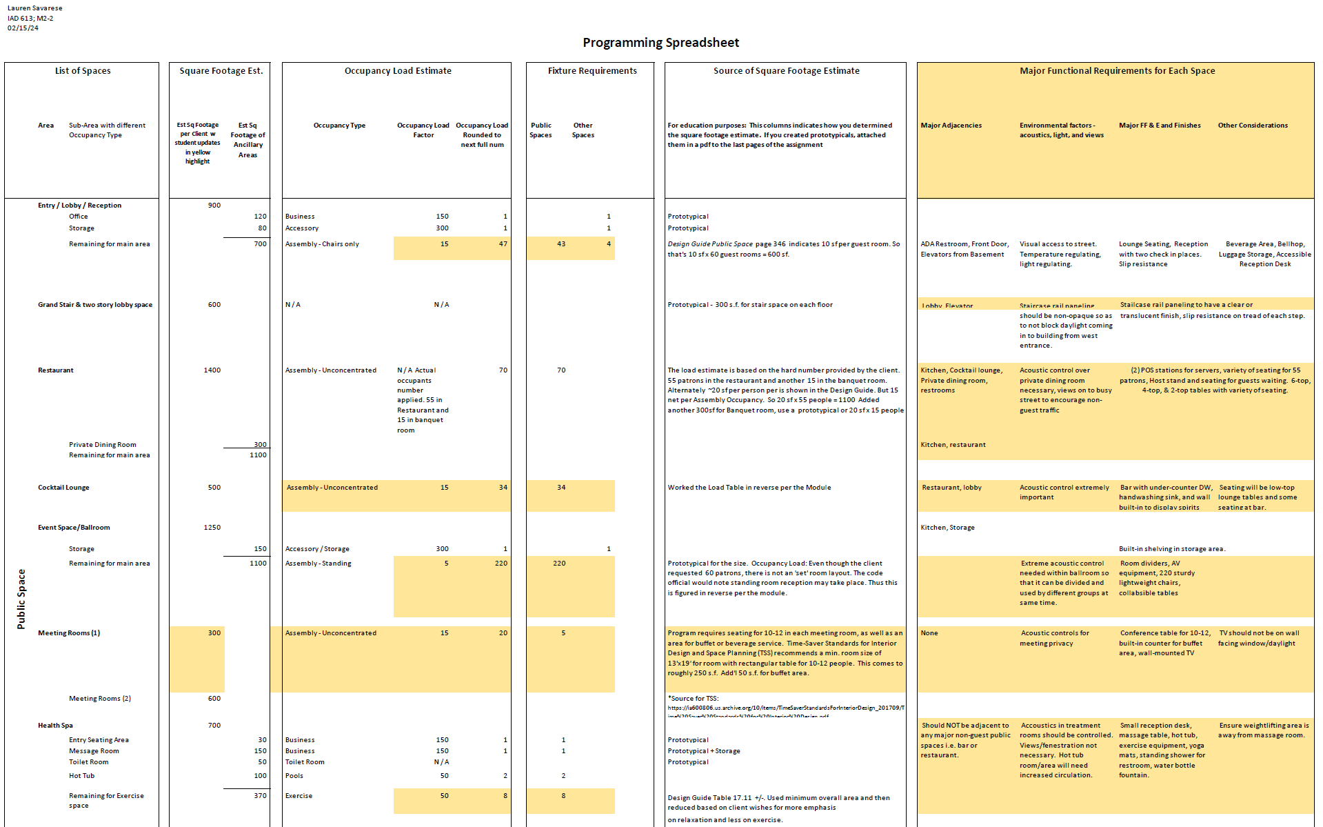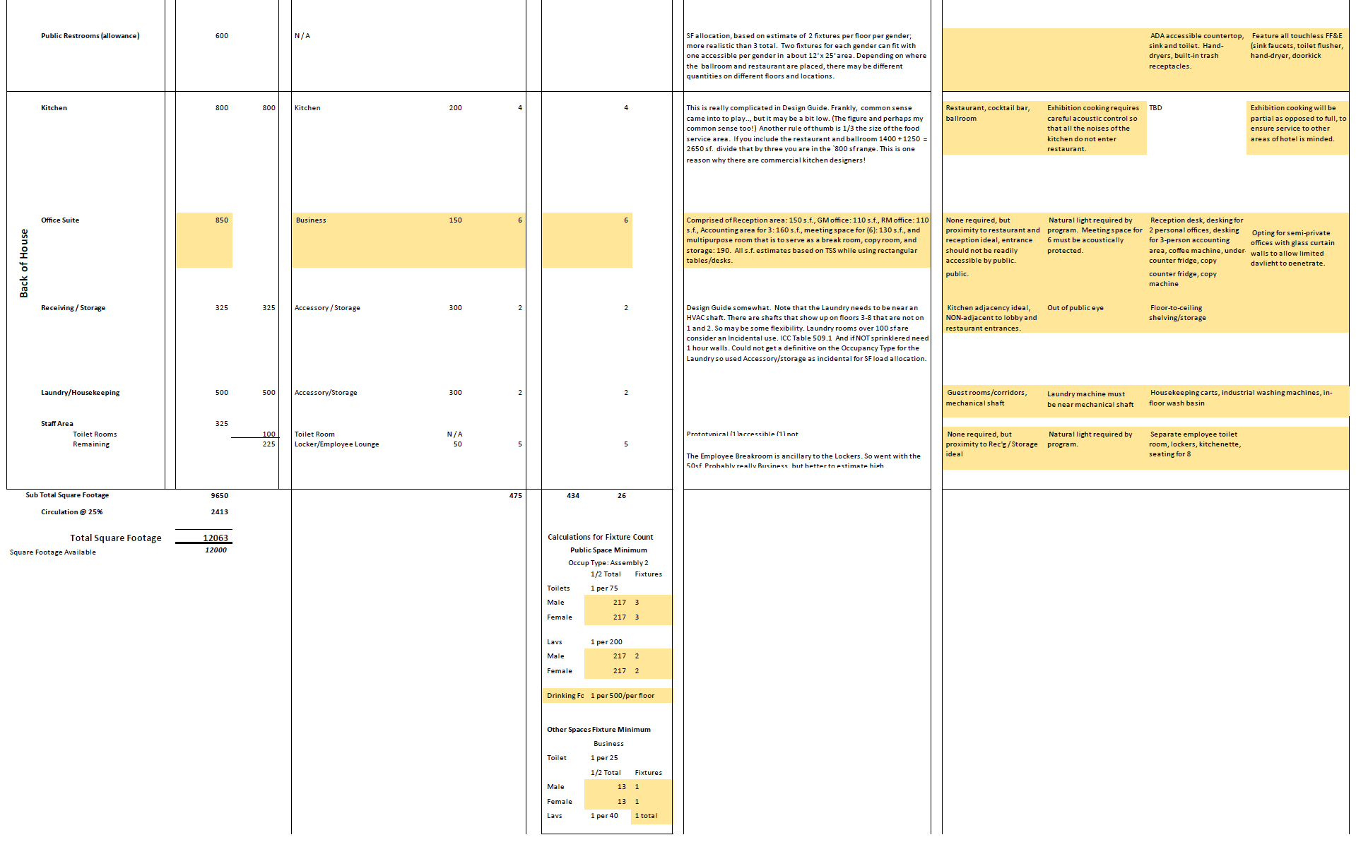 The program below was created in Microsoft Excel using the general program requirements provided by the client and applying appropriate square footages and respective occupancy loads to each functional space. Square footage estimates and respective occupancy types are delineated within the program. Occupant loads were then used to calculate total number of plumbing fixtures (toilets, sinks and fountains) needed on each floor.