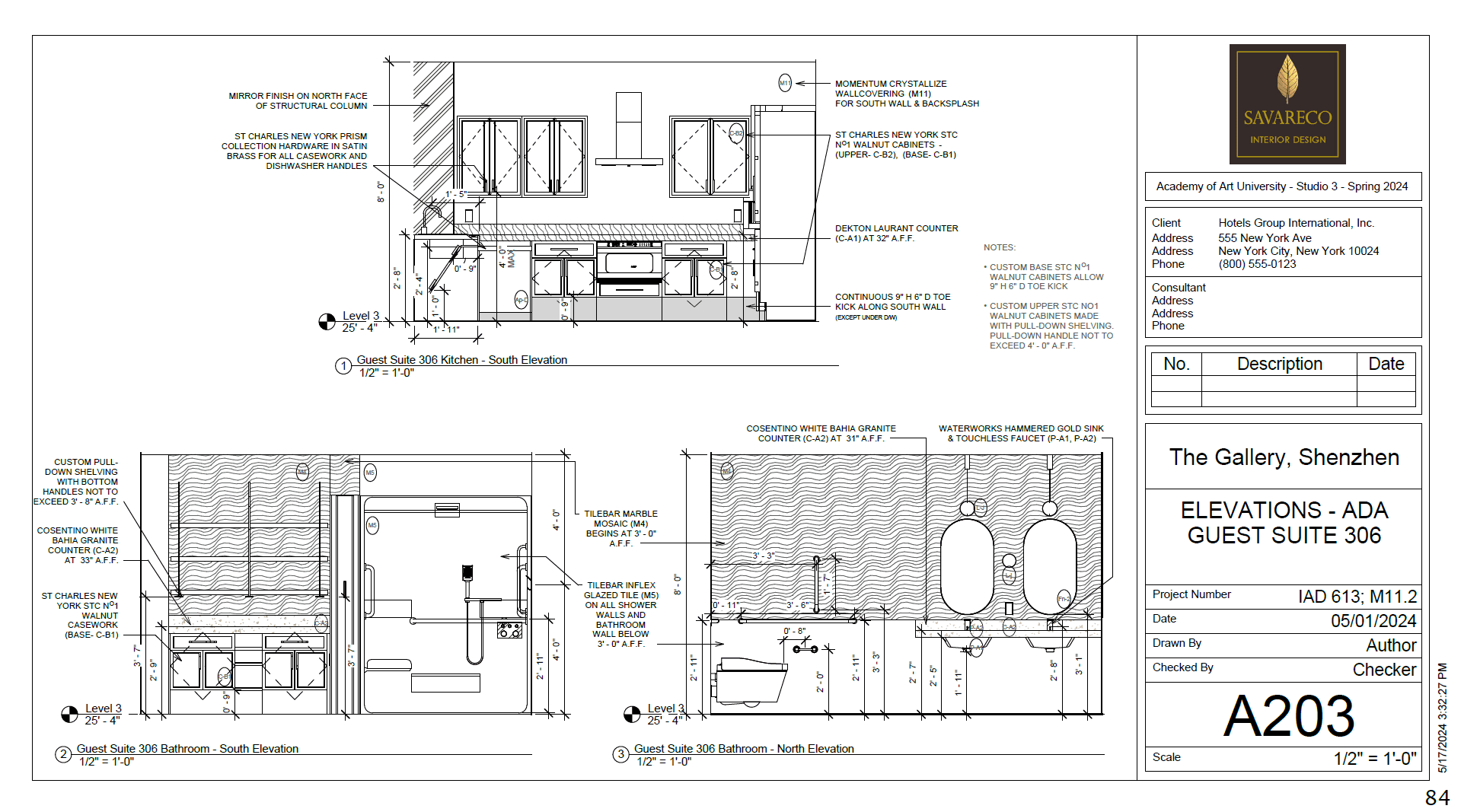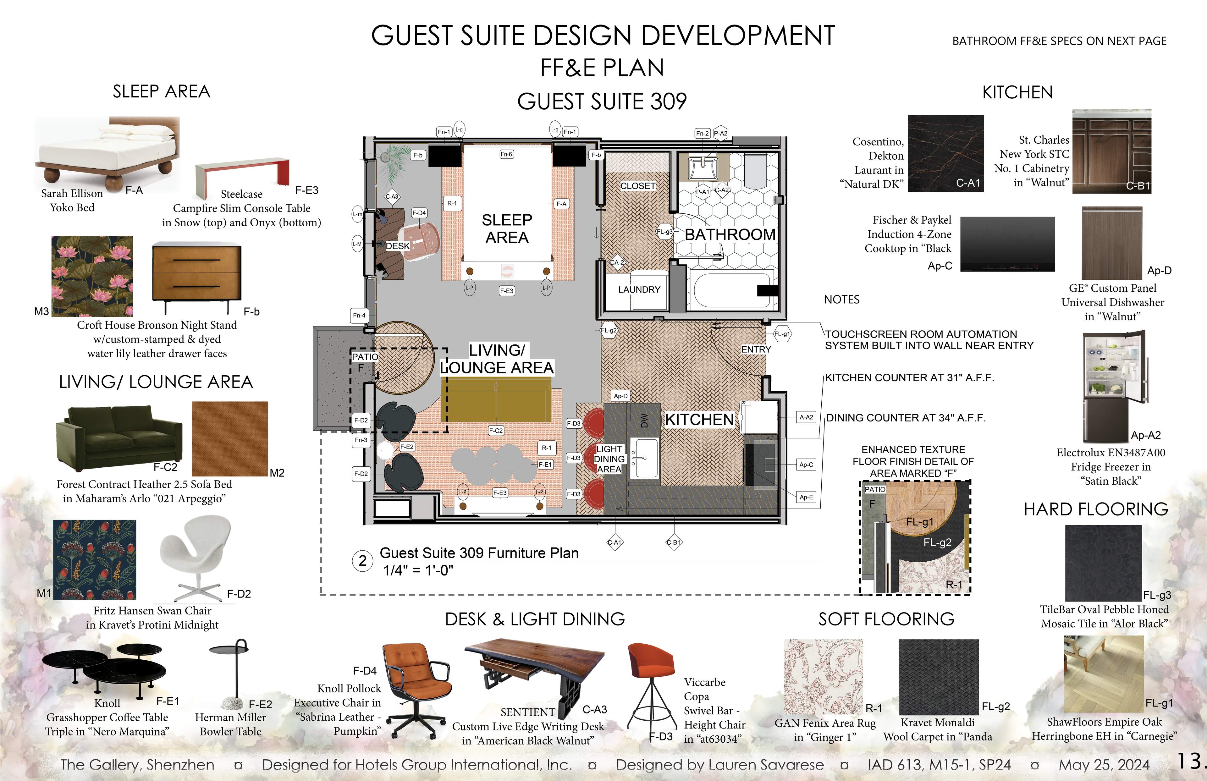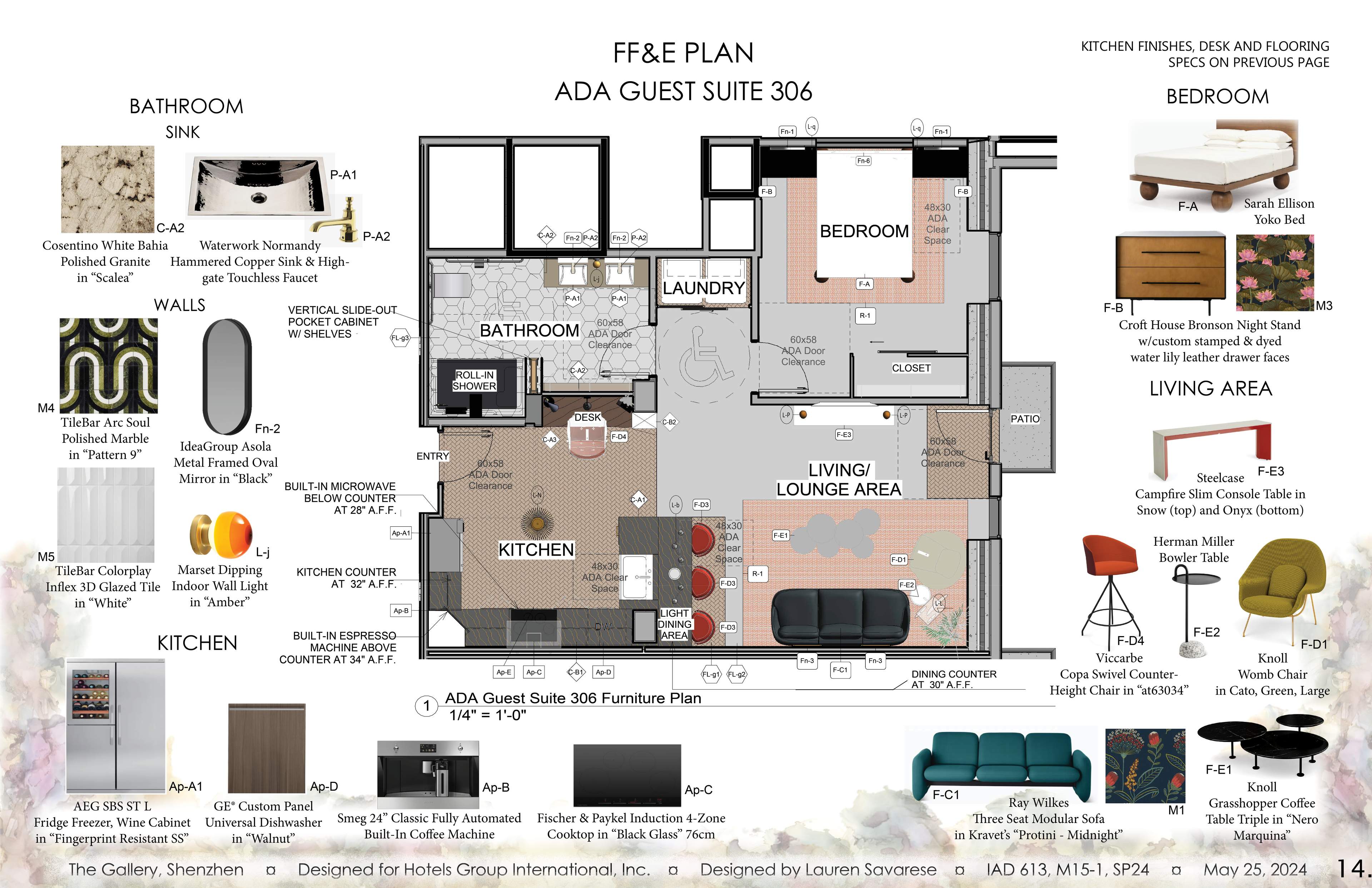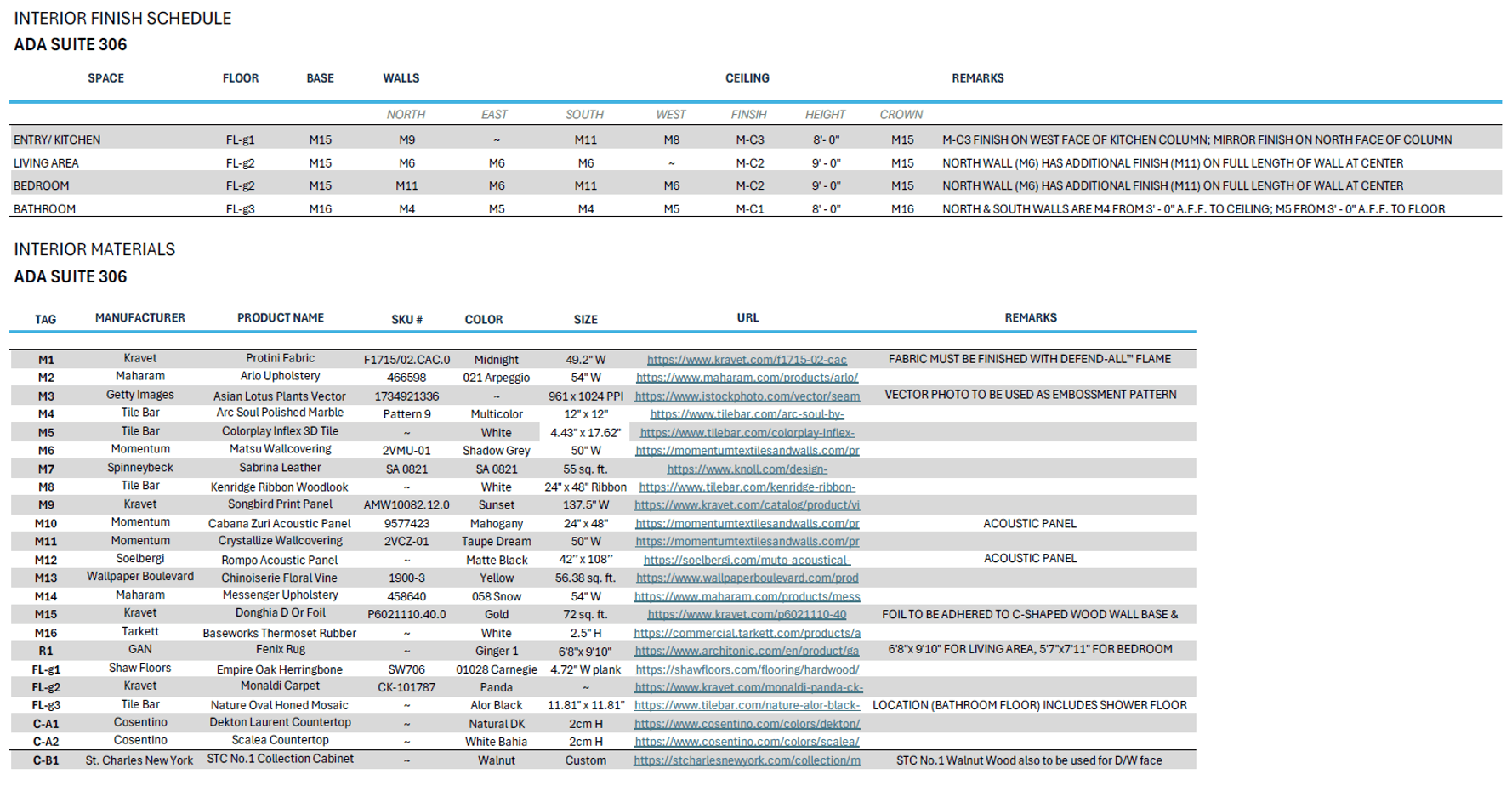 For this academic project's purposes, specification requirements were limited to an interior finish and material schedule for the ADA suite, (seen at right) and a minimum of 10 individual specifications for finish and furnishing selections within the guest suites.