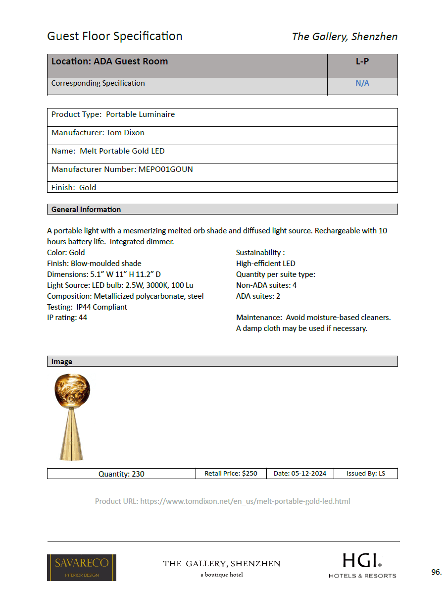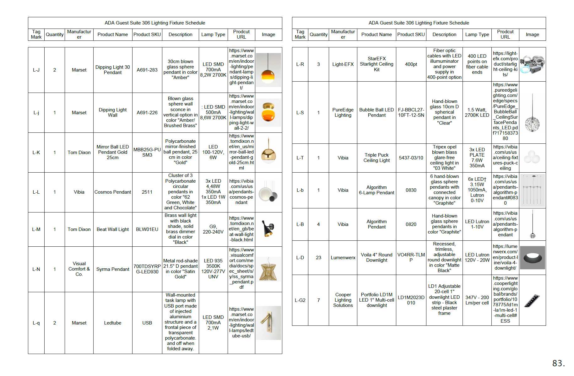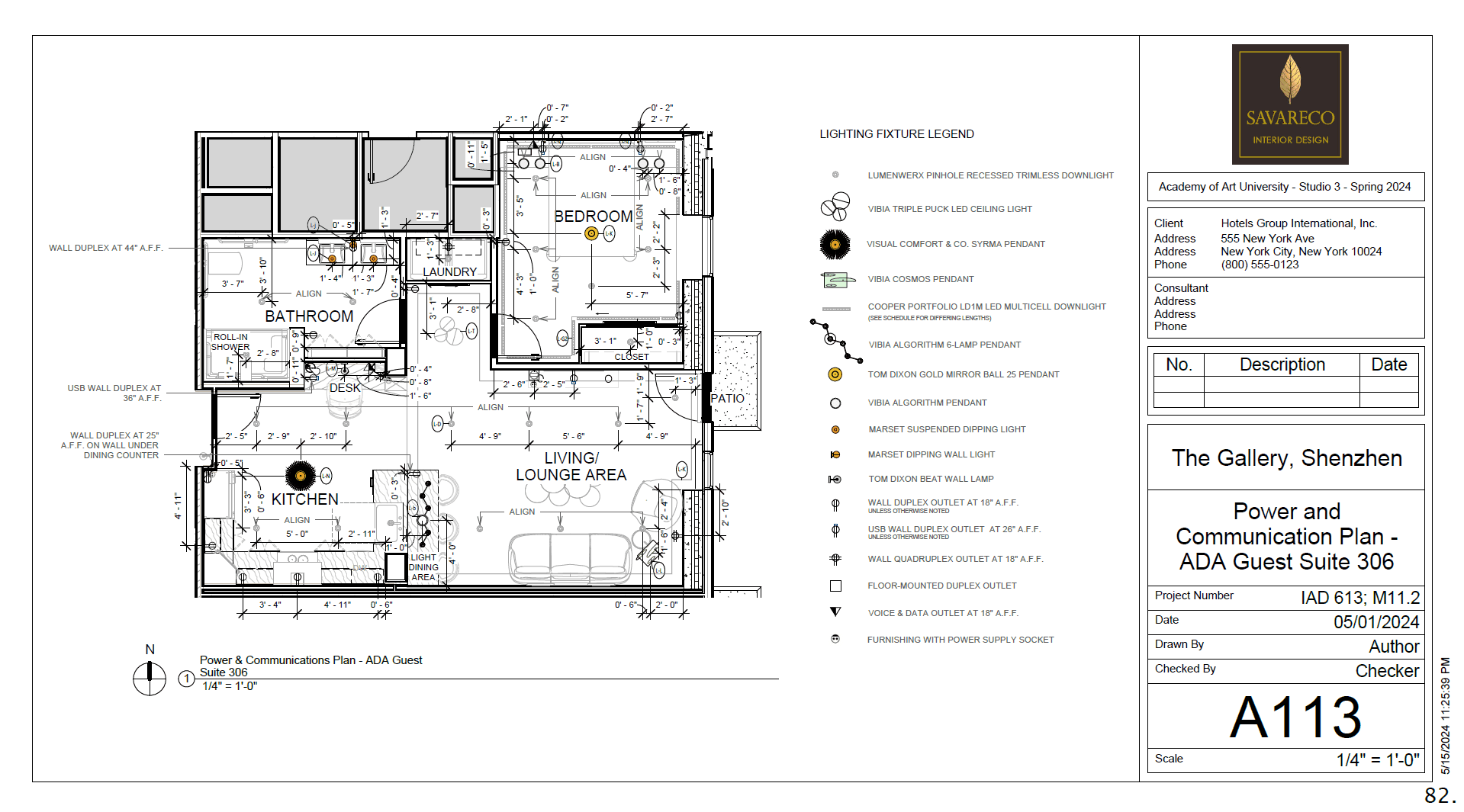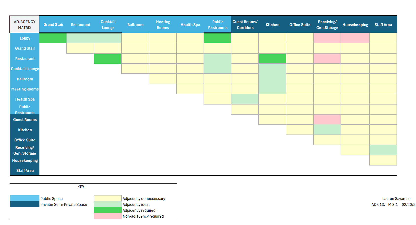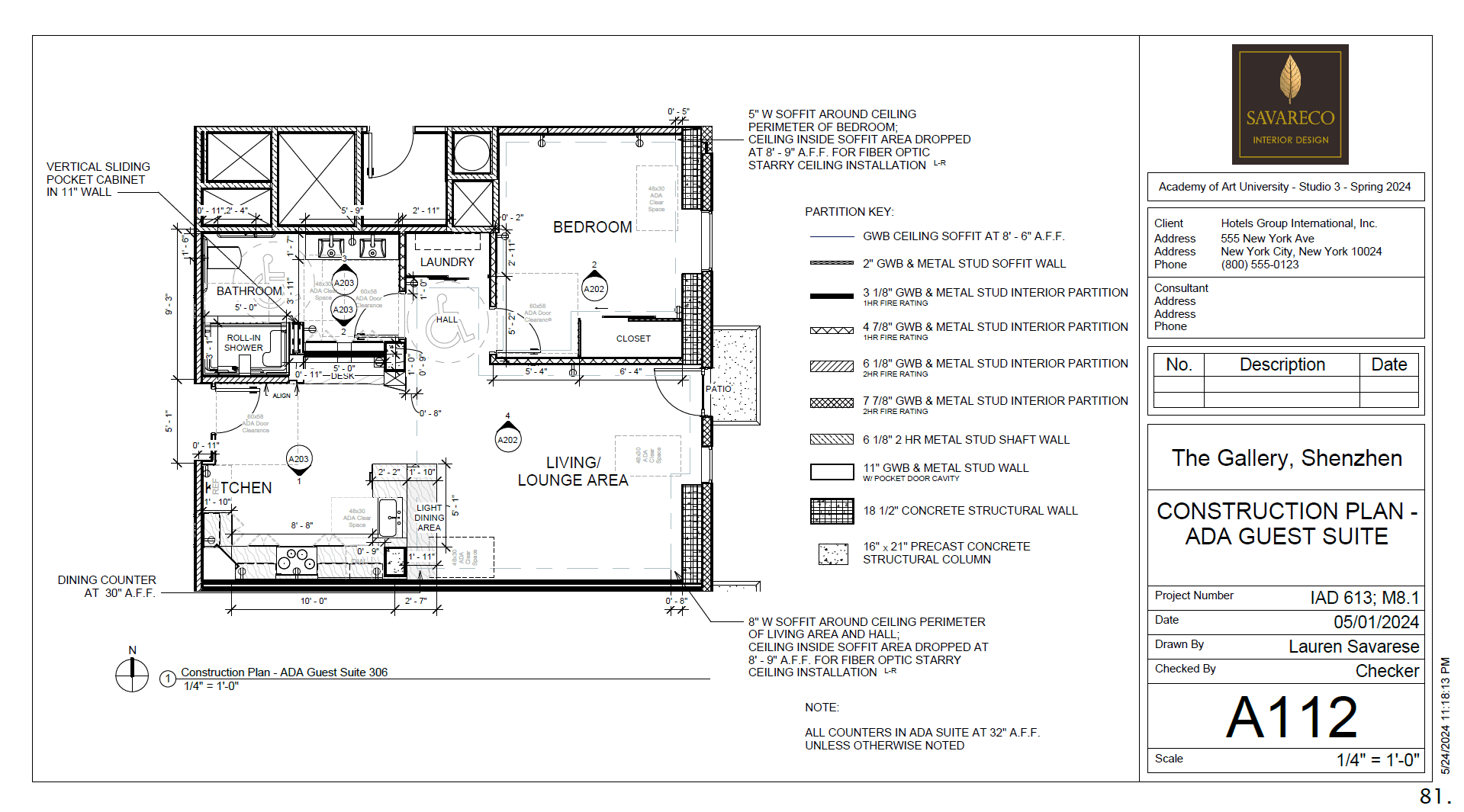 For this academic project's purposes, specification requirements were limited to an interior finish and material schedule for the ADA suite, (seen at right) and a minimum of 10 individual specifications for finish and furnishing selections within the guest suites.