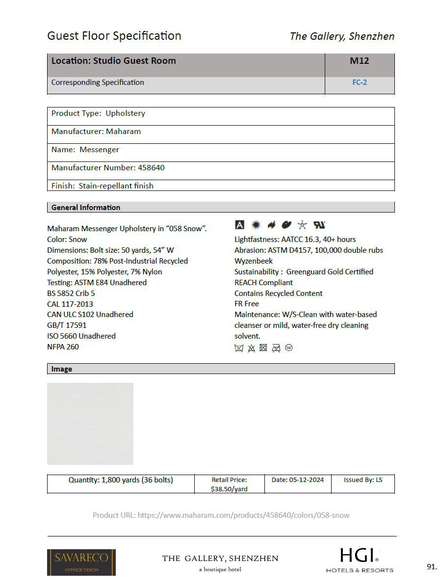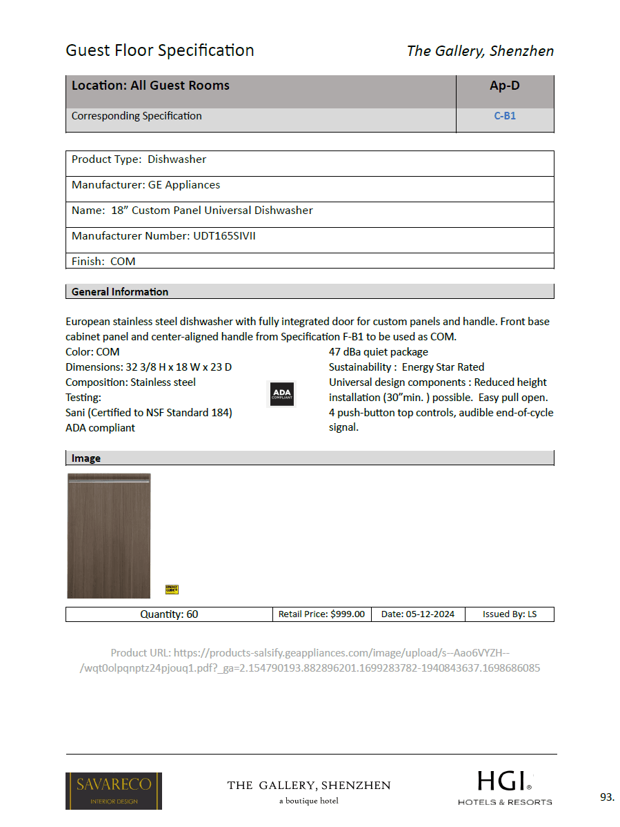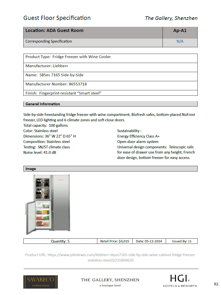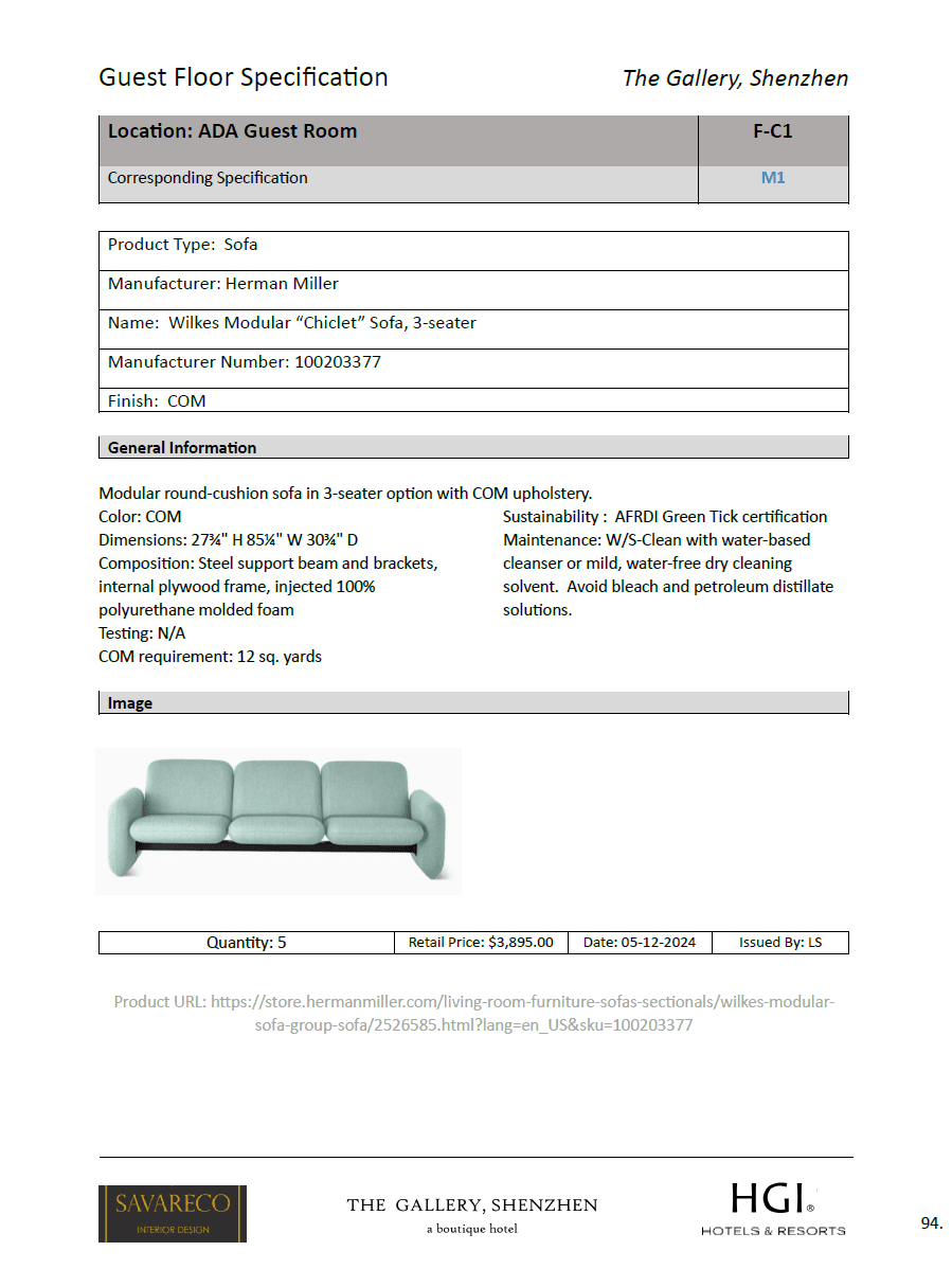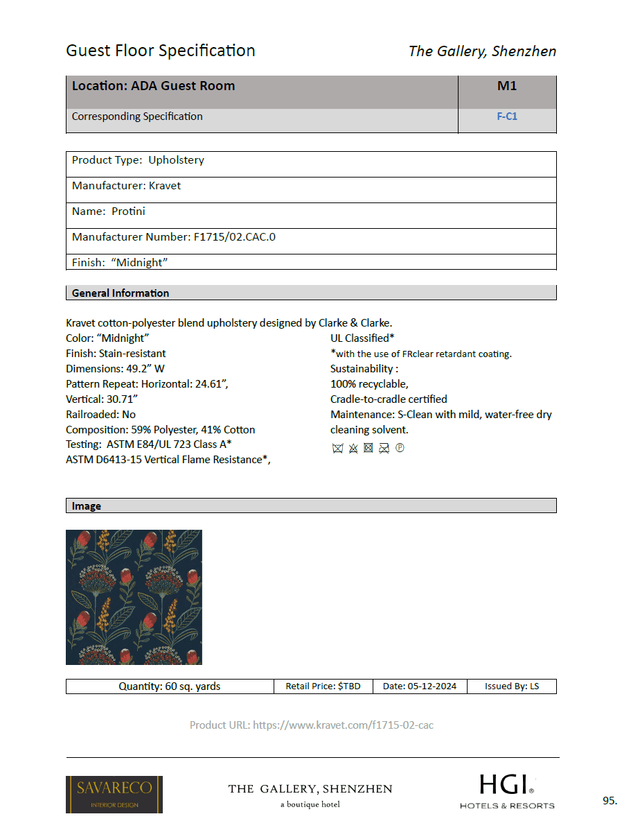 For this academic project's purposes, specification requirements were limited to an interior finish and material schedule for the ADA suite, (seen at right) and a minimum of 10 individual specifications for finish and furnishing selections within the guest suites.