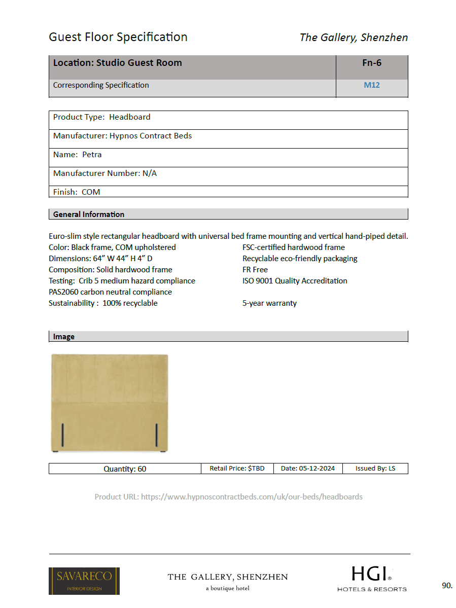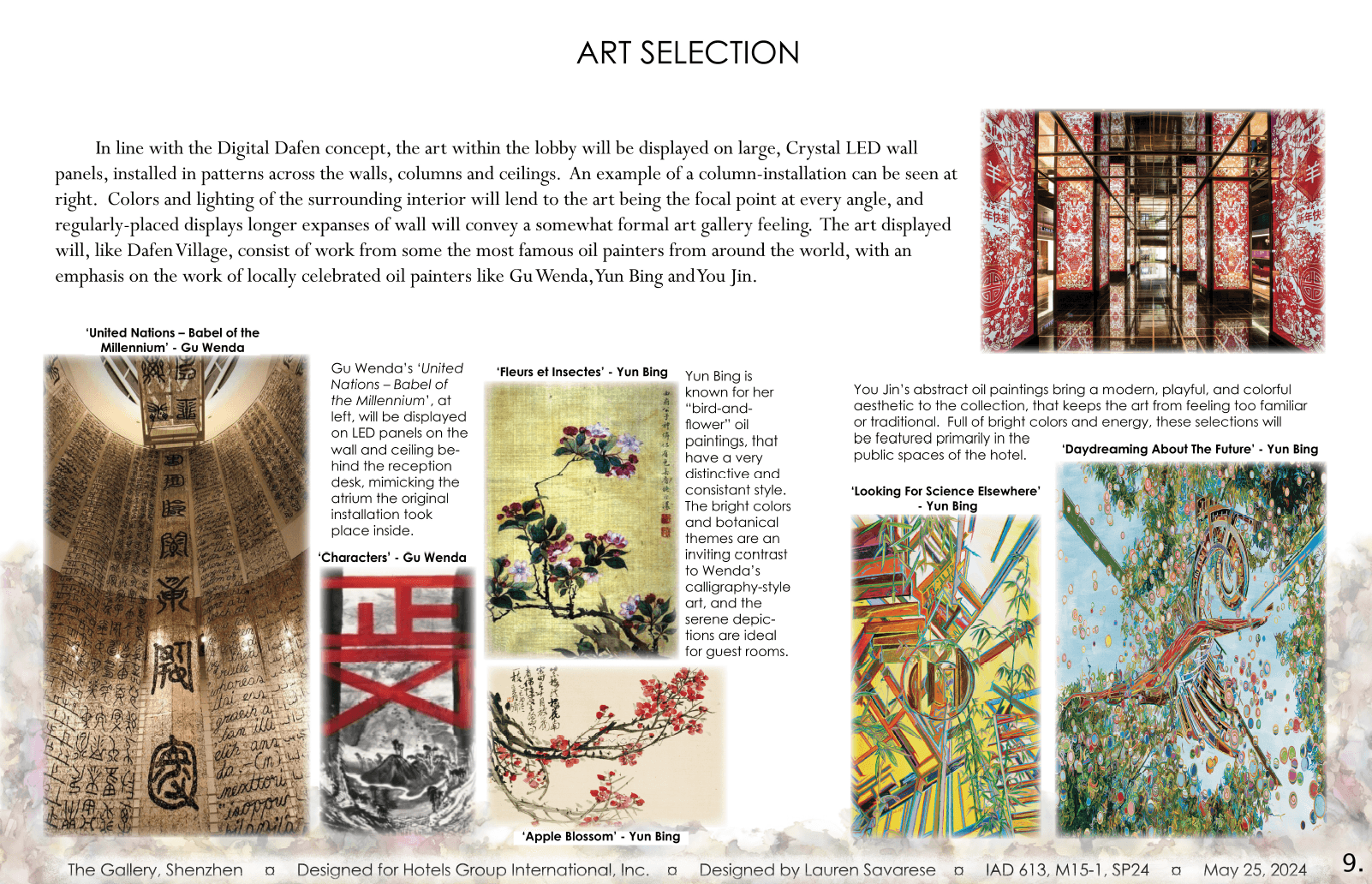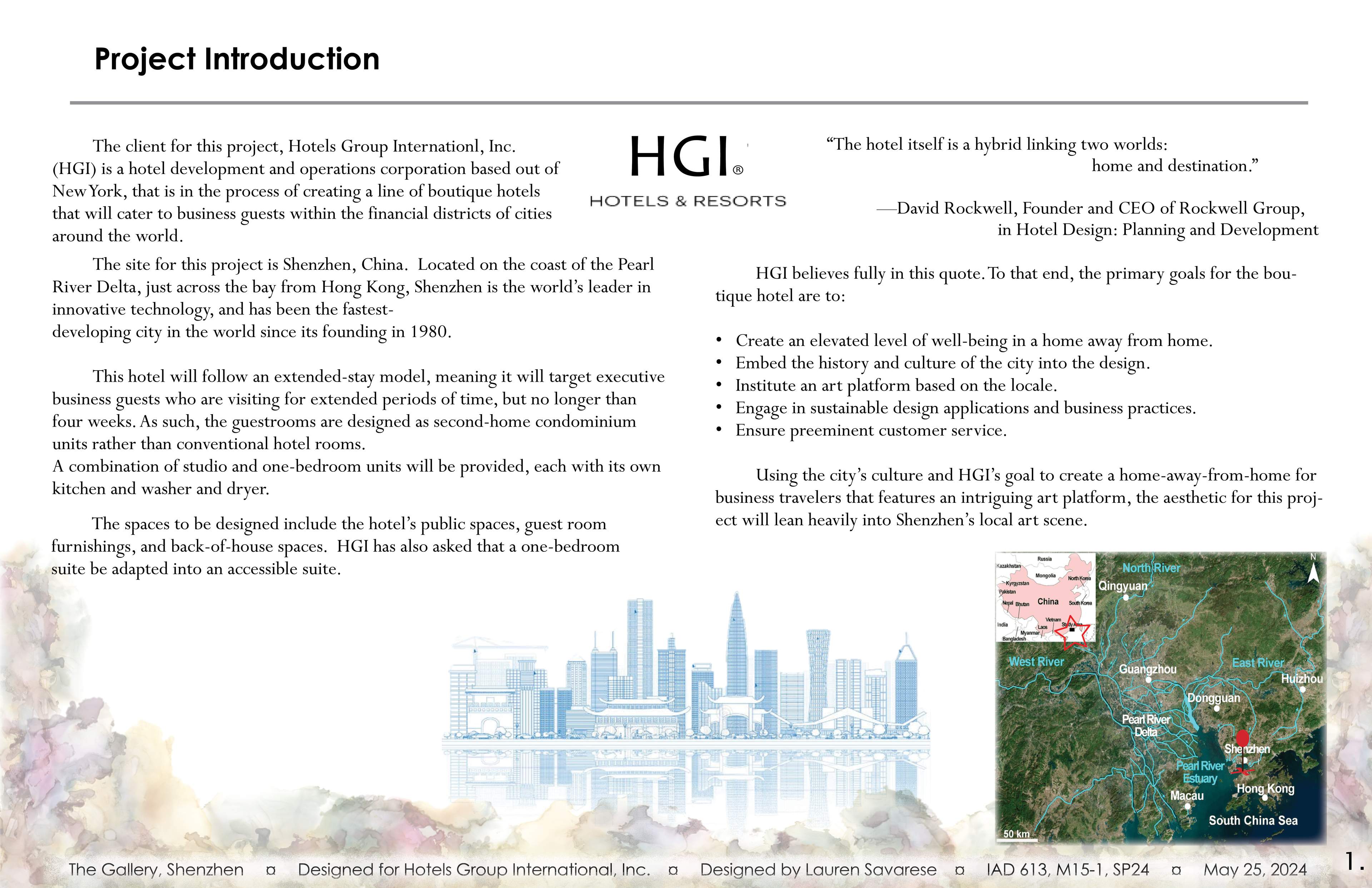 This project involves the schematic design of primary public and back of house spaces in a 65-room boutique hotel, and complete design of the lobby, and guest suites for corporate hotel client, HGI (Hotels Group International, Inc), in the central financial district of Shenzhen, China. HGI's commission of this project was part of their new line of downtown boutique hotels meant to cater to business guests in these financial districts. The hotel was to follow a high-end, extended-stay model, and be constructed within an existing building. The client's key drivers for the project were as follows: