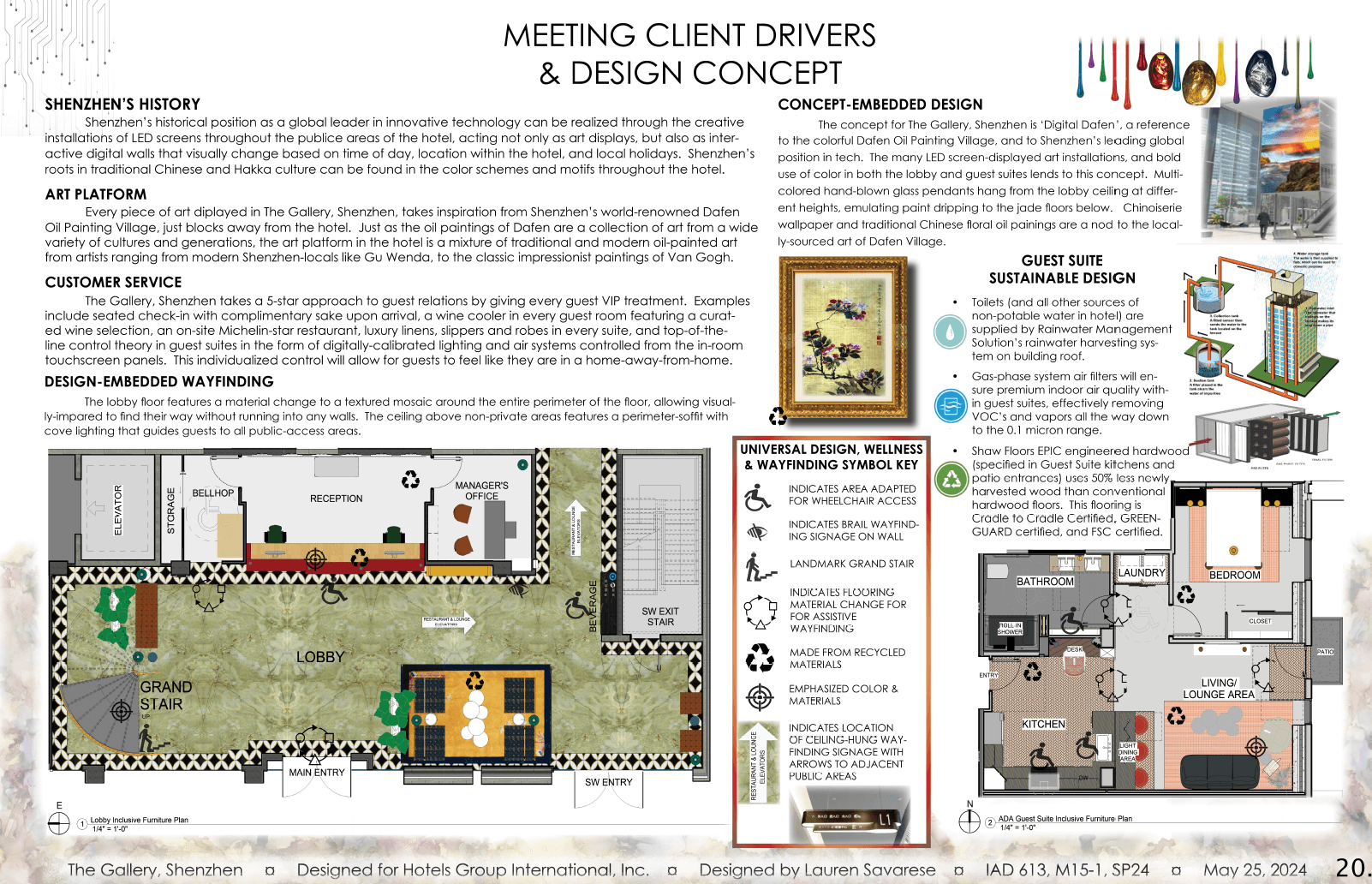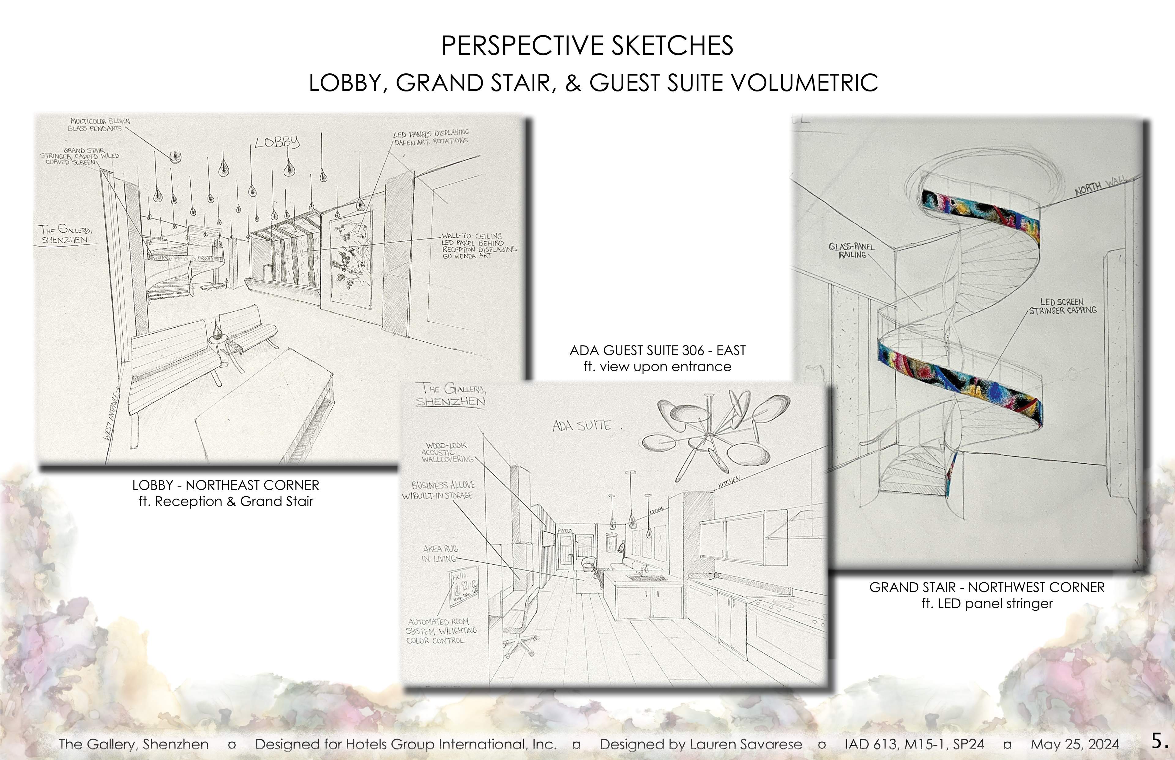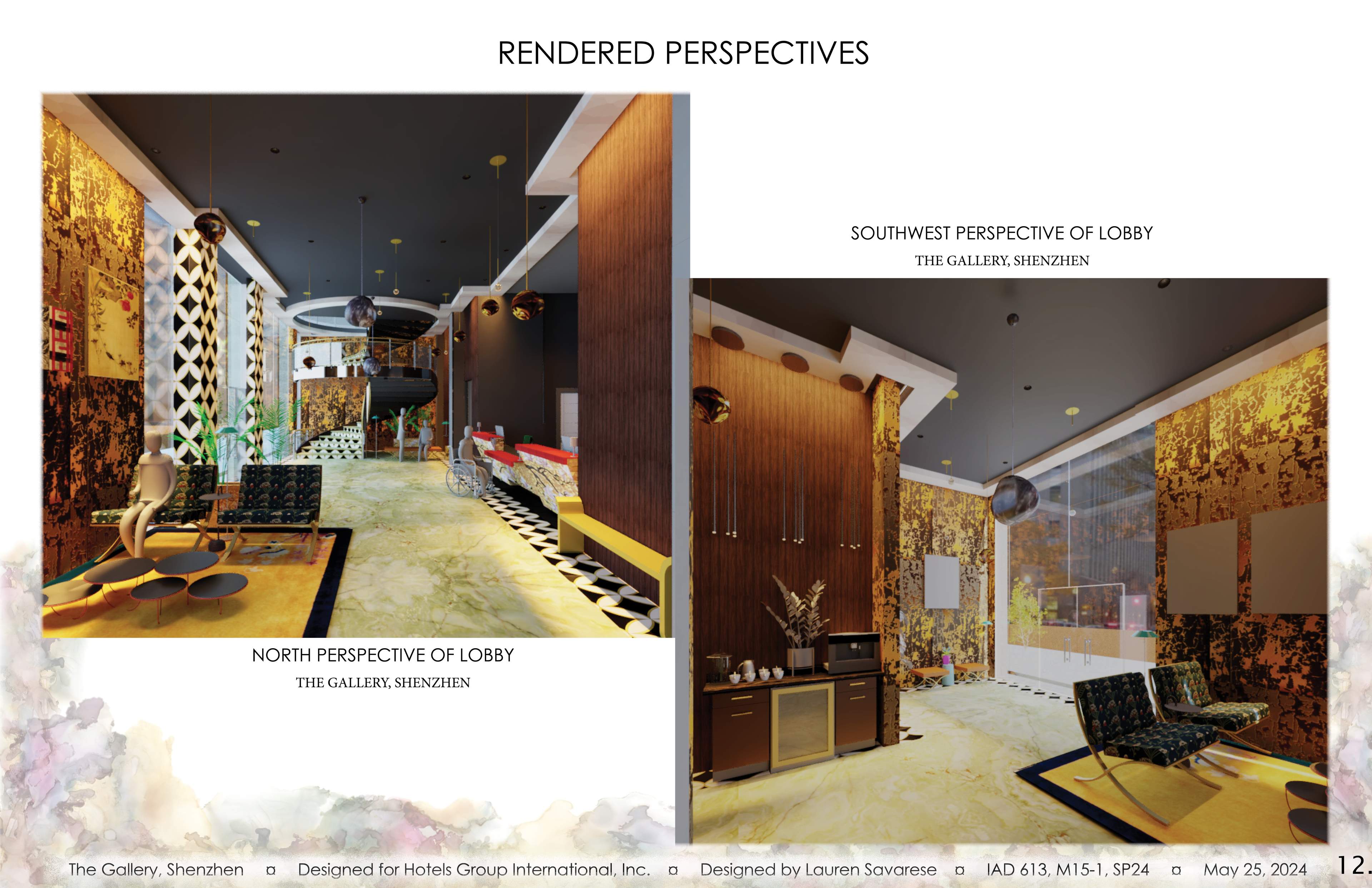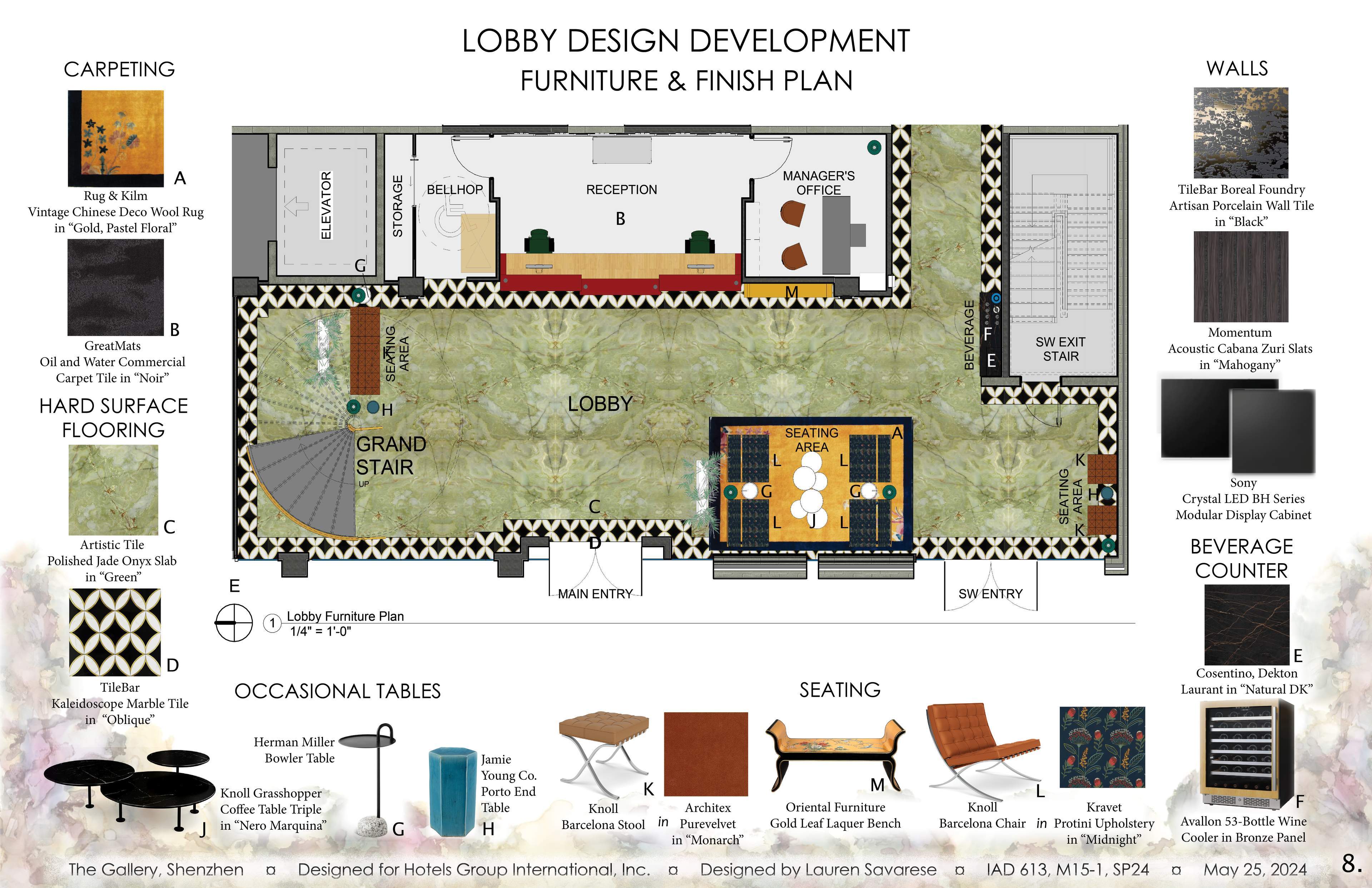 If desired, please reach out to request my full process book which includes all of the work that went behind the final design presentation, as well as more in-depth attention to areas outside of the lobby and guest suites of the hotel.