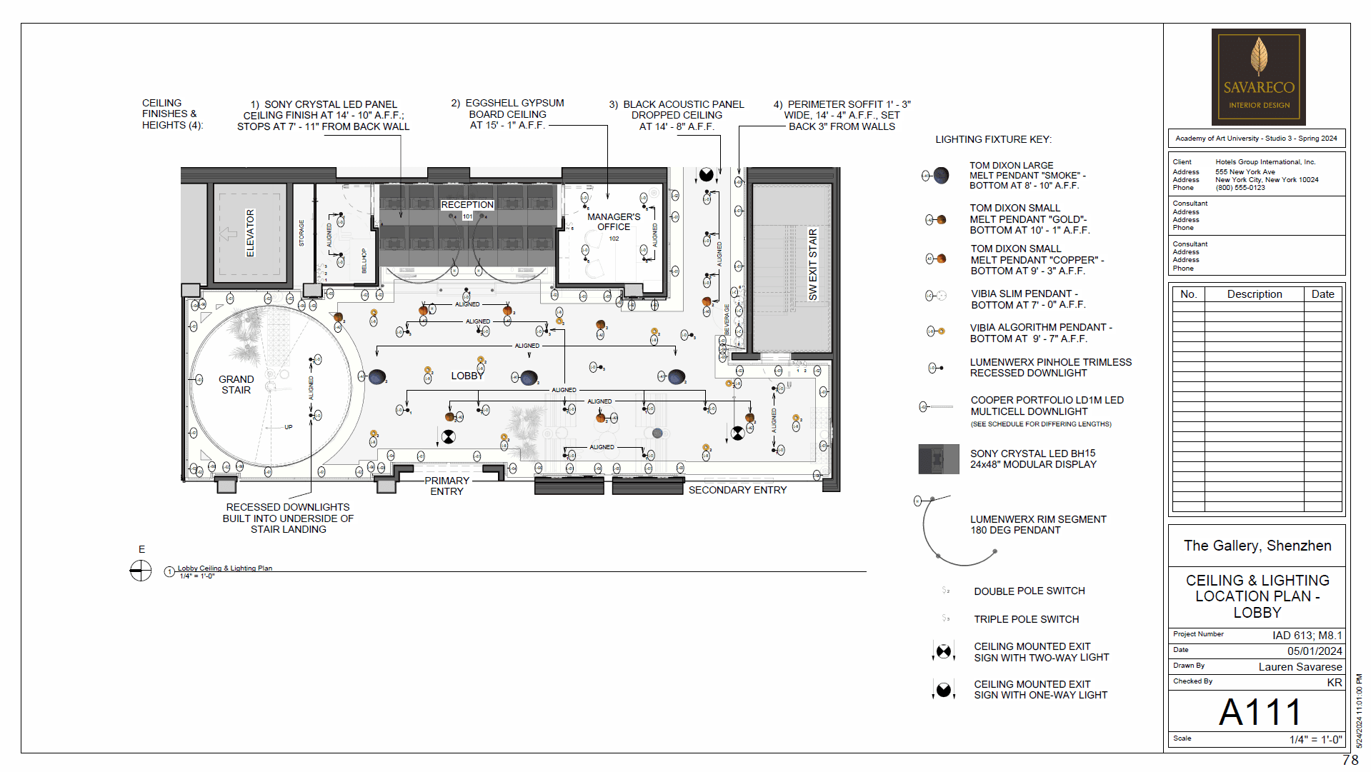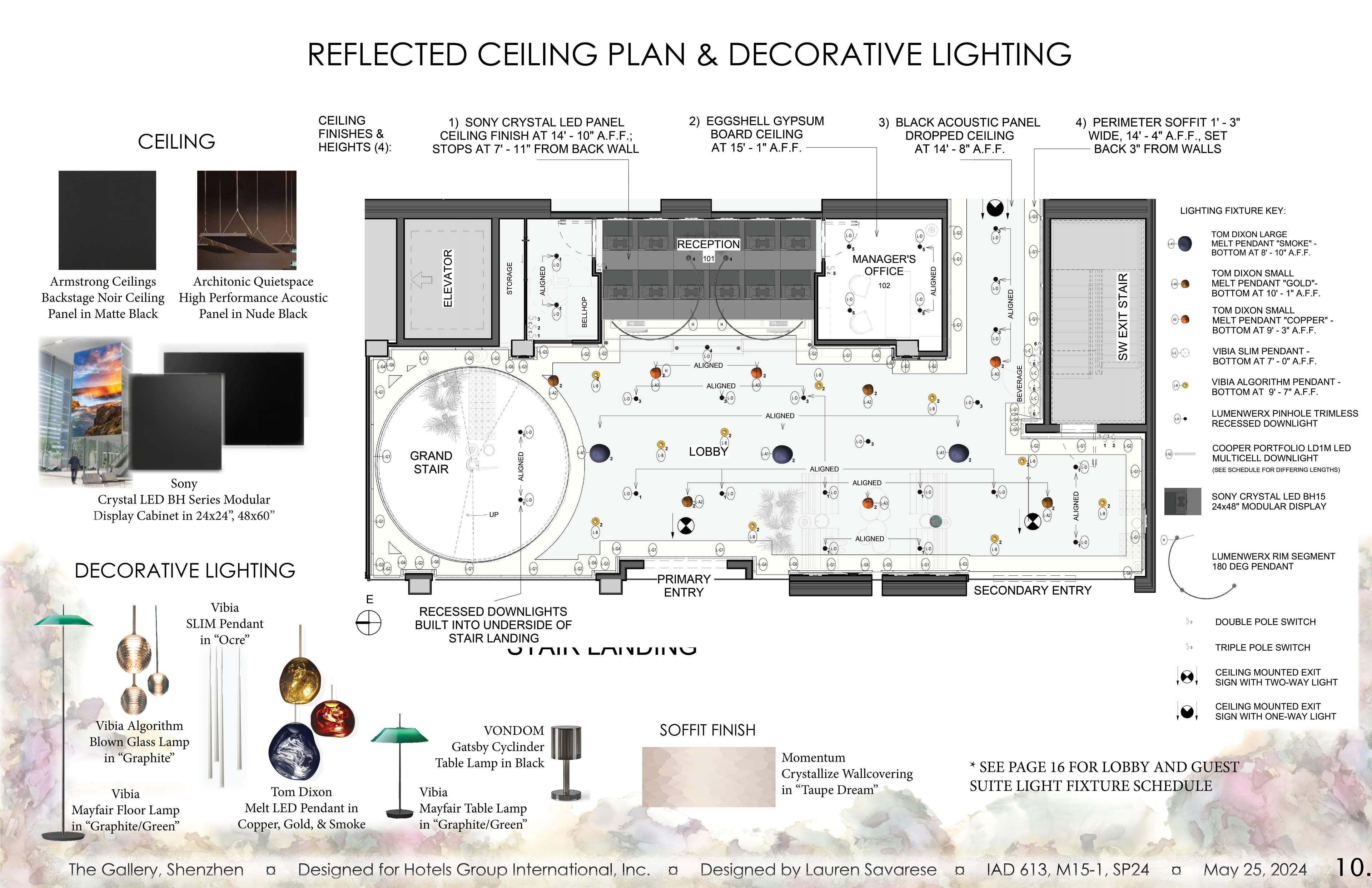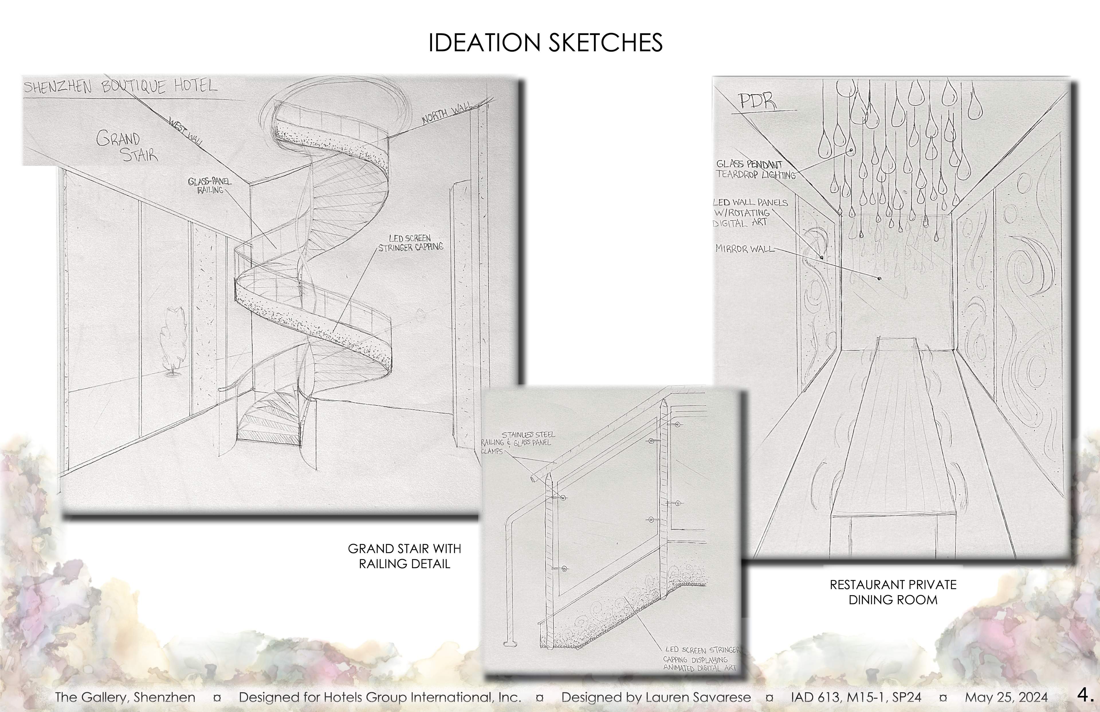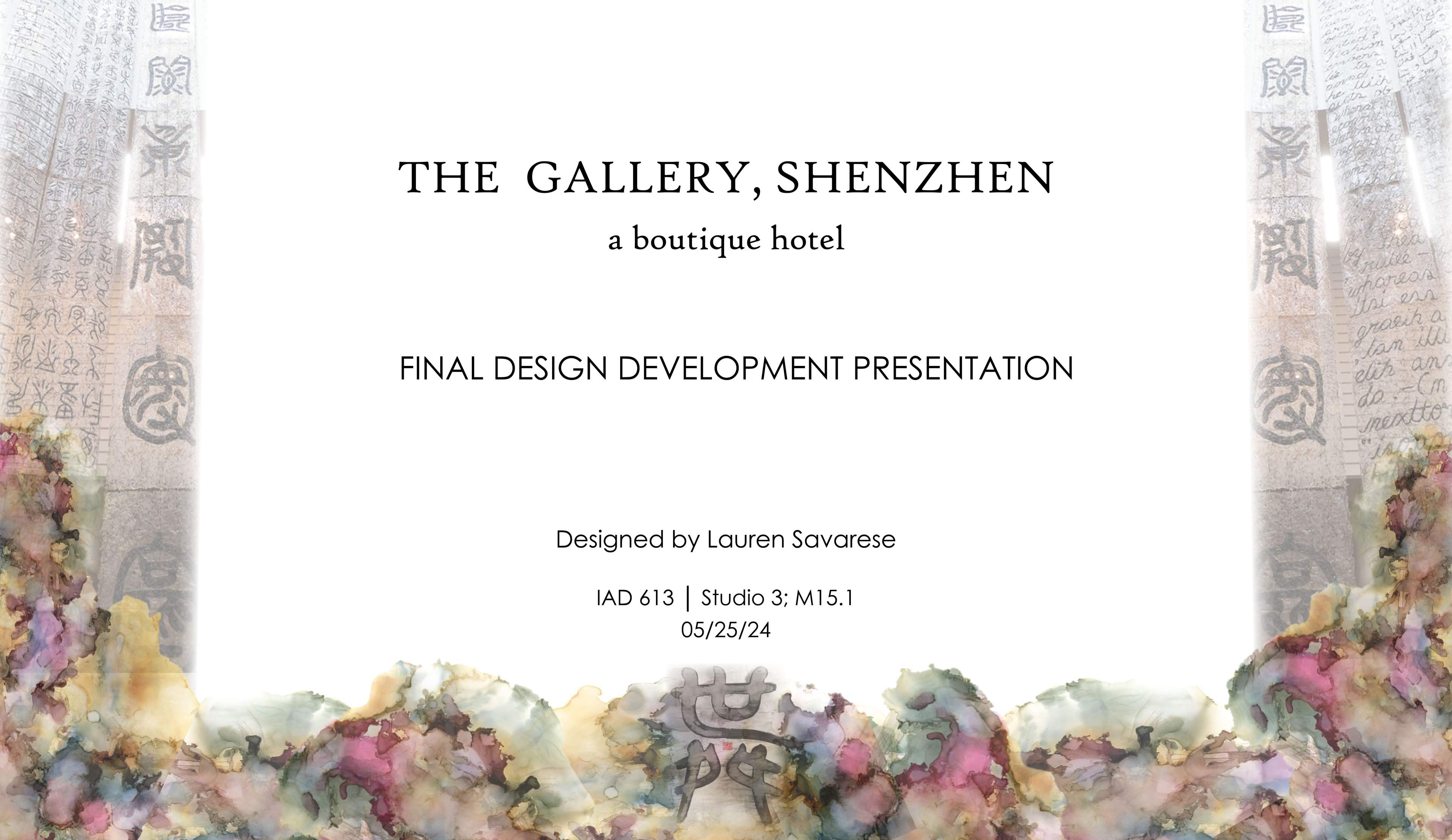 If desired, please reach out to request my full process book which includes all of the work that went behind the final design presentation, as well as more in-depth attention to areas outside of the lobby and guest suites of the hotel.