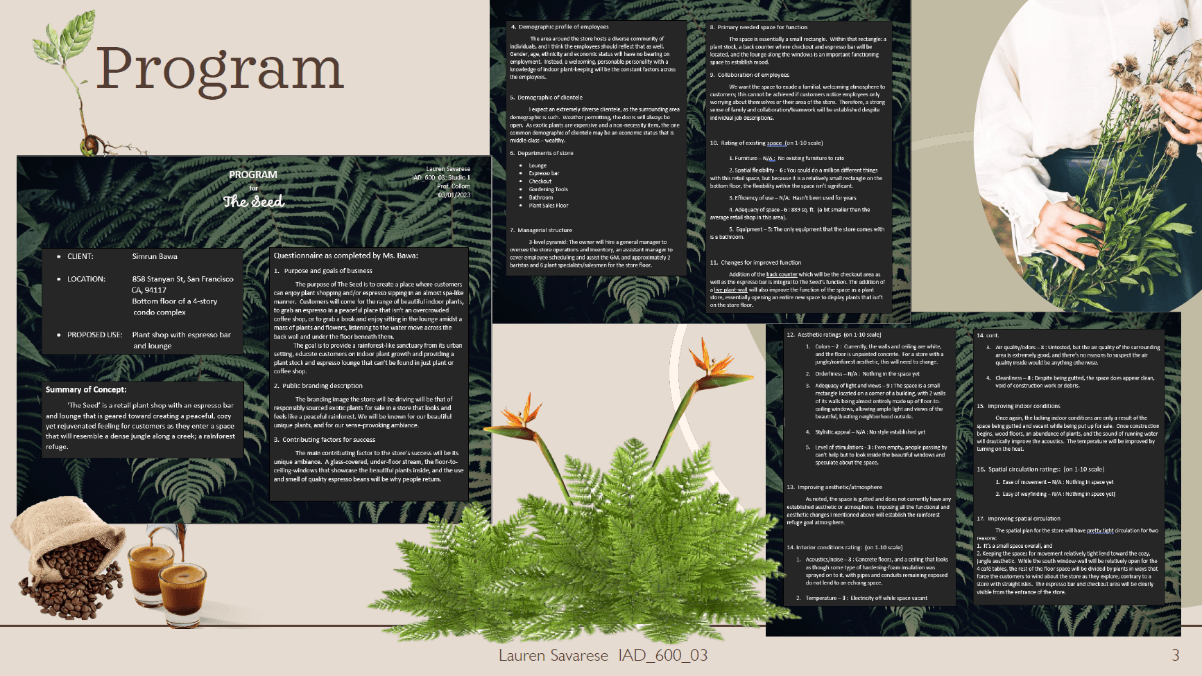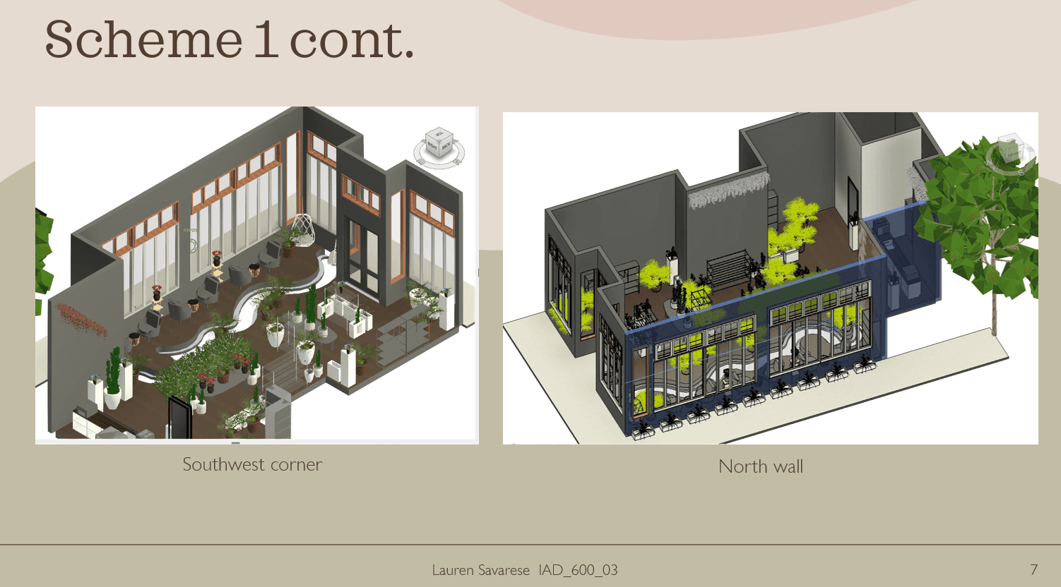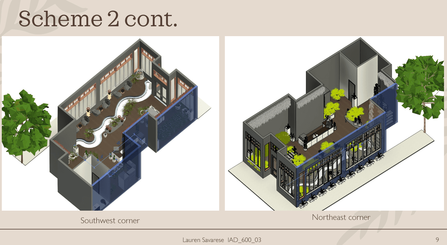 This project involves the design of a small plant shop with an espresso bar and lounge. The assignment objective was to select any real commercial space that I've personally frequented, and give it a successful re-design. The space I chose is a ground-floor corner of a small condo complex. The site is at the corner of two very busy streets in the Haight Ashbury district of San Francisco; close to the famous Golden Gate Park and lots of boutique shopping. With the advantage of starting with a totally gutted space, I was able to create this shop from start to finish; progressing through the first three steps of any design process (Programming, conceptual design, and schematic designs.) Revit renderings of my final schematic design are included.