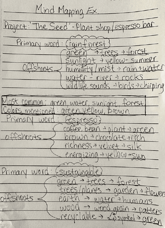 When developing a concept for a blank space, a 'mind mapping' exercise is helpful in generating different terms that relate to the function and aesthetic of space. This exercise can be seen at right, and the resulting concept statement can be seen below.