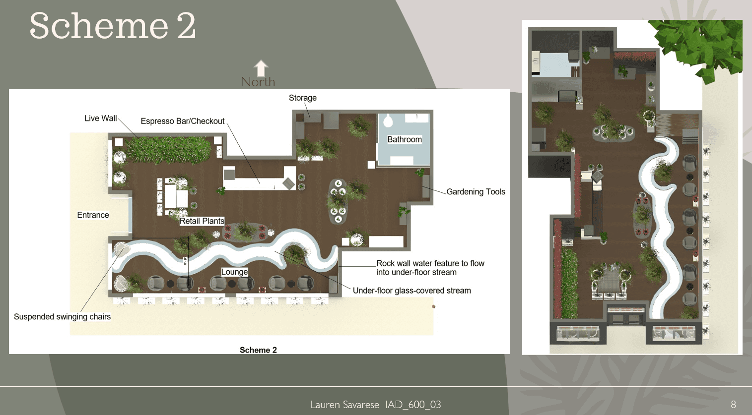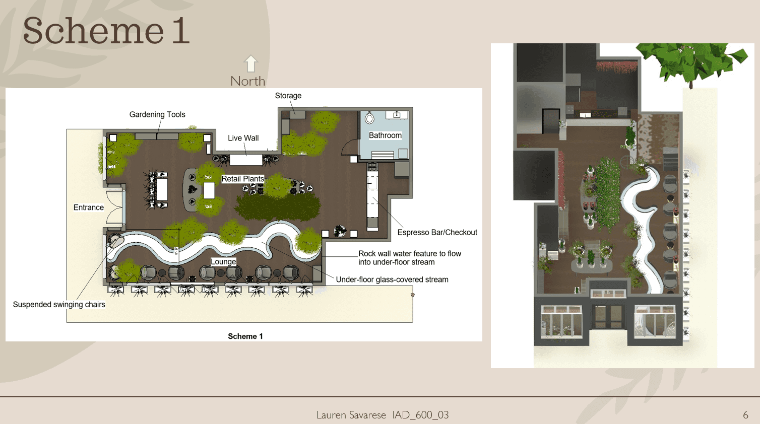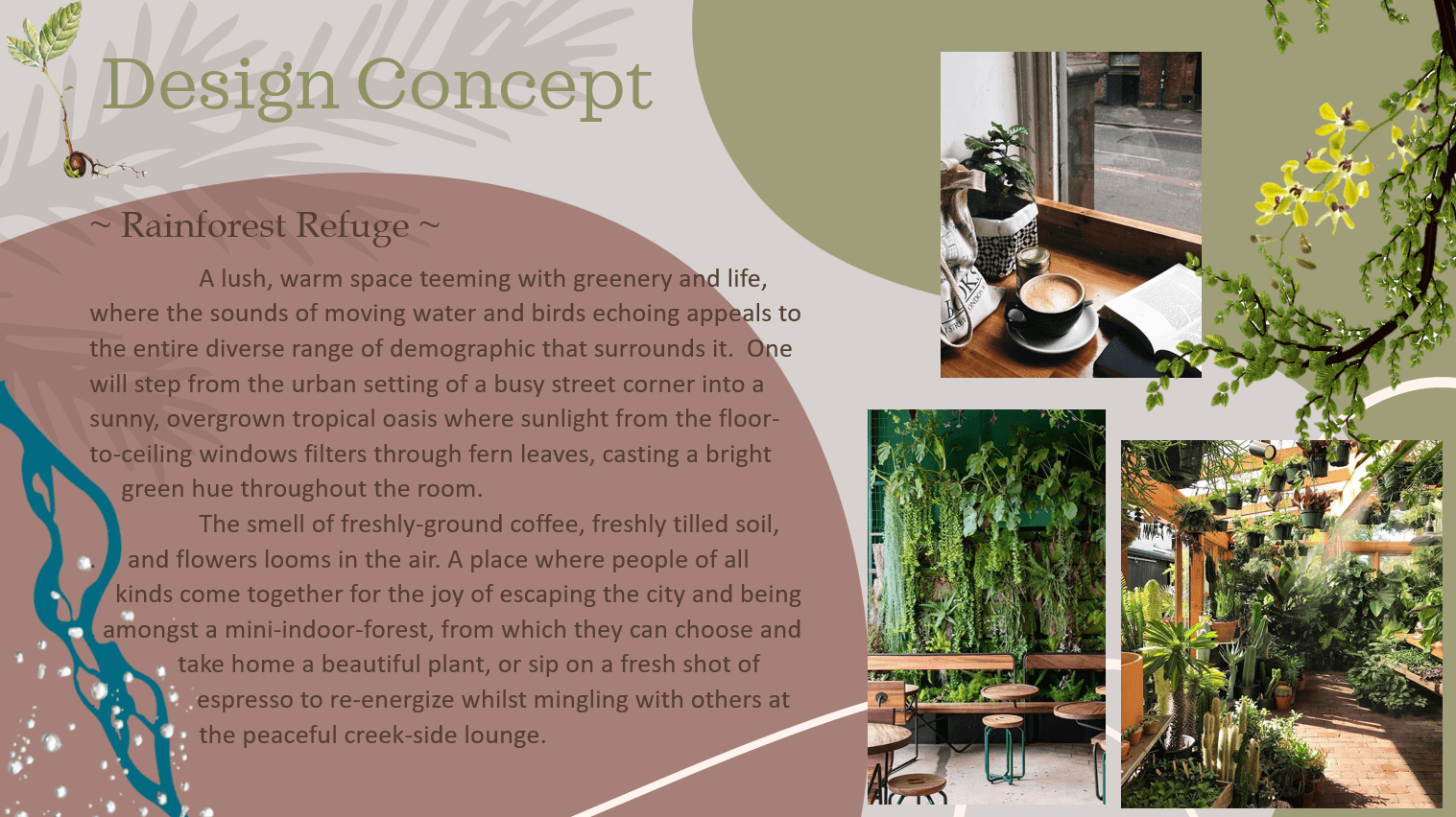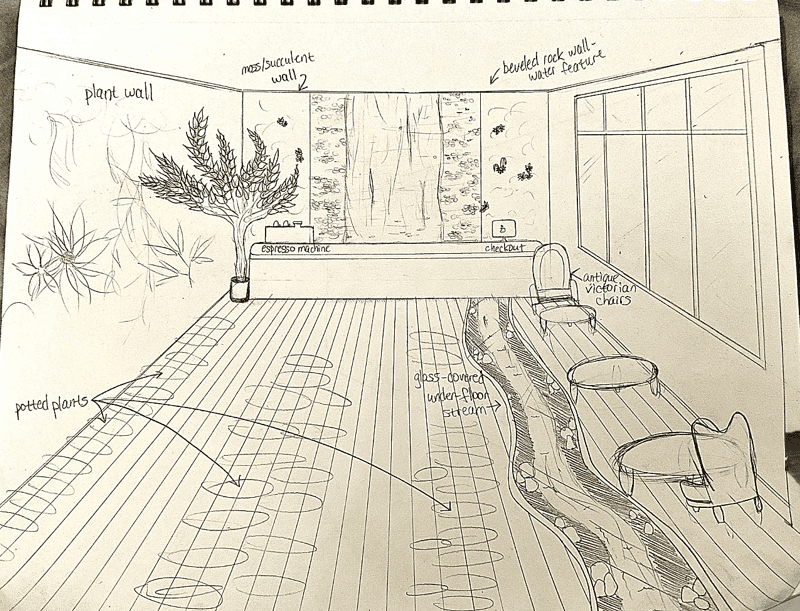 Based on my 'Rainforest Refuge' concept, I did a quick perspective sketch of the store detailing a rock wall water feature that flowed into a glass-covered under-floor stream, a lounge area by the windows, a live wall, and placement of the espresso counter and retail space.