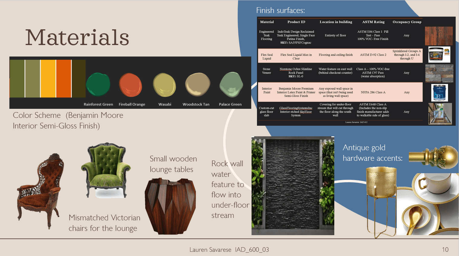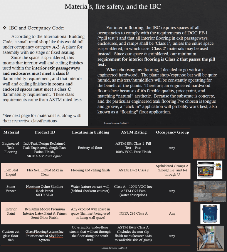 Before selecting materials, I had to establish what occupancy category the space would fall under in order to know what testing thresholds my various materials would have to meet.