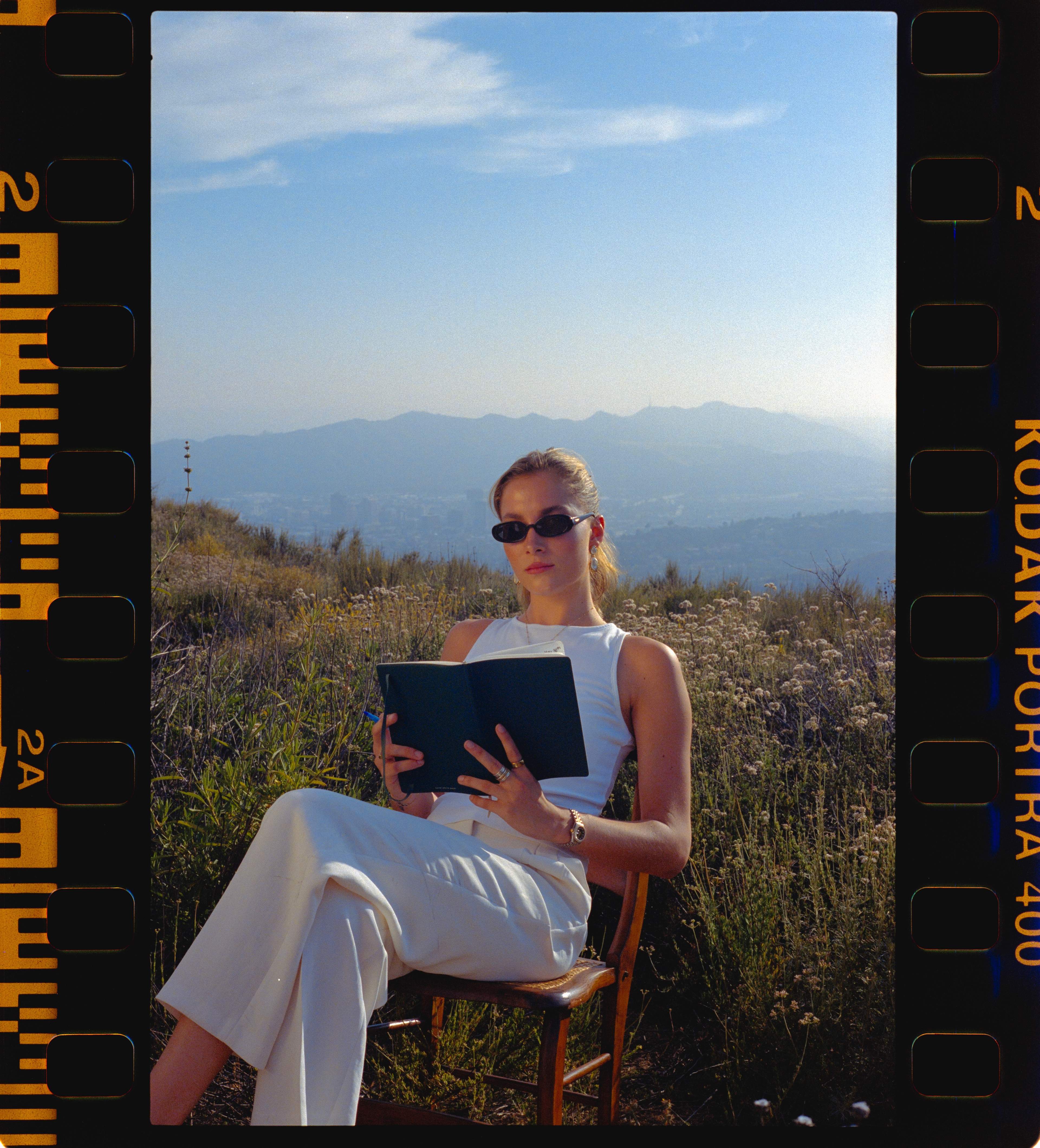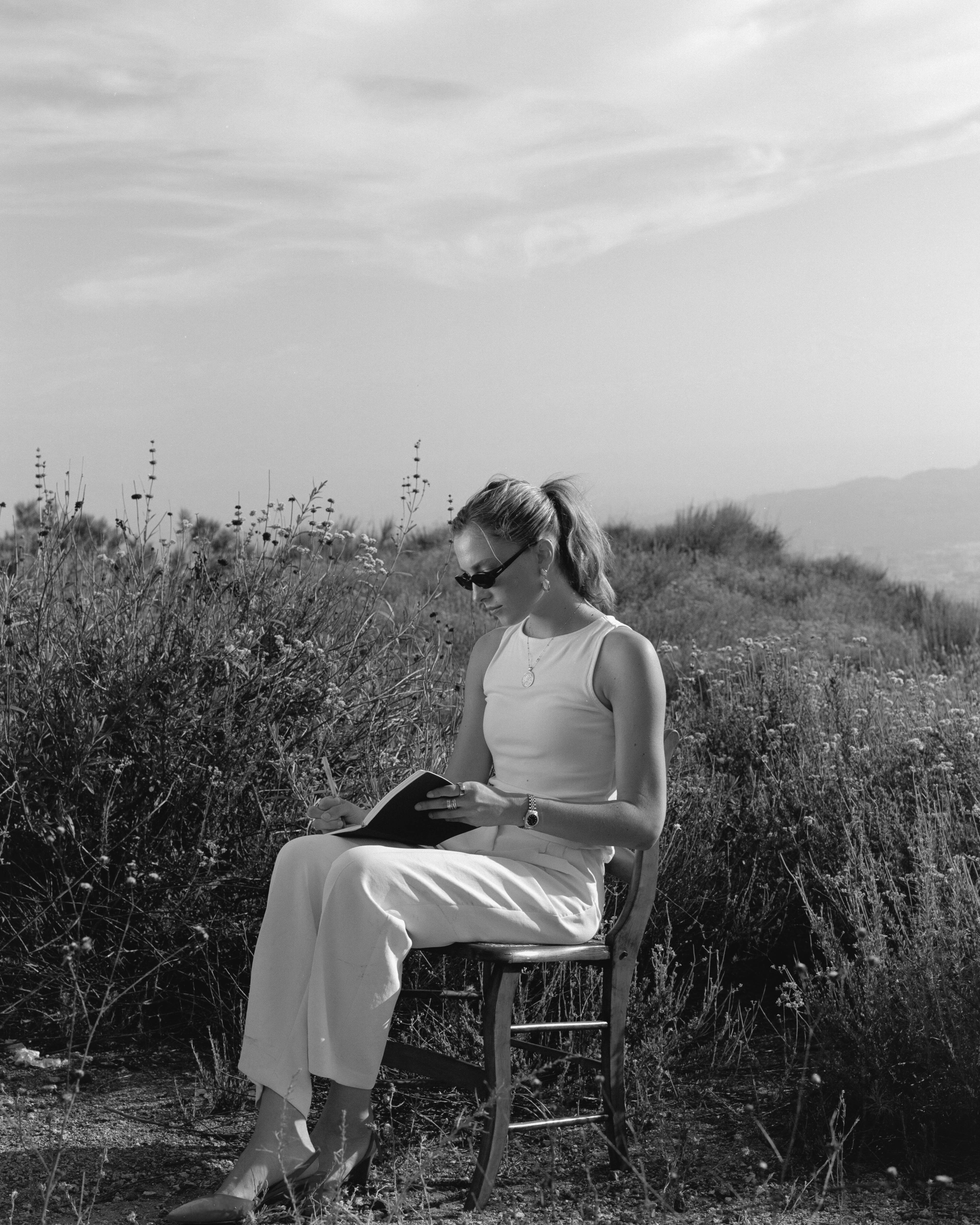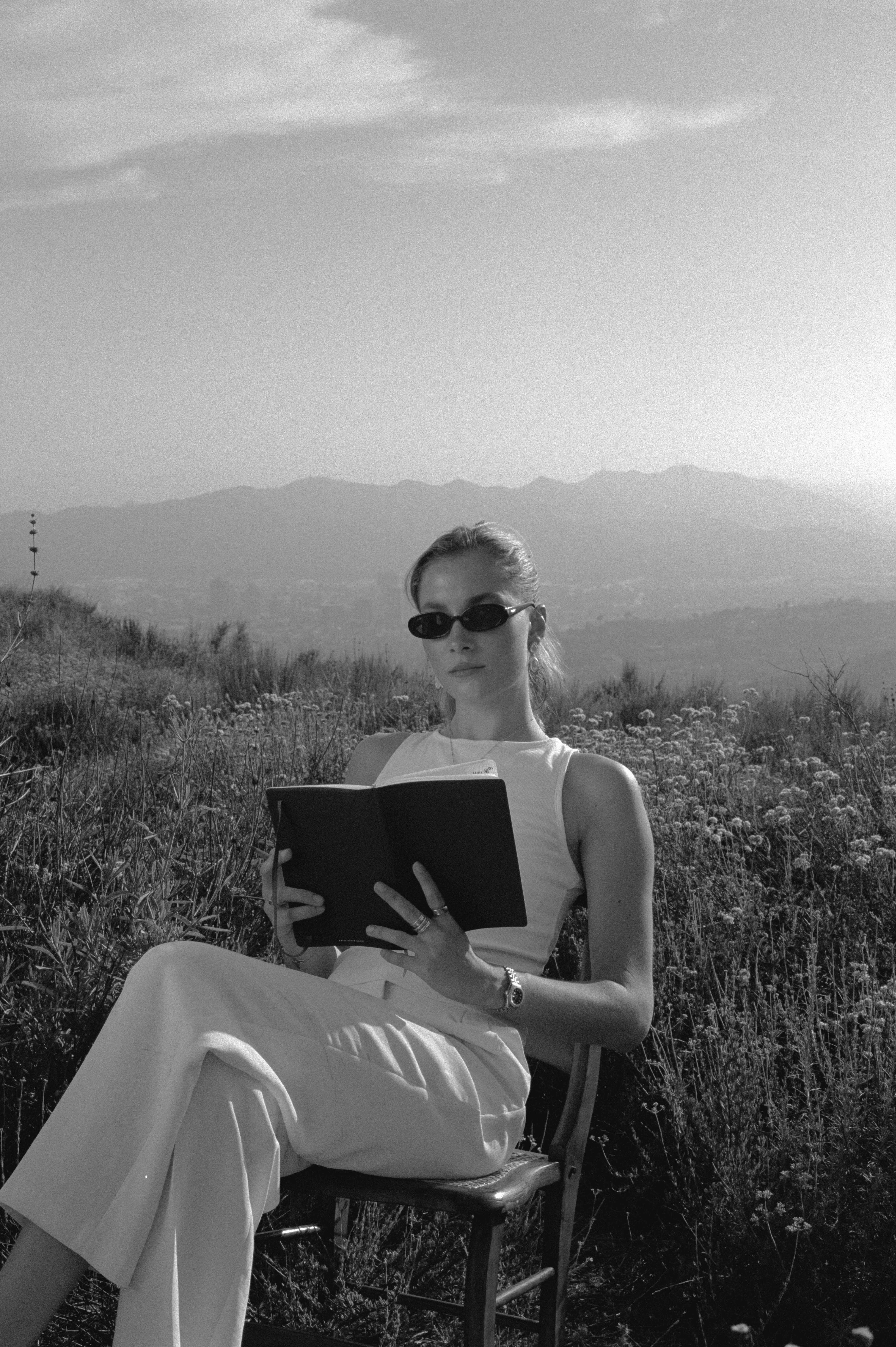 A woman seated gracefully in nature, poised yet grounded, embodies a rare balance of strength and serenity. Dressed in clean, elegant whites with a journal in hand, she radiates quiet confidence, bold but never boastful. Her presence is magnetic, luminous, as though she carries her own light into the world.
