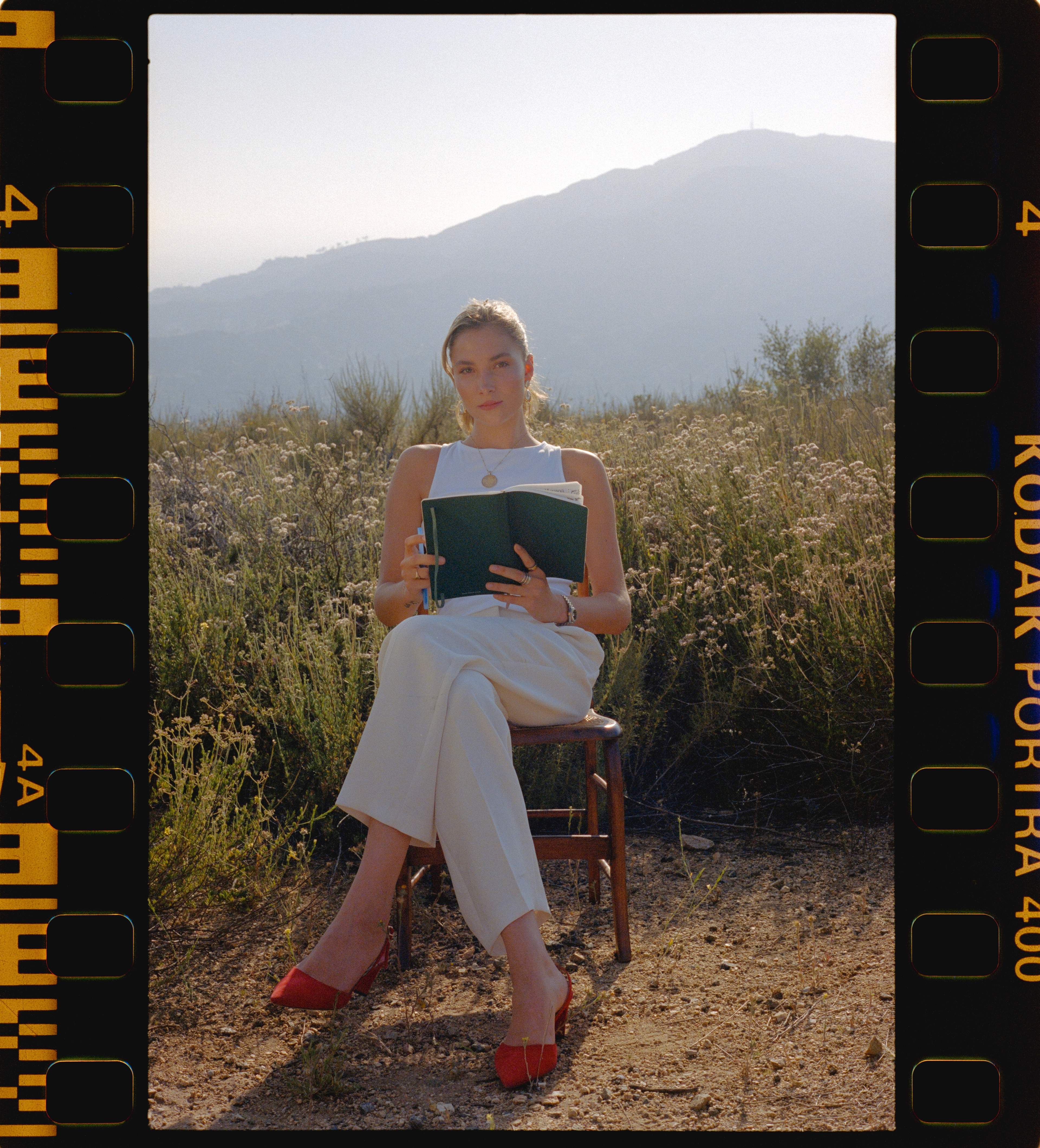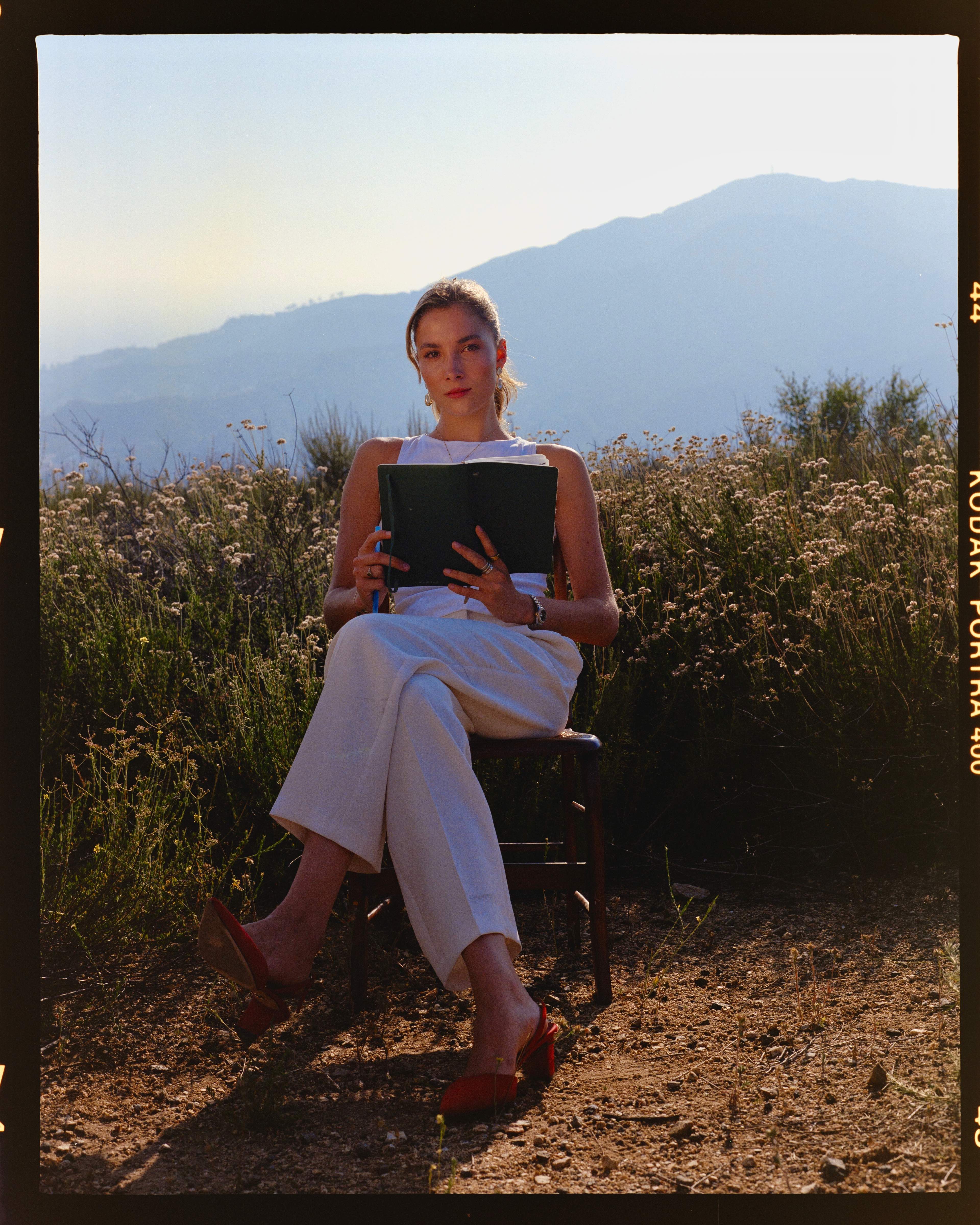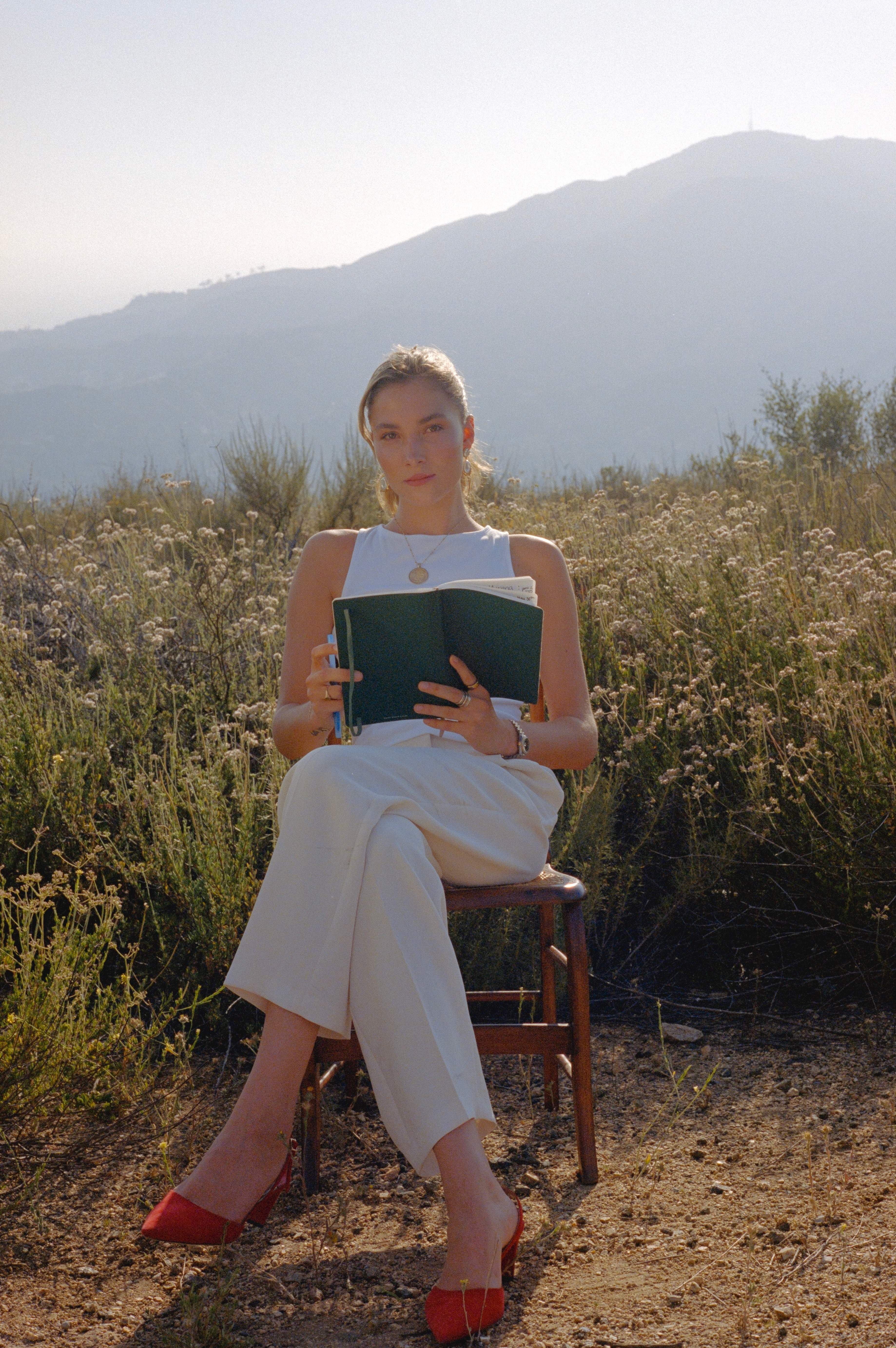 A woman seated gracefully in nature, poised yet grounded, embodies a rare balance of strength and serenity. Dressed in clean, elegant whites with a journal in hand, she radiates quiet confidence, bold but never boastful. Her presence is magnetic, luminous, as though she carries her own light into the world.