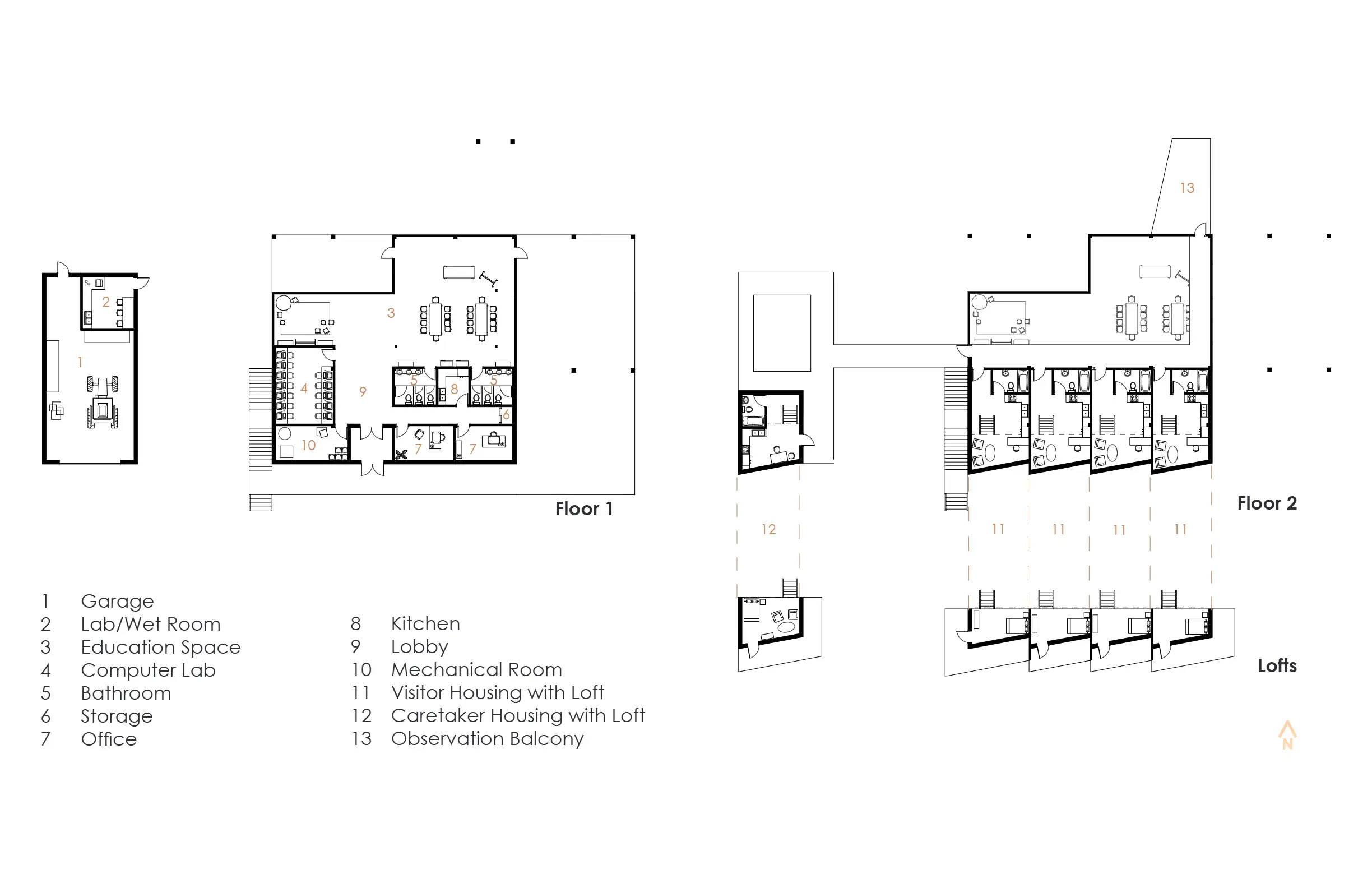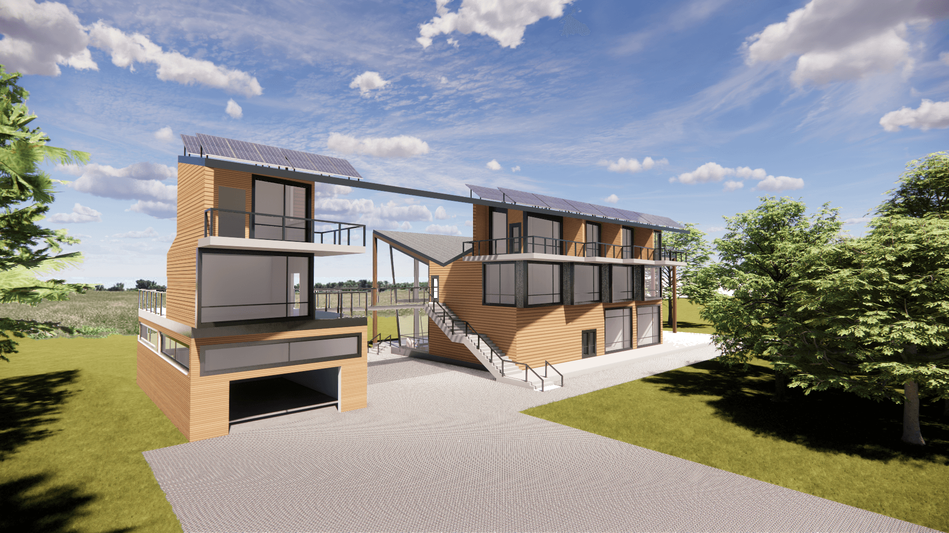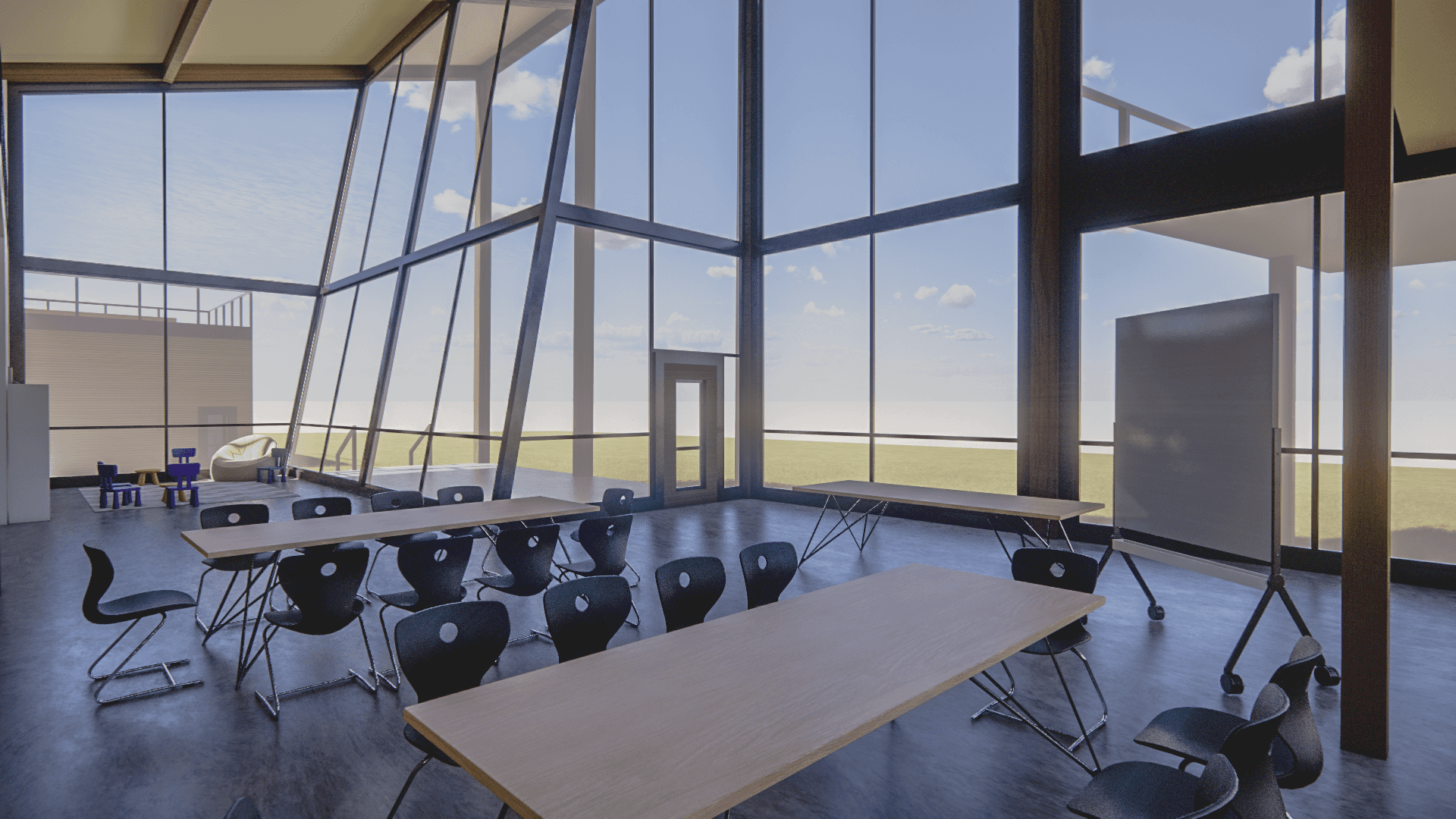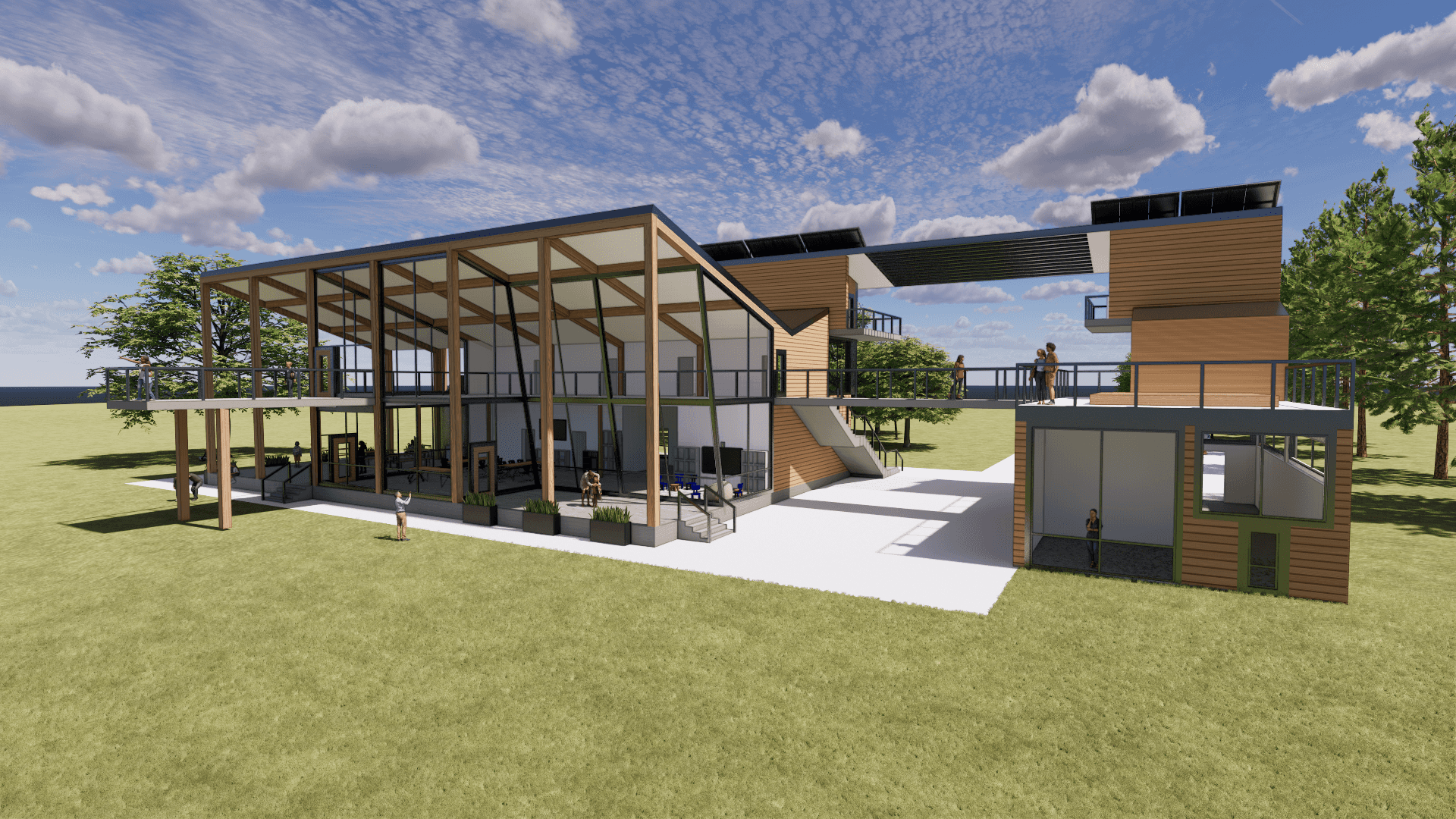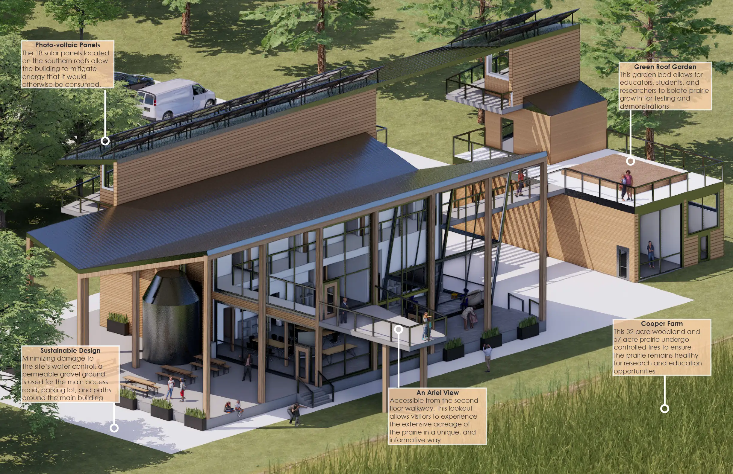Situated at Cooper Farm in Muncie, IN, this Environmental Center was designed for Ball State University. The university aims to utilize this facility to monitor and maintain the natural prairie, educate students, and facilitate scholarly research. This design emphasizes strong connections between the building and the surrounding landscape.